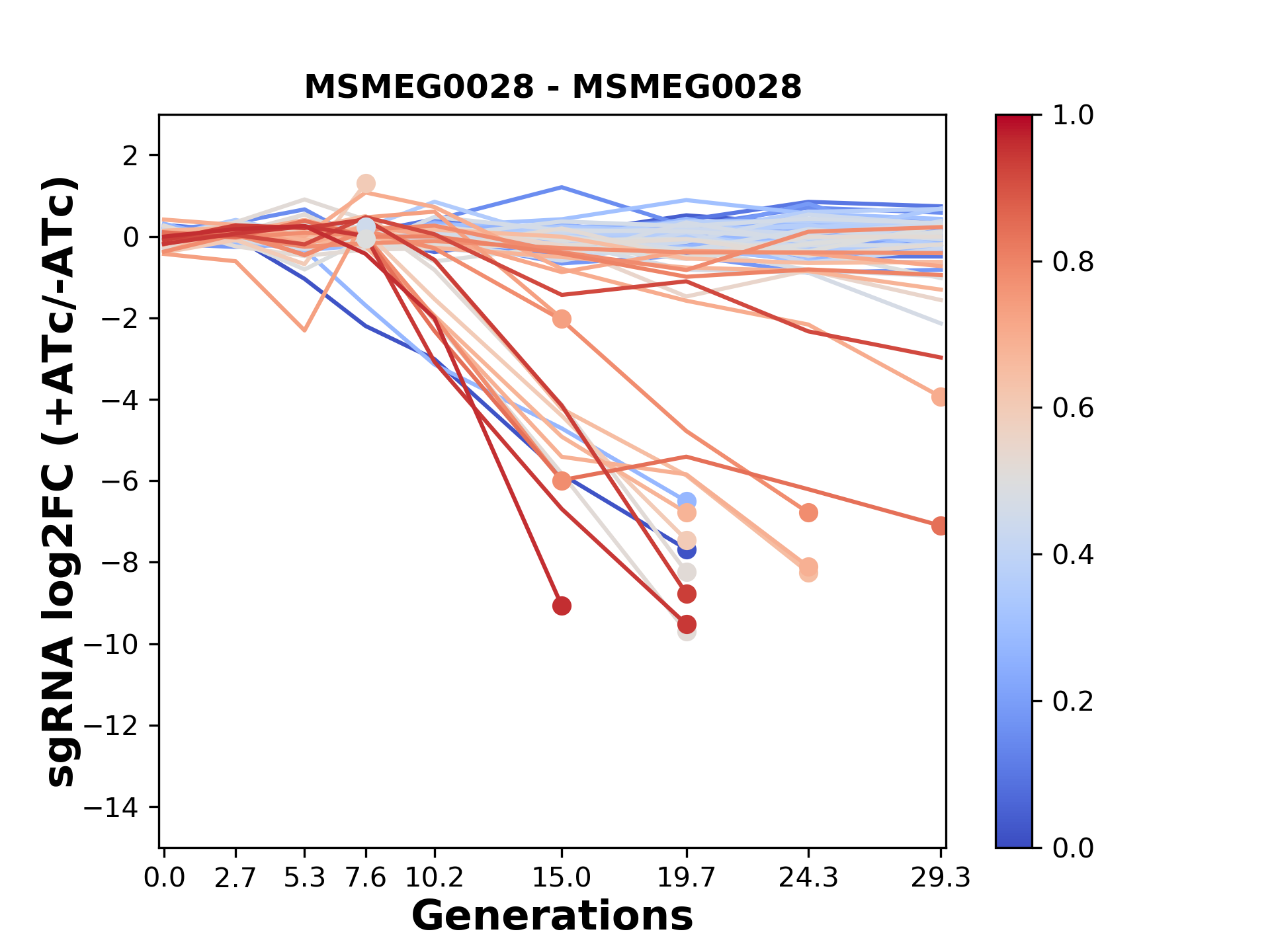 Here, we show sgRNA log2 fold-change values (L2FC) (plus versus minus ATc) over consecutive generations for sgRNAs targeting the gene you selected.