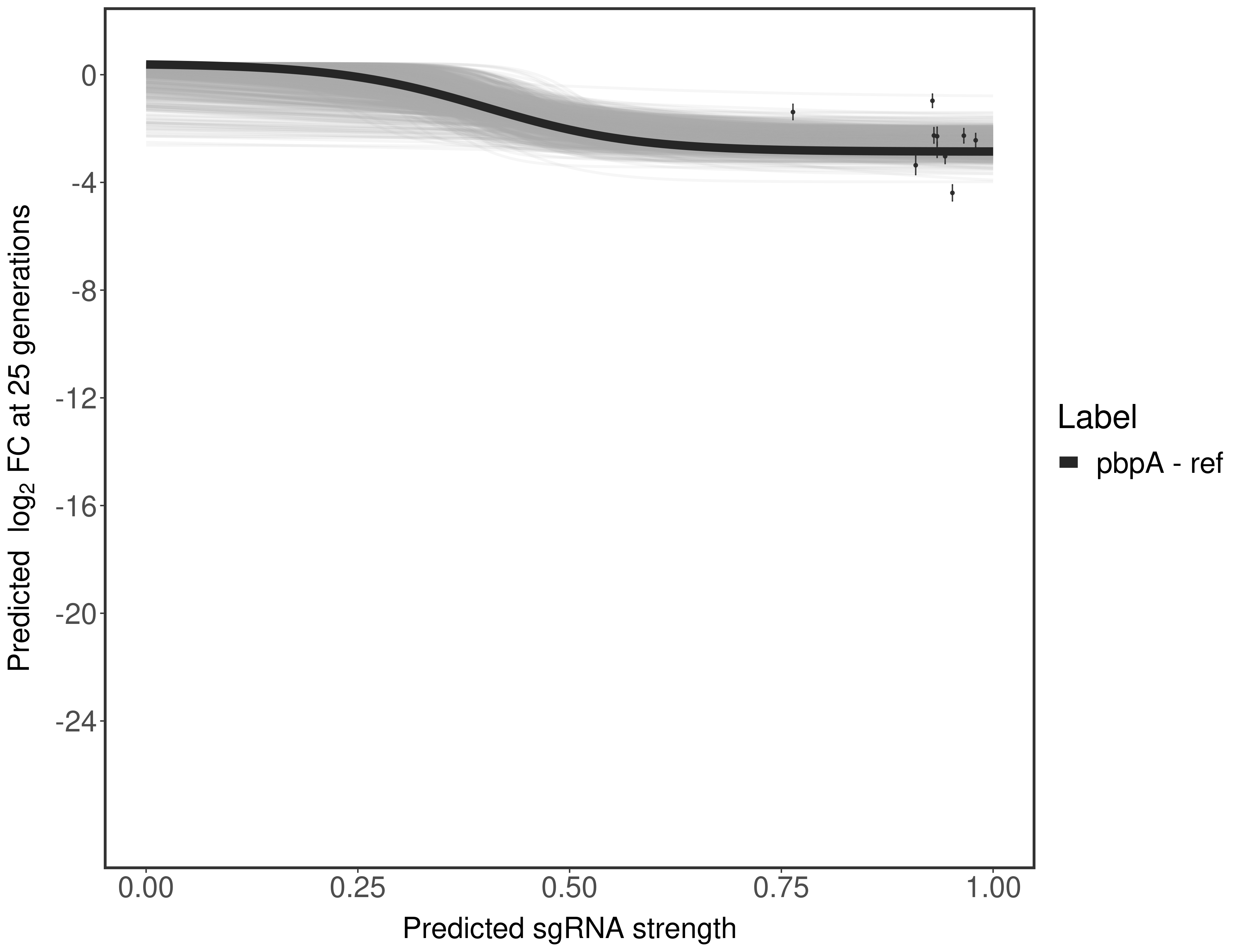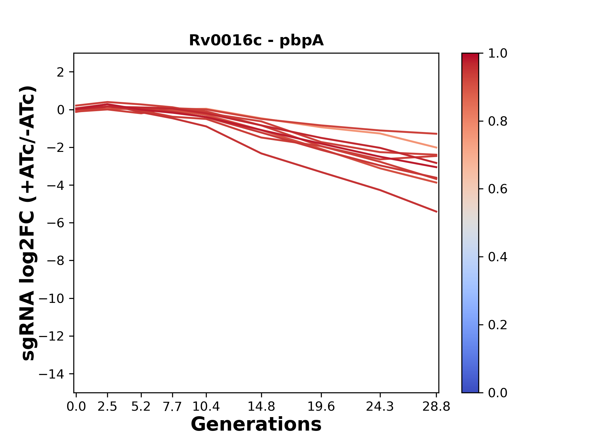 Experiment: We designed an M. tuberculosis CRISPRi library (RLC12) to target all annotated Mtb genes with single guide RNAs (sgRNAs) of varying predicted knockdown efficiencies. In parallel, we constructed a M. smegmatis CRISPRi library (RLC11) to target all annotated Msmeg genes, similar to the Mtb sgRNA library. RLC12 was transformed into M. tuberculosis H37Rv; RLC11 into M. smegmatis mc2-155. We passaged both CRISPRi libraries for nearly 30 generations in the presence or absence of the CRISPRi-inducer anhydrotetracycline (ATc). At the indicated timepoints, genomic DNA was harvested and the representation of individual sgRNAs was counted using Illumina sequencing. Here, we show sgRNA log2 fold-change values (L2FC) (plus versus minus ATc) over consecutive generations for sgRNAs targeting the gene you selected. sgRNAs are color-coded based on their predicted strength from blue (strength=0; weak) to red (strength=1; strong).