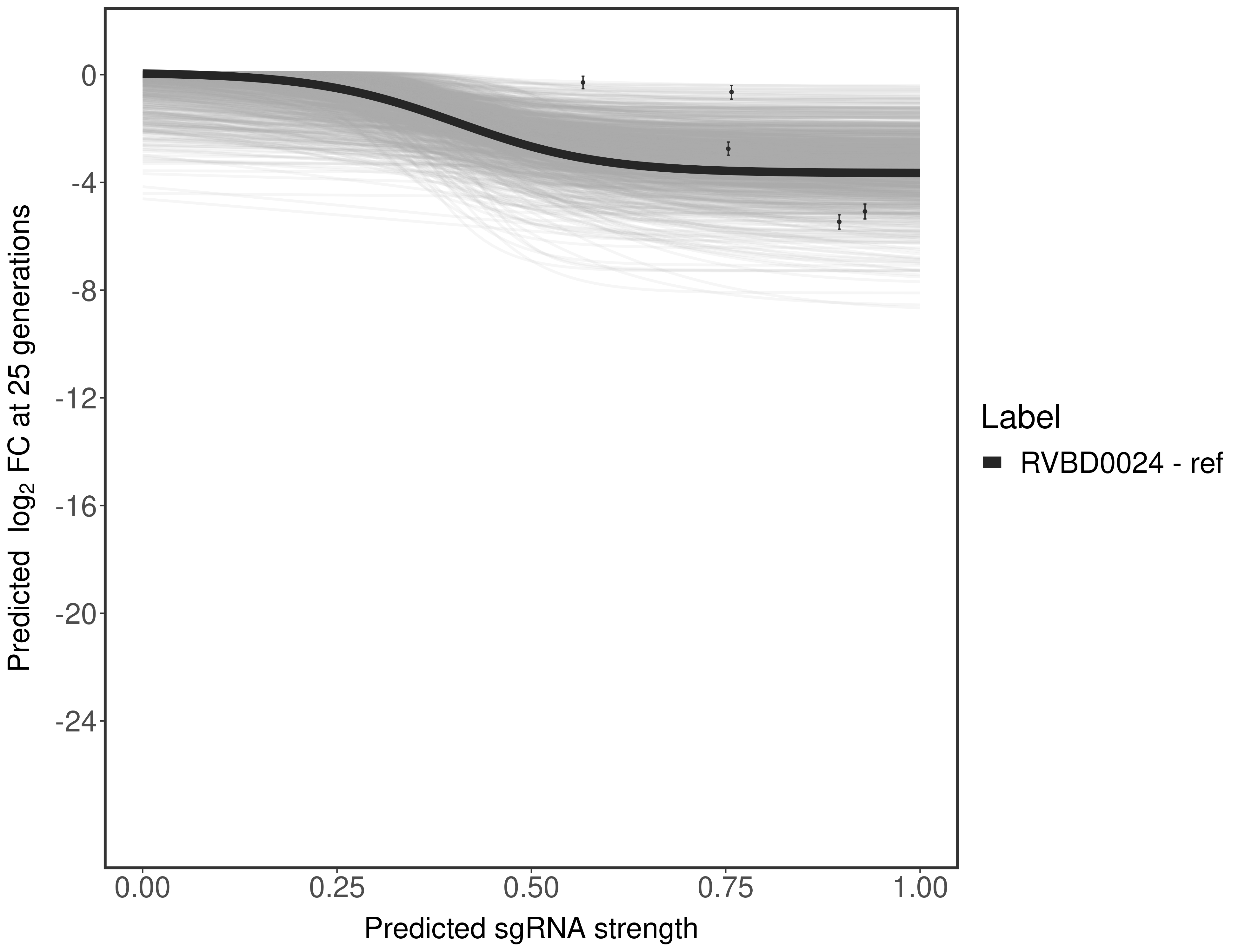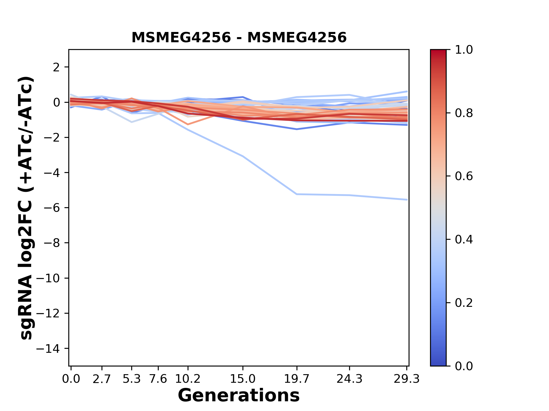 Experiment: We designed an M. tuberculosis CRISPRi library (RLC12) to target all annotated Mtb genes with single guide RNAs (sgRNAs) of varying predicted knockdown efficiencies. In parallel, we constructed a M. smegmatis CRISPRi library (RLC11) to target all annotated Msmeg genes, similar to the Mtb sgRNA library. RLC12 was transformed into M. tuberculosis H37Rv; RLC11 into M. smegmatis mc2-155. We passaged both CRISPRi libraries for nearly 30 generations in the presence or absence of the CRISPRi-inducer anhydrotetracycline (ATc). At the indicated timepoints, genomic DNA was harvested and the representation of individual sgRNAs was counted using Illumina sequencing. Here, we show sgRNA log2 fold-change values (L2FC) (plus versus minus ATc) over consecutive generations for sgRNAs targeting the gene you selected. sgRNAs are color-coded based on their predicted strength from blue (strength=0; weak) to red (strength=1; strong).