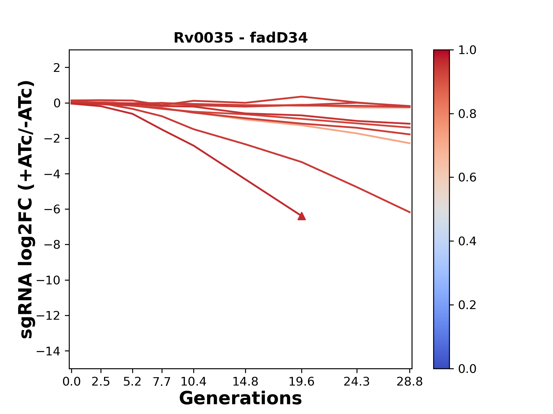 Here, we show sgRNA log2 fold-change values (L2FC) (plus versus minus ATc) over consecutive generations for sgRNAs targeting the gene you selected.