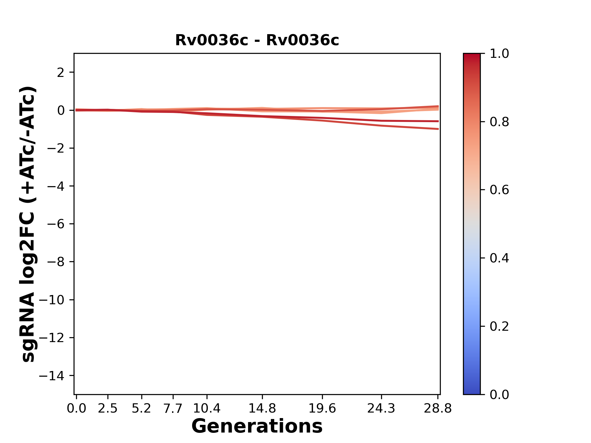 Here, we show sgRNA log2 fold-change values (L2FC) (plus versus minus ATc) over consecutive generations for sgRNAs targeting the gene you selected.