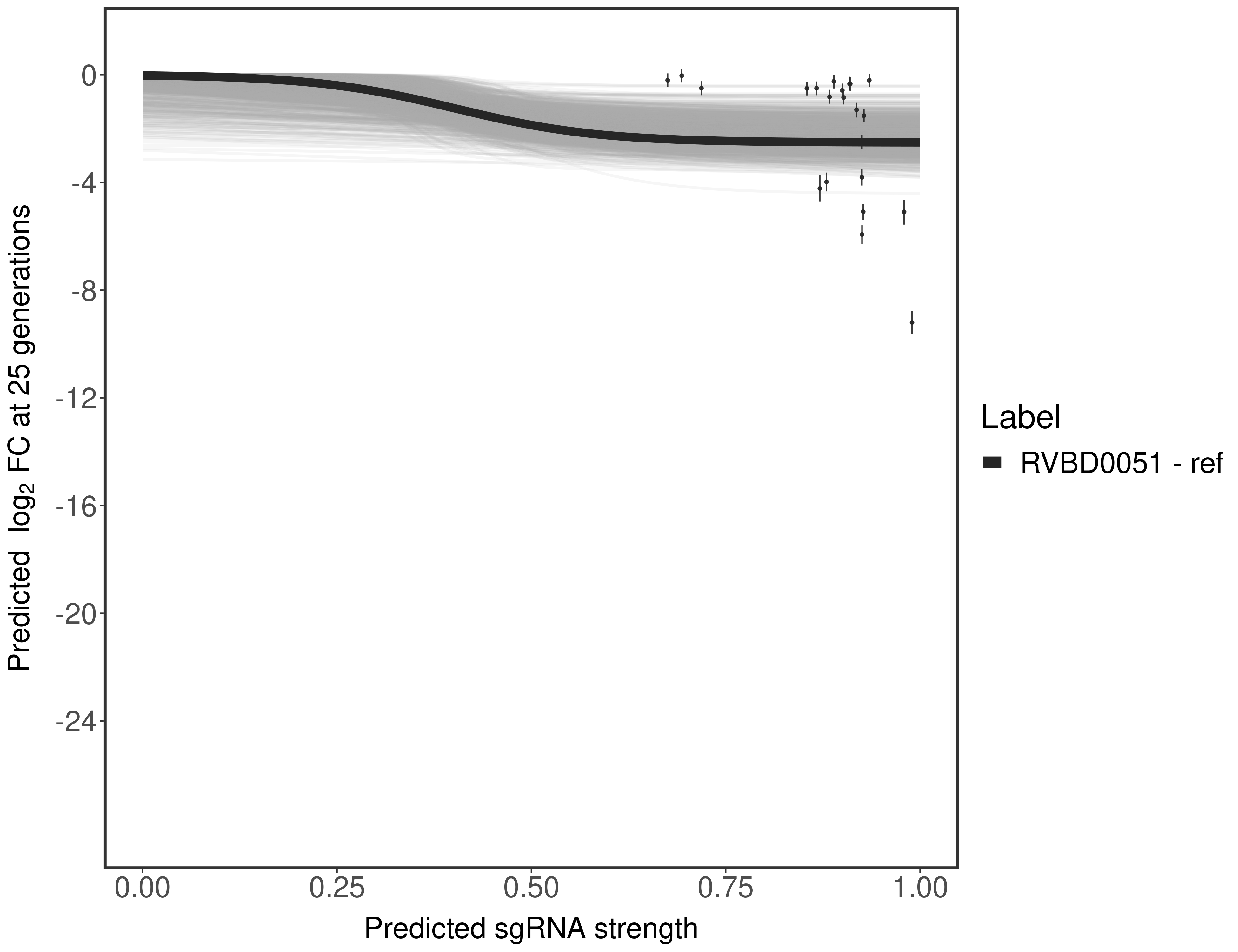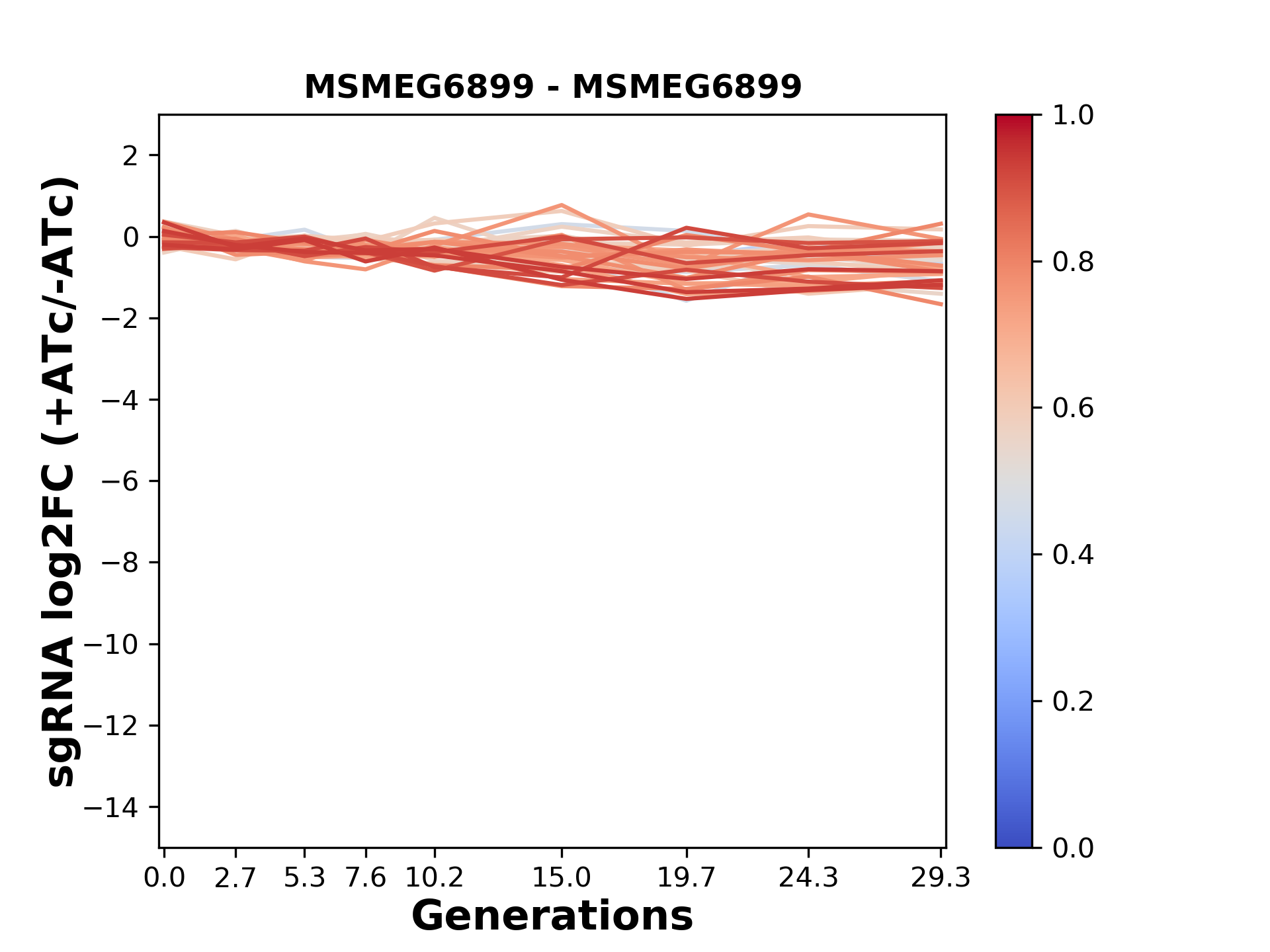 Experiment: We designed an M. tuberculosis CRISPRi library (RLC12) to target all annotated Mtb genes with single guide RNAs (sgRNAs) of varying predicted knockdown efficiencies. In parallel, we constructed a M. smegmatis CRISPRi library (RLC11) to target all annotated Msmeg genes, similar to the Mtb sgRNA library. RLC12 was transformed into M. tuberculosis H37Rv; RLC11 into M. smegmatis mc2-155. We passaged both CRISPRi libraries for nearly 30 generations in the presence or absence of the CRISPRi-inducer anhydrotetracycline (ATc). At the indicated timepoints, genomic DNA was harvested and the representation of individual sgRNAs was counted using Illumina sequencing. Here, we show sgRNA log2 fold-change values (L2FC) (plus versus minus ATc) over consecutive generations for sgRNAs targeting the gene you selected. sgRNAs are color-coded based on their predicted strength from blue (strength=0; weak) to red (strength=1; strong).