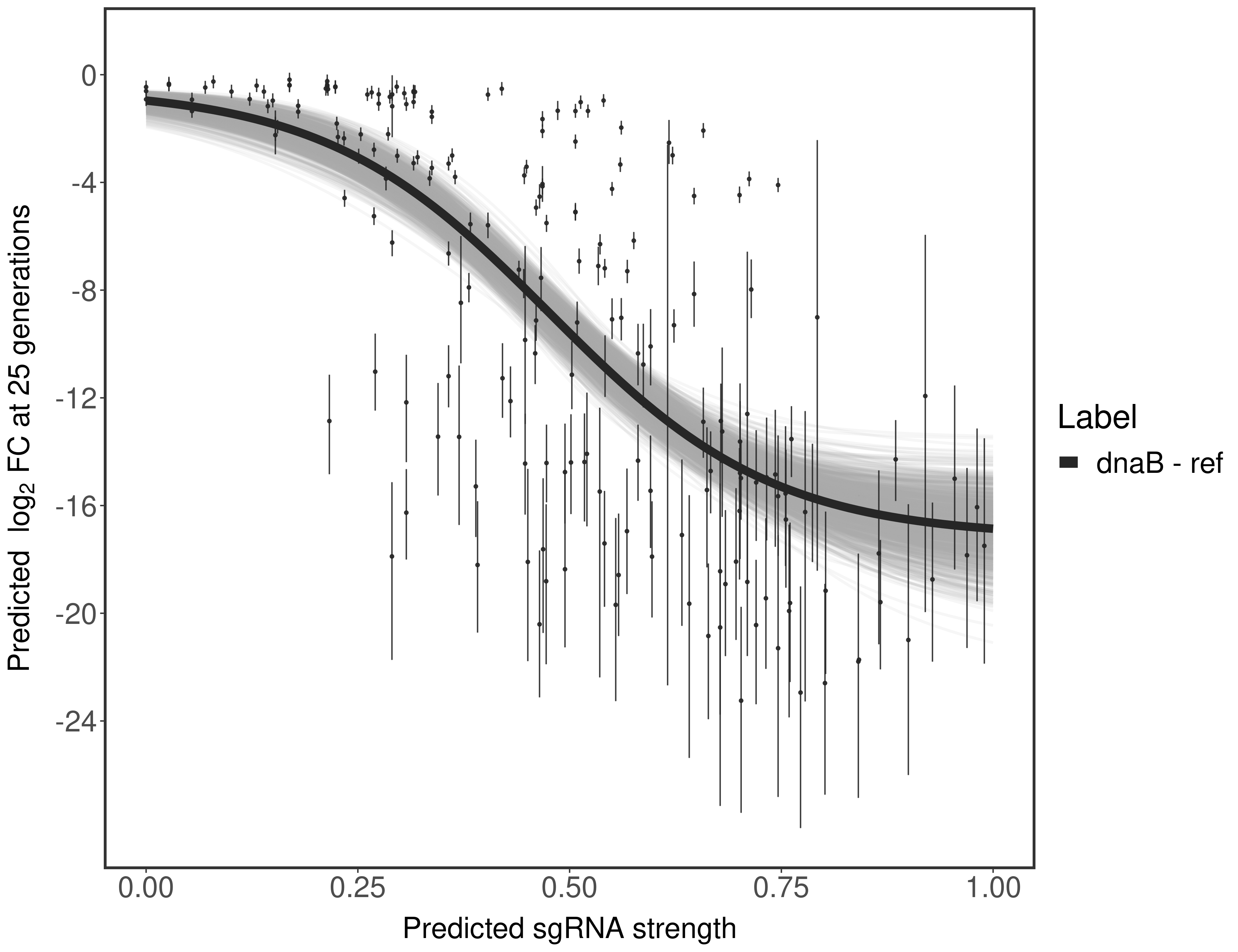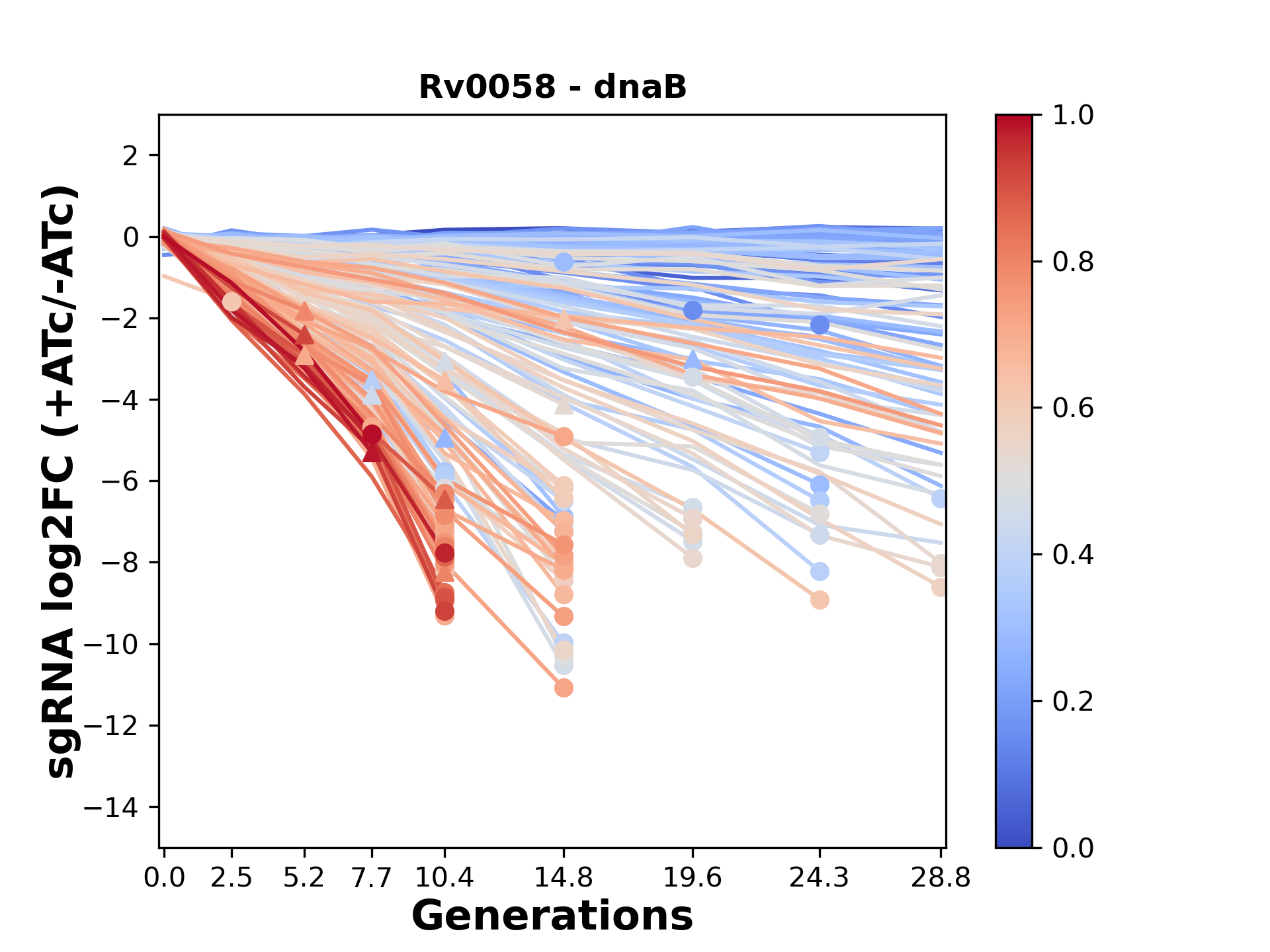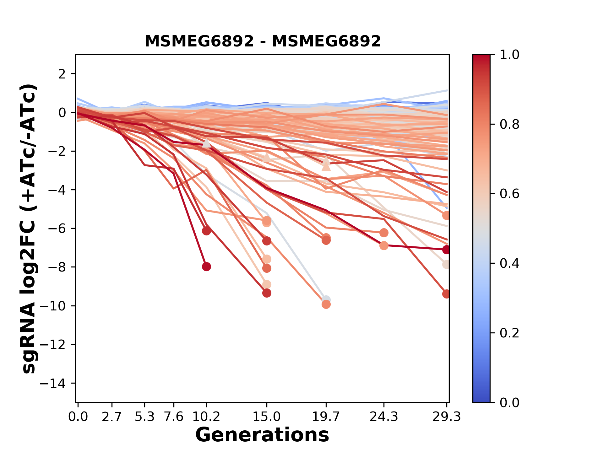 Here, we show sgRNA log2 fold-change values (L2FC) (plus versus minus ATc) over consecutive generations for sgRNAs targeting the gene you selected.