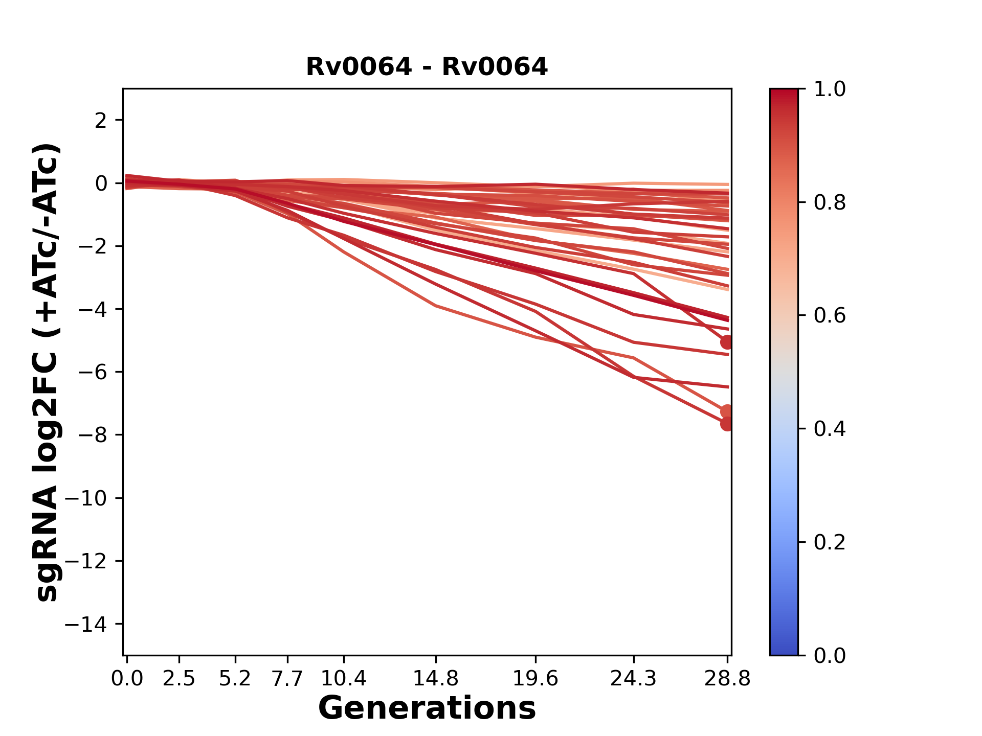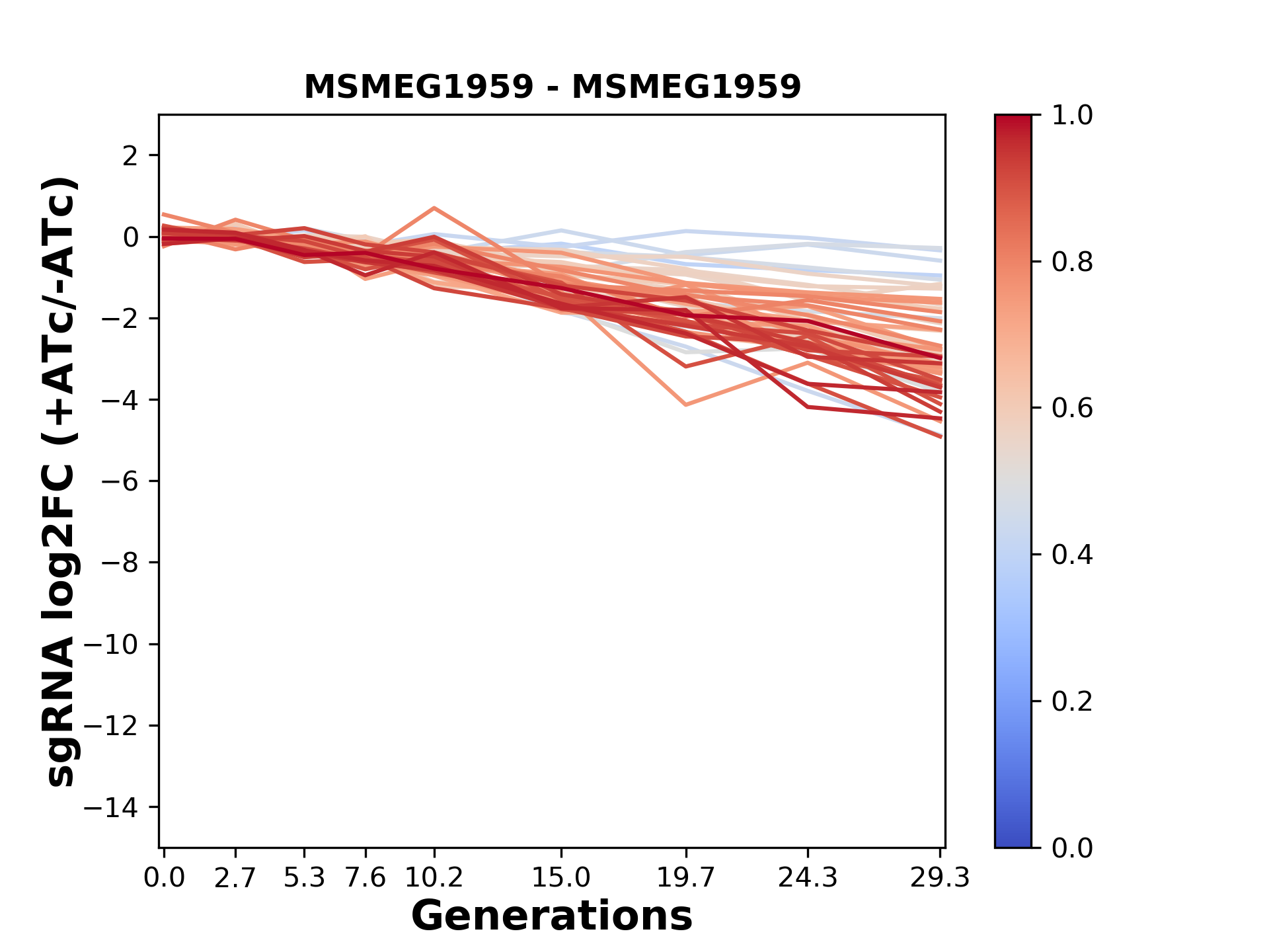 Here, we show sgRNA log2 fold-change values (L2FC) (plus versus minus ATc) over consecutive generations for sgRNAs targeting the gene you selected.