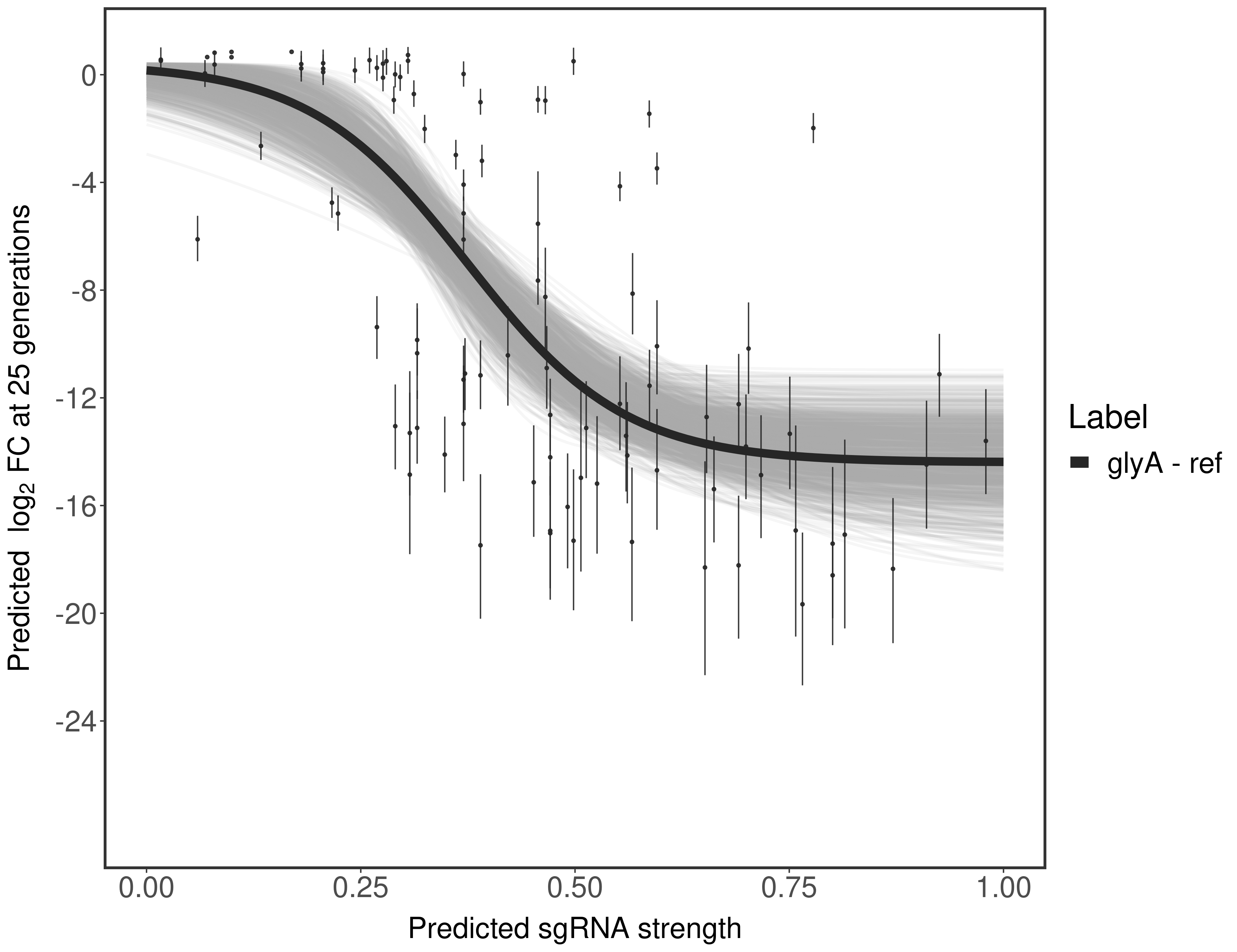 Experiment: We designed an M. tuberculosis CRISPRi library (RLC12) to target all annotated Mtb genes with single guide RNAs (sgRNAs) of varying predicted knockdown efficiencies. In parallel, we constructed a M. smegmatis CRISPRi library (RLC11) to target all annotated Msmeg genes, similar to the Mtb sgRNA library. RLC12 was transformed into M. tuberculosis H37Rv; RLC11 into M. smegmatis mc2-155. We passaged both CRISPRi libraries for nearly 30 generations in the presence or absence of the CRISPRi-inducer anhydrotetracycline (ATc). At the indicated timepoints, genomic DNA was harvested and the representation of individual sgRNAs was counted using Illumina sequencing. Here, we show sgRNA log2 fold-change values (L2FC) (plus versus minus ATc) over consecutive generations for sgRNAs targeting the gene you selected. sgRNAs are color-coded based on their predicted strength from blue (strength=0; weak) to red (strength=1; strong).