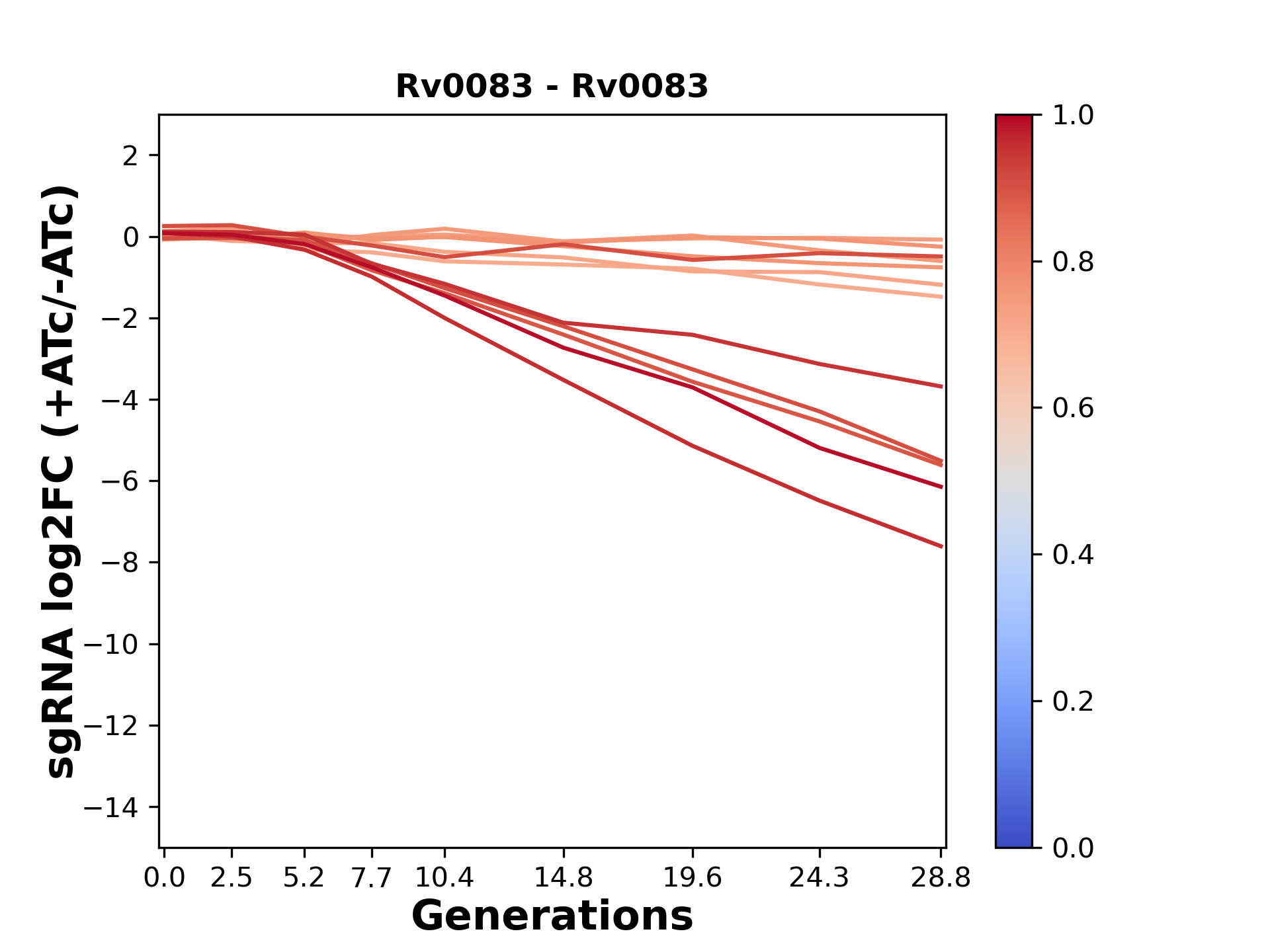 Here, we show sgRNA log2 fold-change values (L2FC) (plus versus minus ATc) over consecutive generations for sgRNAs targeting the gene you selected.