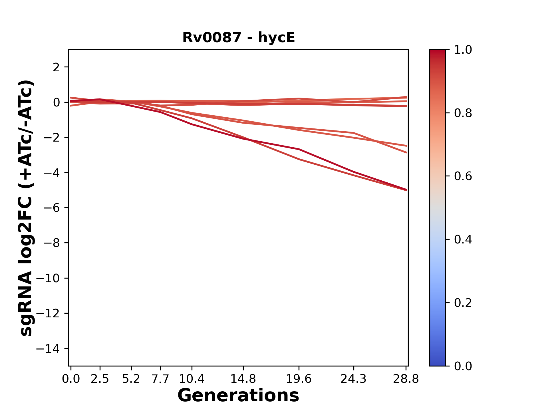 Here, we show sgRNA log2 fold-change values (L2FC) (plus versus minus ATc) over consecutive generations for sgRNAs targeting the gene you selected.