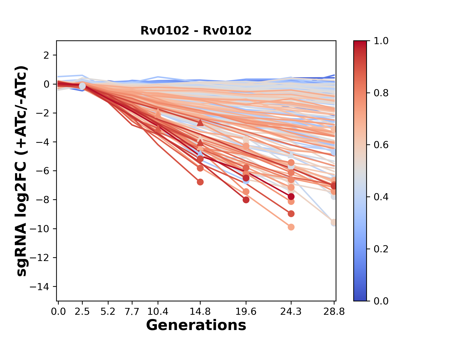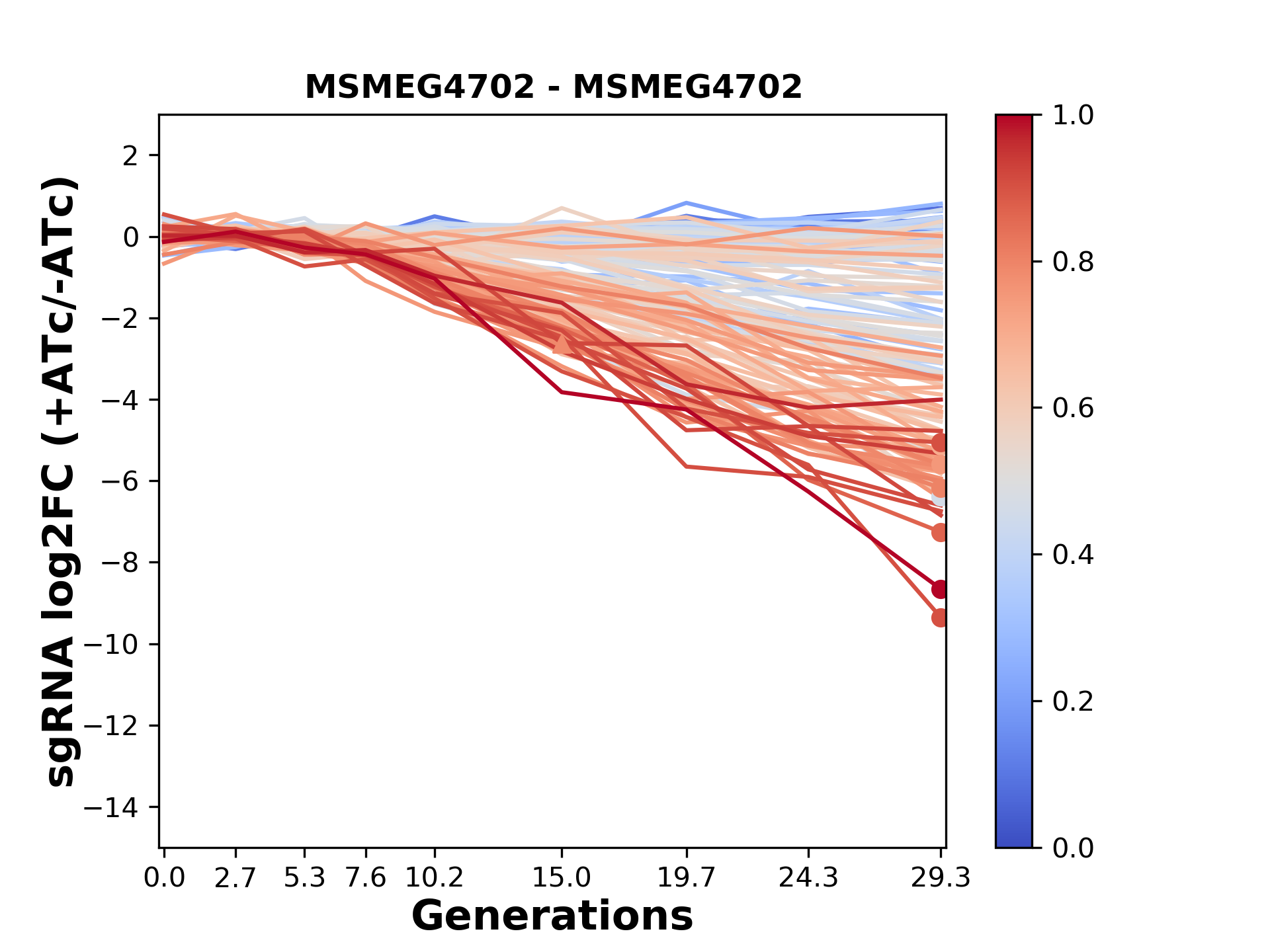 Here, we show sgRNA log2 fold-change values (L2FC) (plus versus minus ATc) over consecutive generations for sgRNAs targeting the gene you selected.