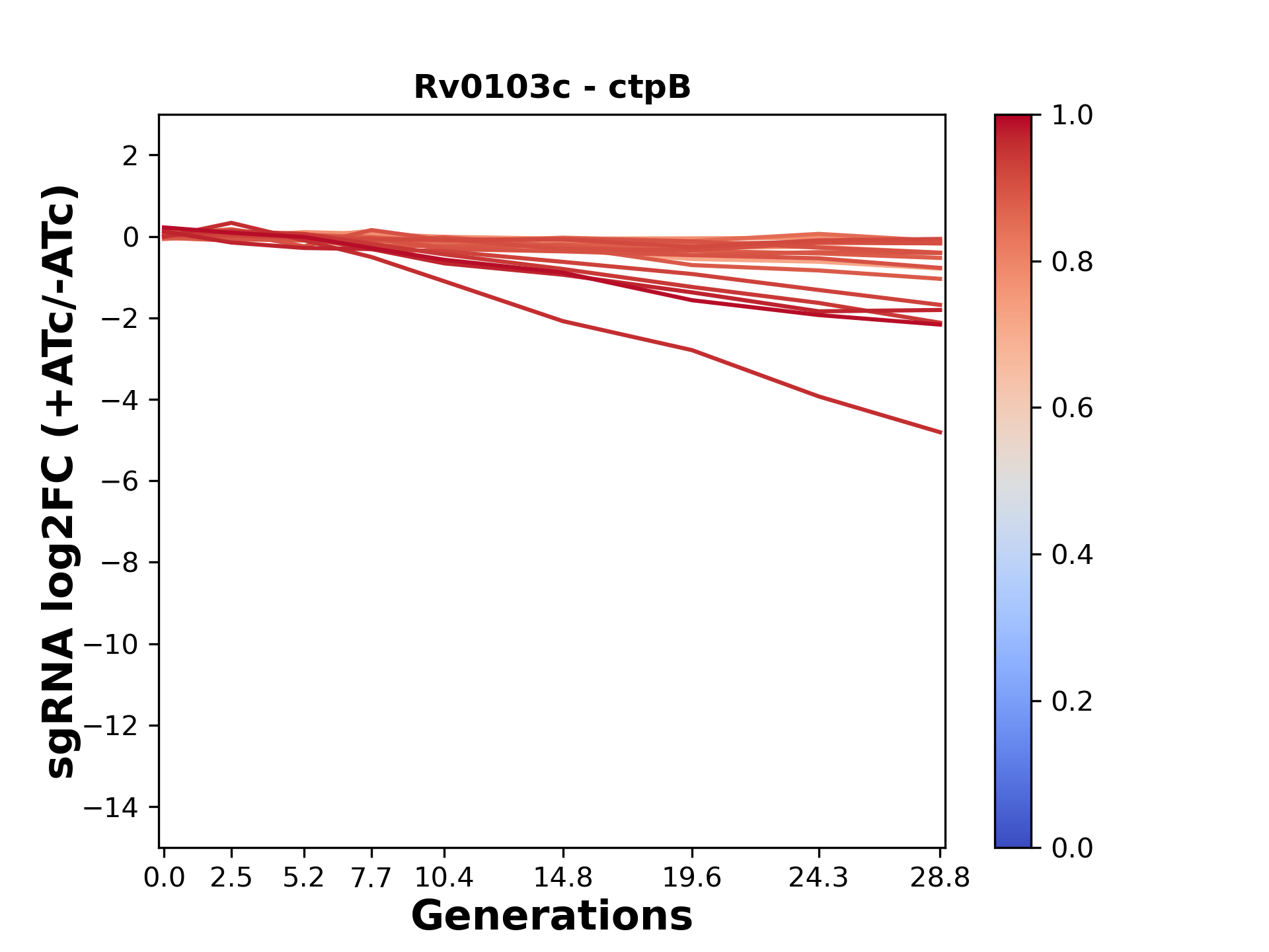 Here, we show sgRNA log2 fold-change values (L2FC) (plus versus minus ATc) over consecutive generations for sgRNAs targeting the gene you selected.