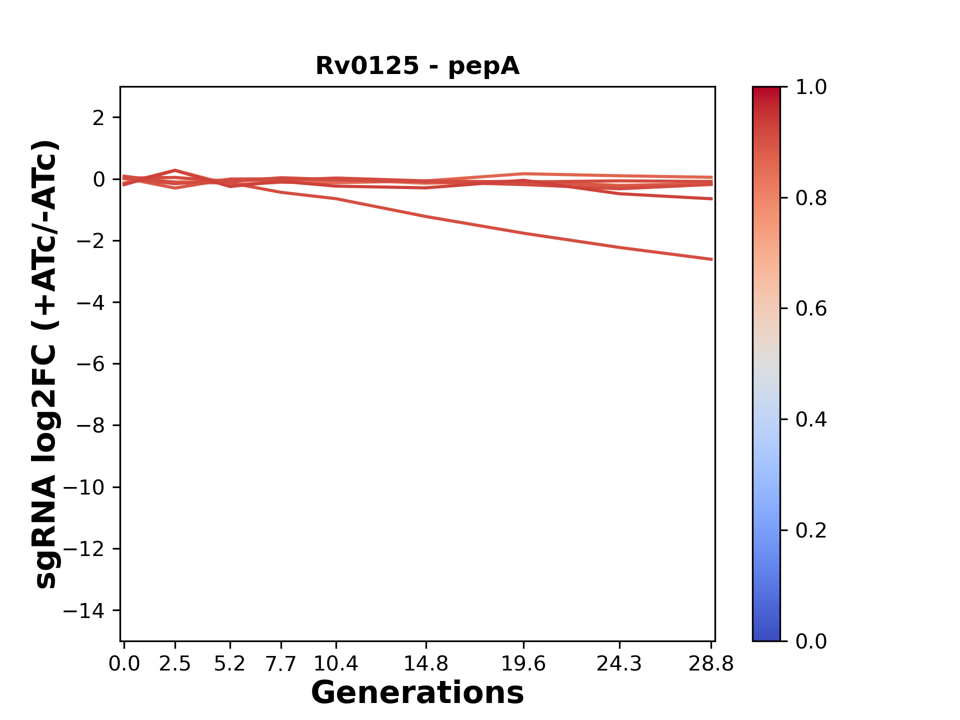 Here, we show sgRNA log2 fold-change values (L2FC) (plus versus minus ATc) over consecutive generations for sgRNAs targeting the gene you selected.