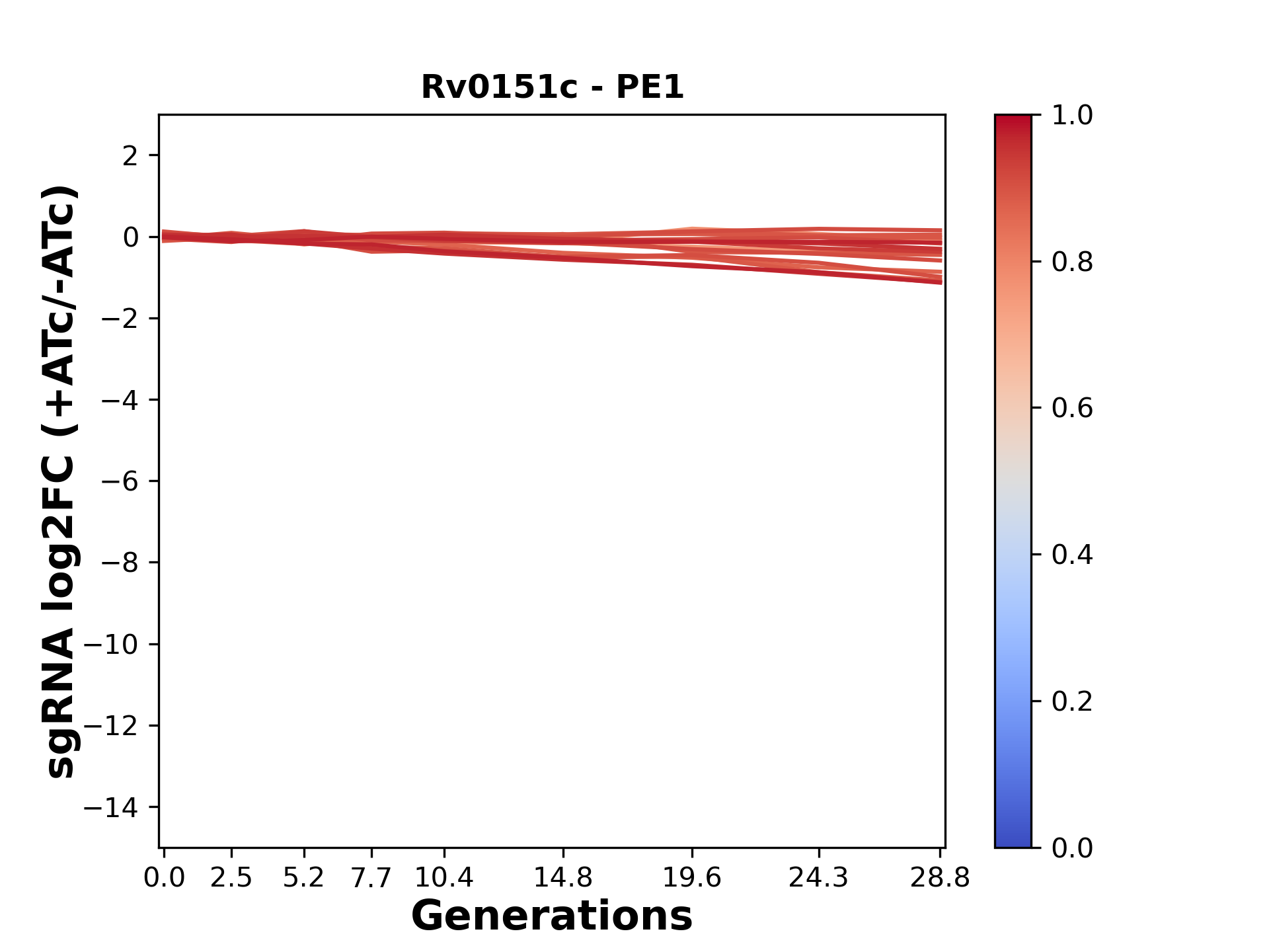 Here, we show sgRNA log2 fold-change values (L2FC) (plus versus minus ATc) over consecutive generations for sgRNAs targeting the gene you selected.