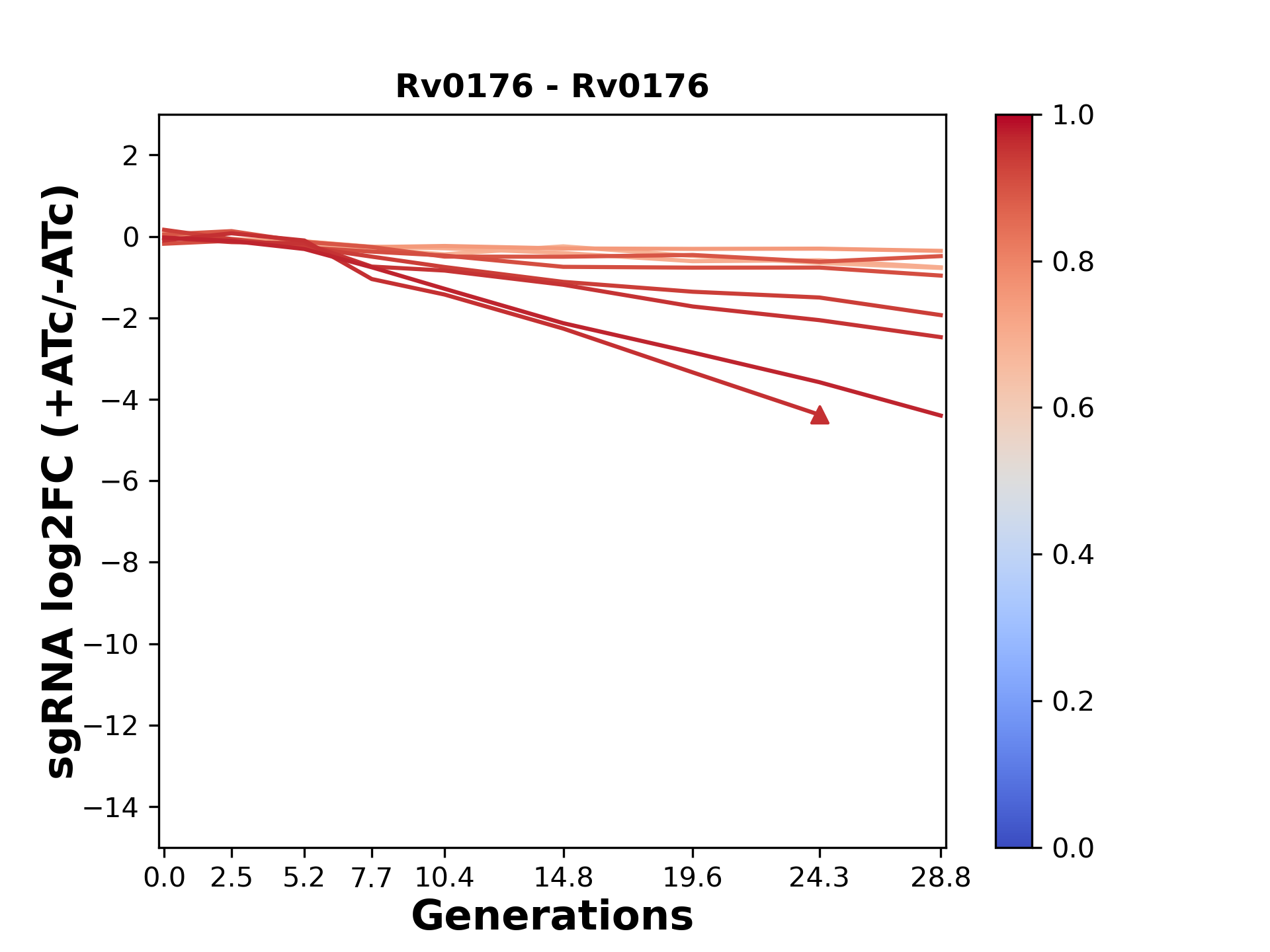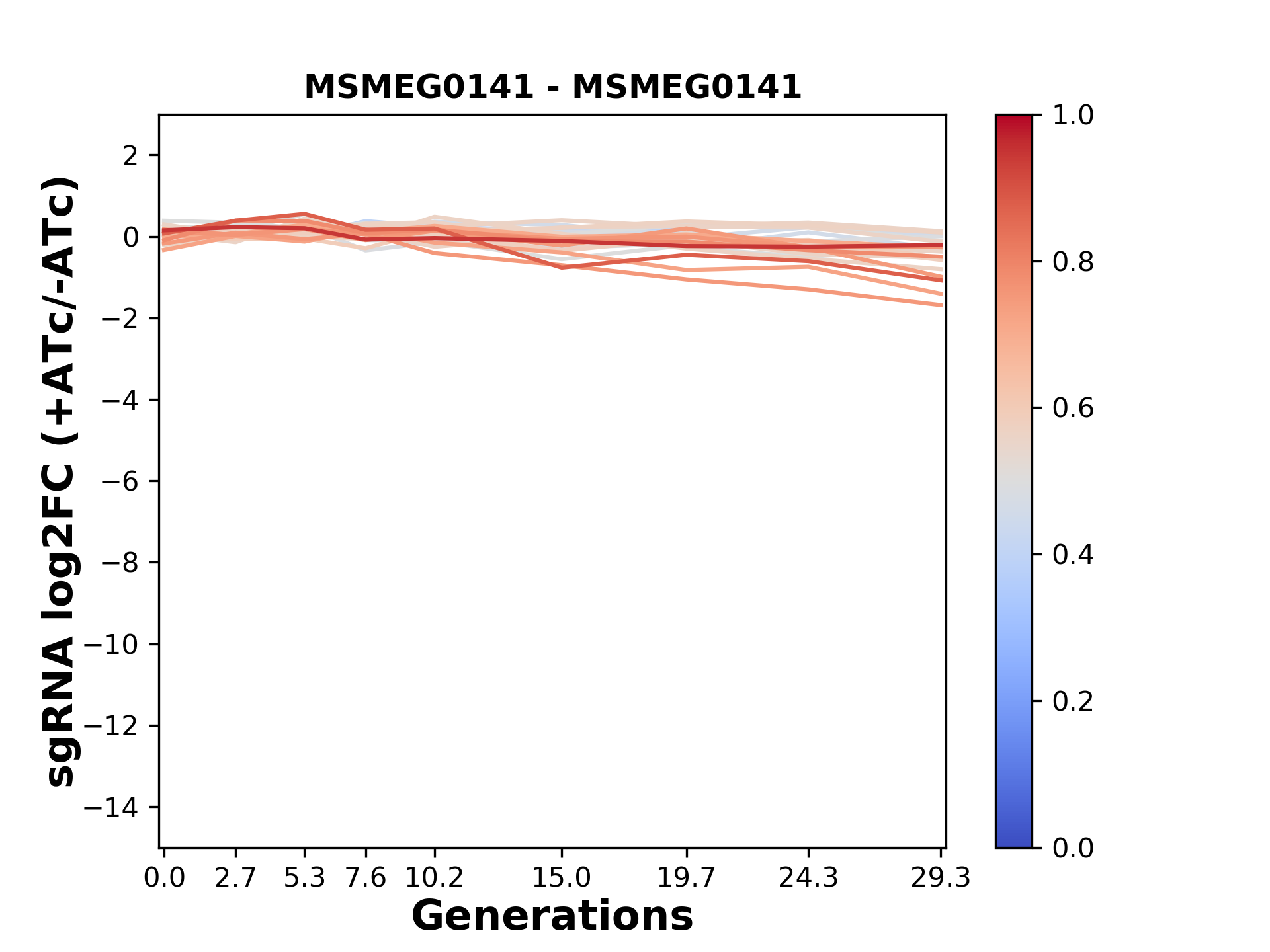 Here, we show sgRNA log2 fold-change values (L2FC) (plus versus minus ATc) over consecutive generations for sgRNAs targeting the gene you selected.