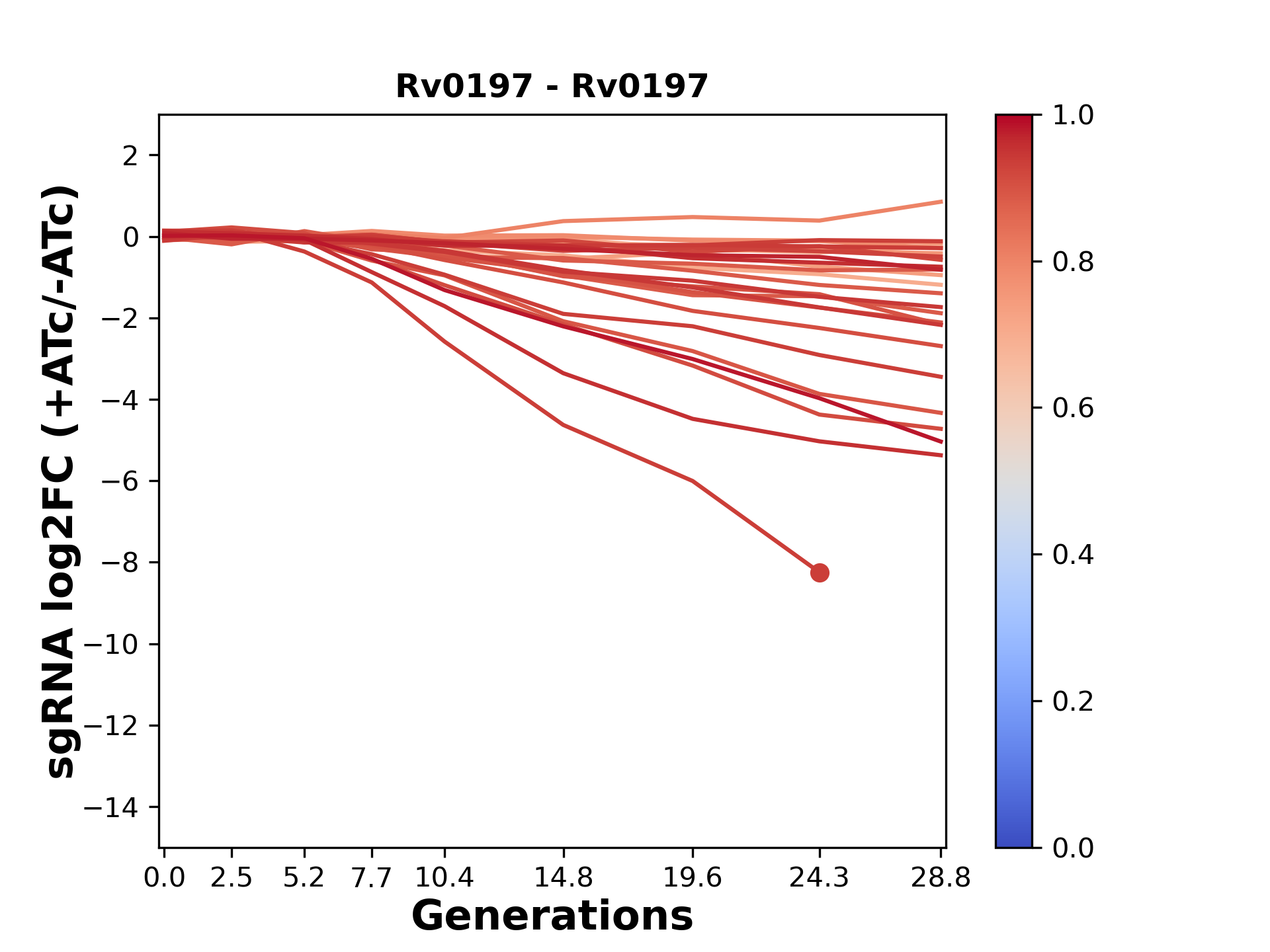 Here, we show sgRNA log2 fold-change values (L2FC) (plus versus minus ATc) over consecutive generations for sgRNAs targeting the gene you selected.