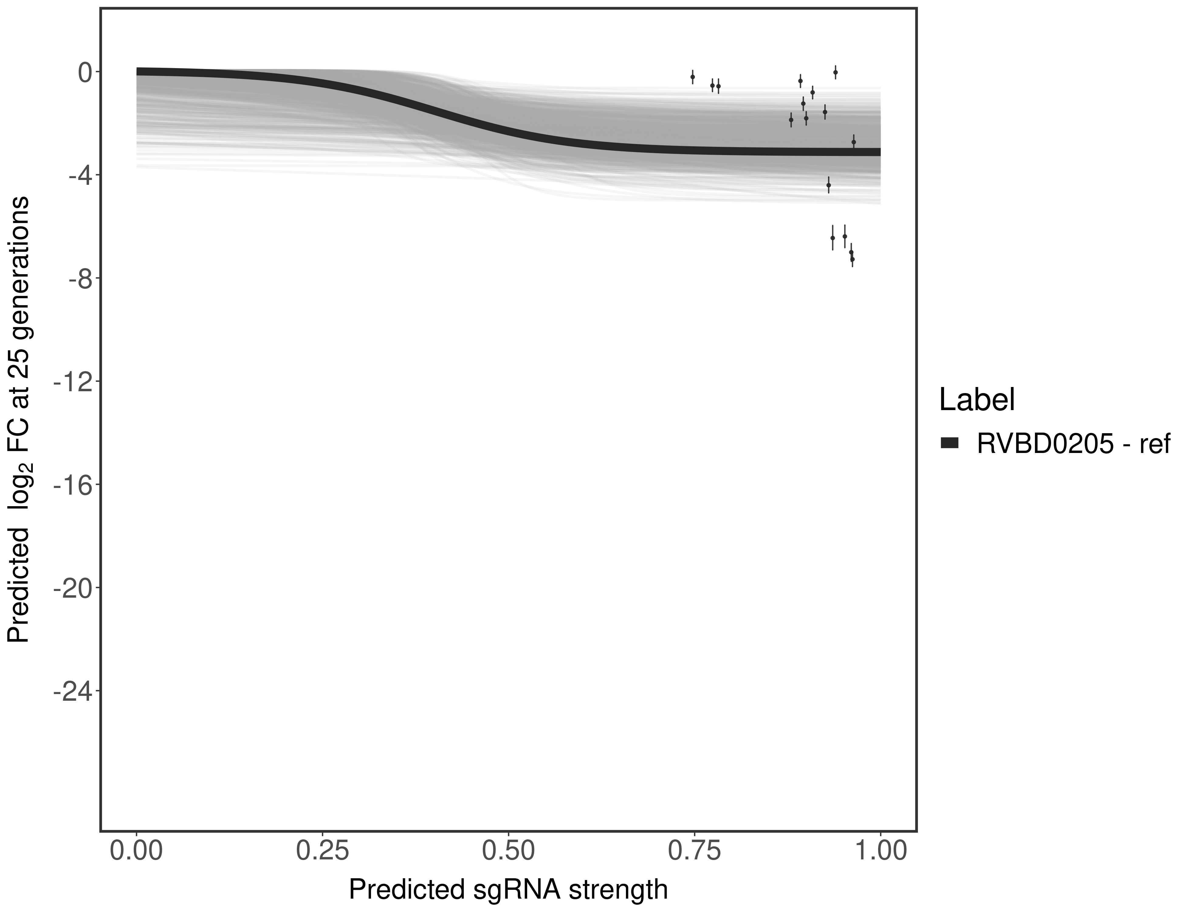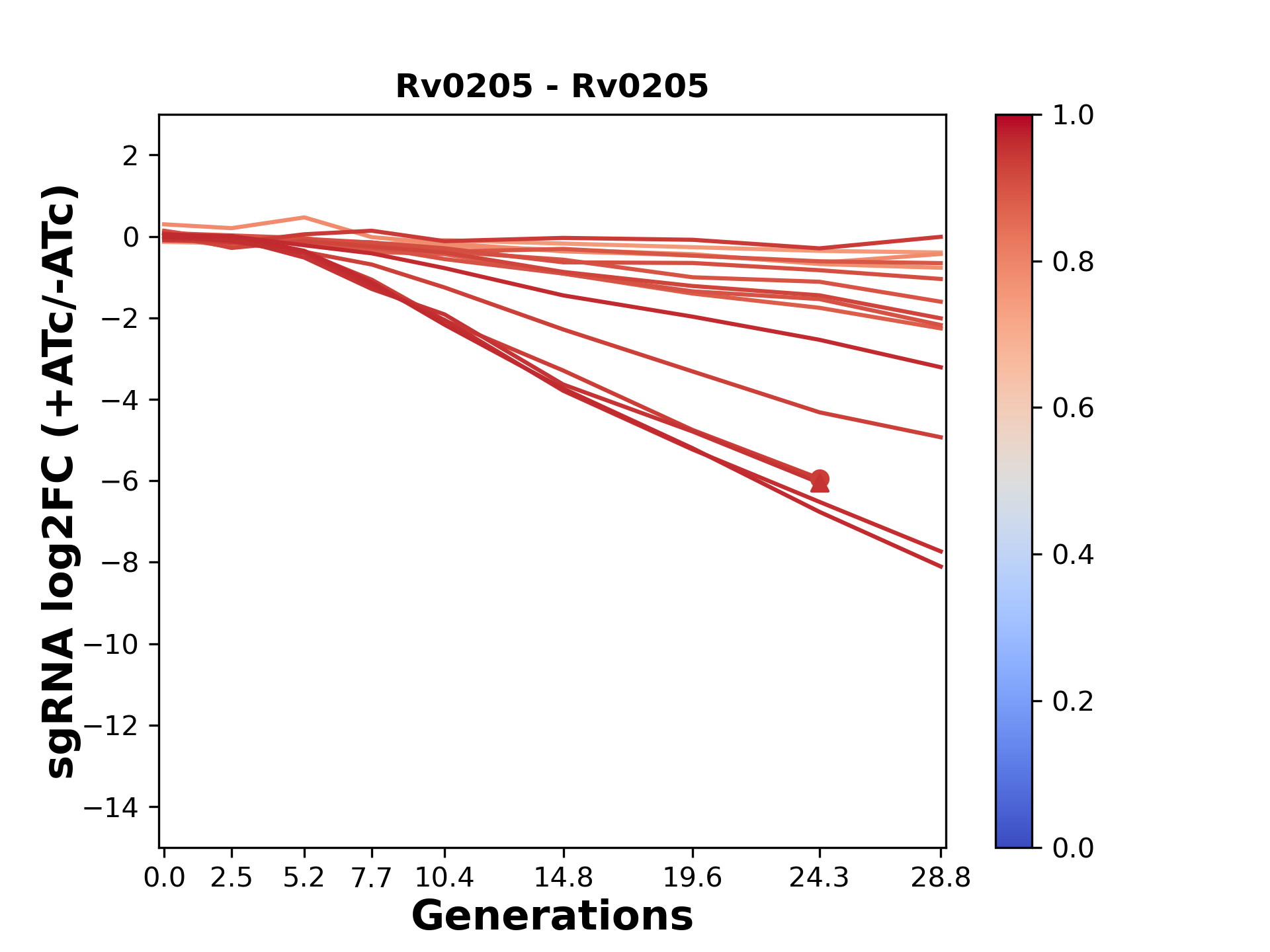 Experiment: We designed an M. tuberculosis CRISPRi library (RLC12) to target all annotated Mtb genes with single guide RNAs (sgRNAs) of varying predicted knockdown efficiencies. In parallel, we constructed a M. smegmatis CRISPRi library (RLC11) to target all annotated Msmeg genes, similar to the Mtb sgRNA library. RLC12 was transformed into M. tuberculosis H37Rv; RLC11 into M. smegmatis mc2-155. We passaged both CRISPRi libraries for nearly 30 generations in the presence or absence of the CRISPRi-inducer anhydrotetracycline (ATc). At the indicated timepoints, genomic DNA was harvested and the representation of individual sgRNAs was counted using Illumina sequencing. Here, we show sgRNA log2 fold-change values (L2FC) (plus versus minus ATc) over consecutive generations for sgRNAs targeting the gene you selected. sgRNAs are color-coded based on their predicted strength from blue (strength=0; weak) to red (strength=1; strong).