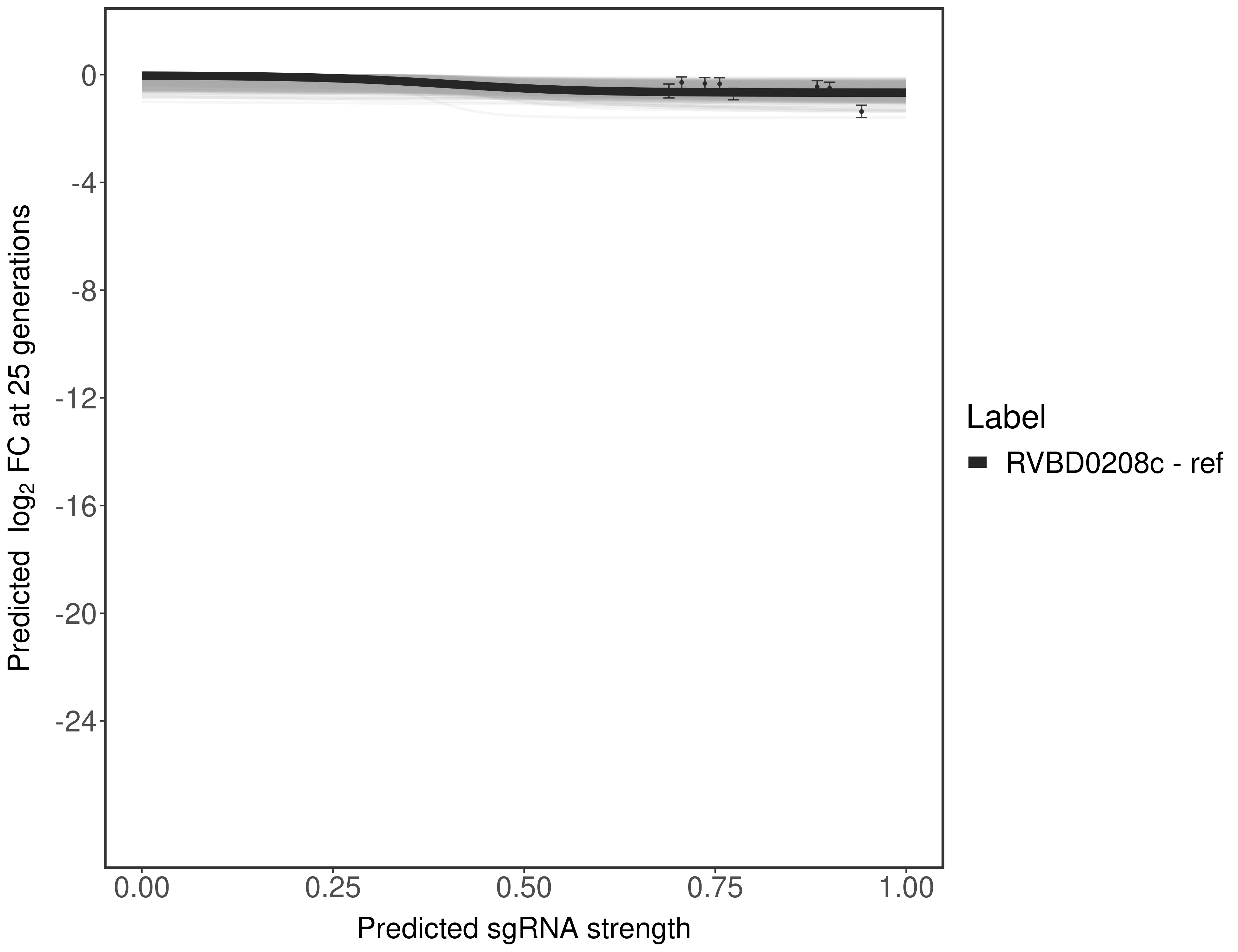 Experiment: We designed an M. tuberculosis CRISPRi library (RLC12) to target all annotated Mtb genes with single guide RNAs (sgRNAs) of varying predicted knockdown efficiencies. In parallel, we constructed a M. smegmatis CRISPRi library (RLC11) to target all annotated Msmeg genes, similar to the Mtb sgRNA library. RLC12 was transformed into M. tuberculosis H37Rv; RLC11 into M. smegmatis mc2-155. We passaged both CRISPRi libraries for nearly 30 generations in the presence or absence of the CRISPRi-inducer anhydrotetracycline (ATc). At the indicated timepoints, genomic DNA was harvested and the representation of individual sgRNAs was counted using Illumina sequencing. Here, we show sgRNA log2 fold-change values (L2FC) (plus versus minus ATc) over consecutive generations for sgRNAs targeting the gene you selected. sgRNAs are color-coded based on their predicted strength from blue (strength=0; weak) to red (strength=1; strong).