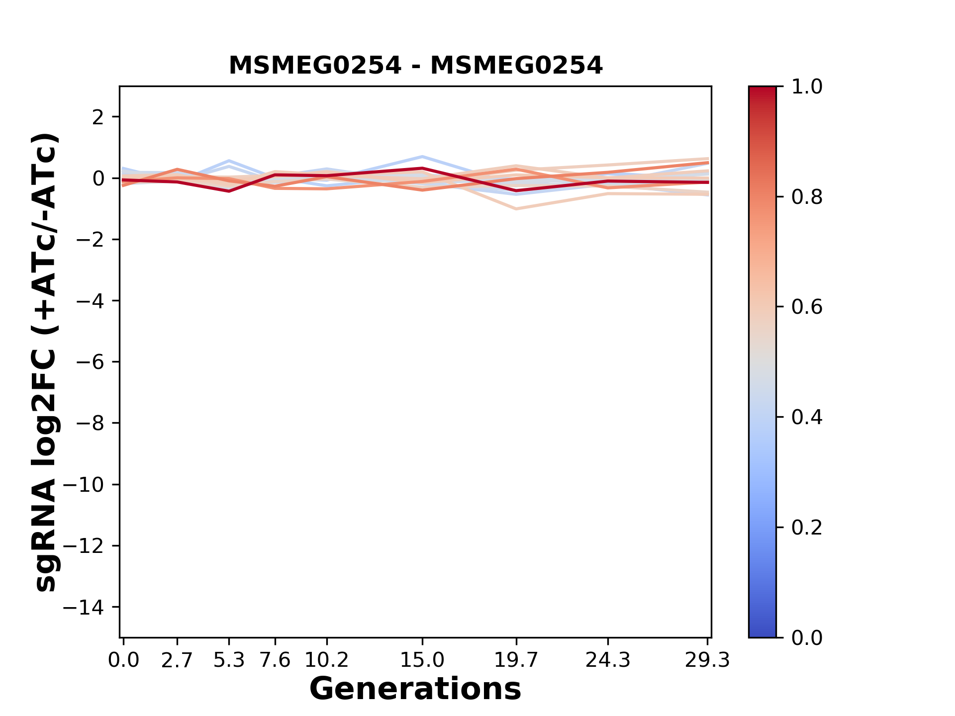 Experiment: We designed an M. tuberculosis CRISPRi library (RLC12) to target all annotated Mtb genes with single guide RNAs (sgRNAs) of varying predicted knockdown efficiencies. In parallel, we constructed a M. smegmatis CRISPRi library (RLC11) to target all annotated Msmeg genes, similar to the Mtb sgRNA library. RLC12 was transformed into M. tuberculosis H37Rv; RLC11 into M. smegmatis mc2-155. We passaged both CRISPRi libraries for nearly 30 generations in the presence or absence of the CRISPRi-inducer anhydrotetracycline (ATc). At the indicated timepoints, genomic DNA was harvested and the representation of individual sgRNAs was counted using Illumina sequencing. Here, we show sgRNA log2 fold-change values (L2FC) (plus versus minus ATc) over consecutive generations for sgRNAs targeting the gene you selected. sgRNAs are color-coded based on their predicted strength from blue (strength=0; weak) to red (strength=1; strong).