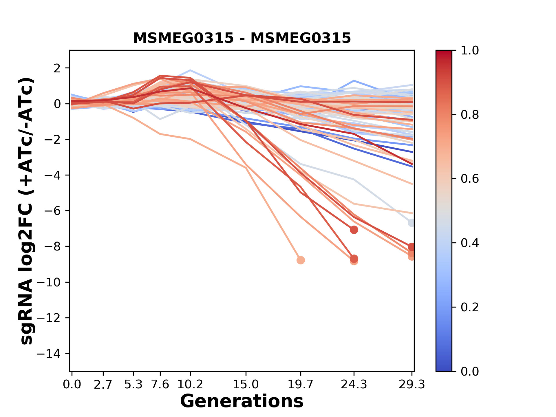 Here, we show sgRNA log2 fold-change values (L2FC) (plus versus minus ATc) over consecutive generations for sgRNAs targeting the gene you selected.