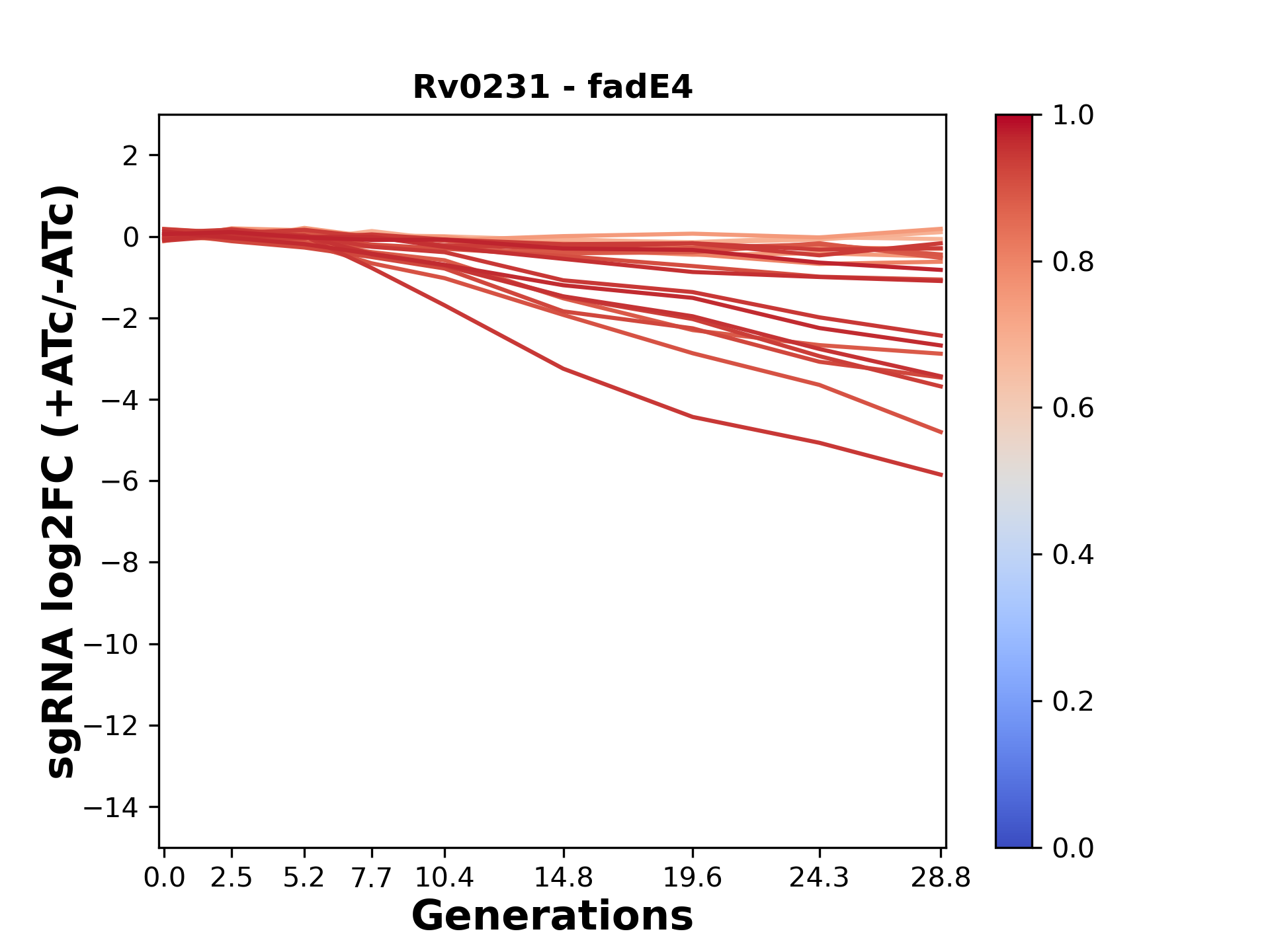 Here, we show sgRNA log2 fold-change values (L2FC) (plus versus minus ATc) over consecutive generations for sgRNAs targeting the gene you selected.