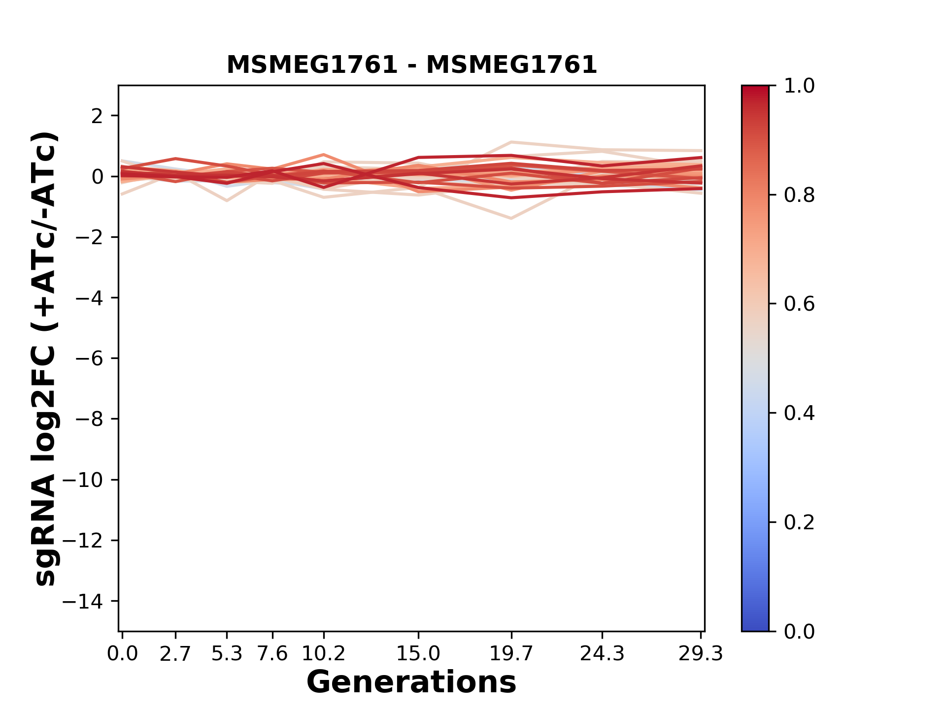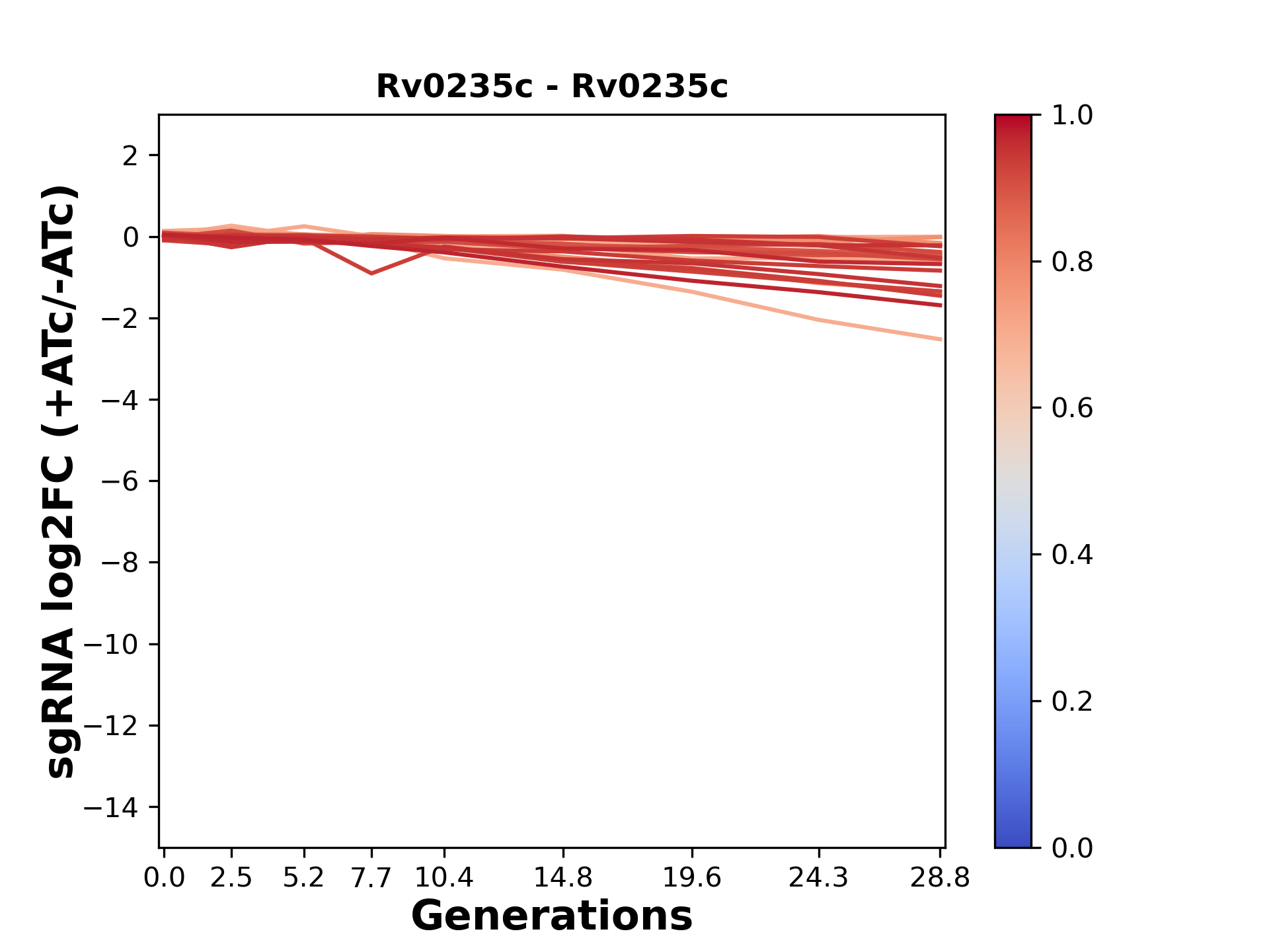 Experiment: We designed an M. tuberculosis CRISPRi library (RLC12) to target all annotated Mtb genes with single guide RNAs (sgRNAs) of varying predicted knockdown efficiencies. In parallel, we constructed a M. smegmatis CRISPRi library (RLC11) to target all annotated Msmeg genes, similar to the Mtb sgRNA library. RLC12 was transformed into M. tuberculosis H37Rv; RLC11 into M. smegmatis mc2-155. We passaged both CRISPRi libraries for nearly 30 generations in the presence or absence of the CRISPRi-inducer anhydrotetracycline (ATc). At the indicated timepoints, genomic DNA was harvested and the representation of individual sgRNAs was counted using Illumina sequencing. Here, we show sgRNA log2 fold-change values (L2FC) (plus versus minus ATc) over consecutive generations for sgRNAs targeting the gene you selected. sgRNAs are color-coded based on their predicted strength from blue (strength=0; weak) to red (strength=1; strong).