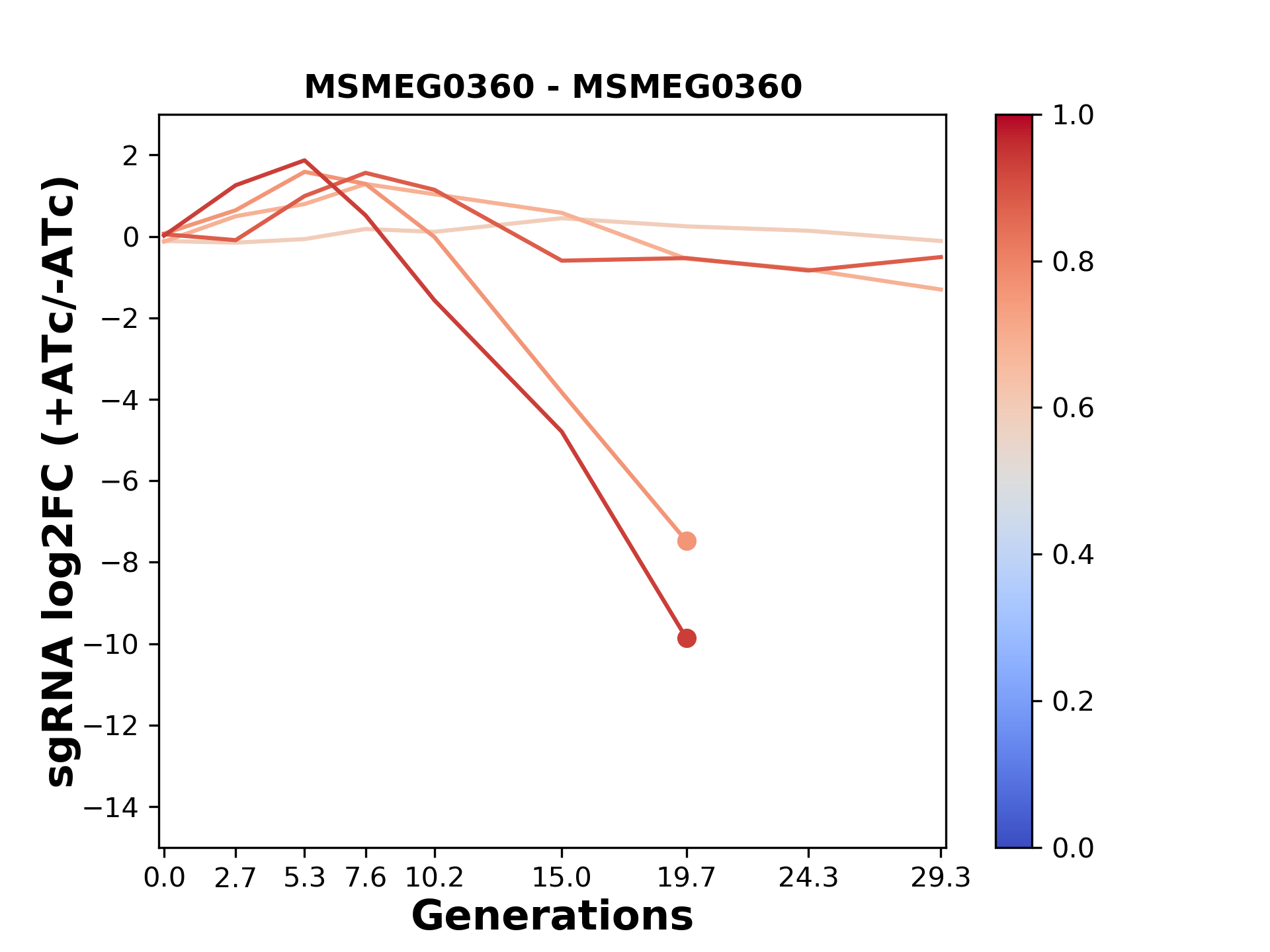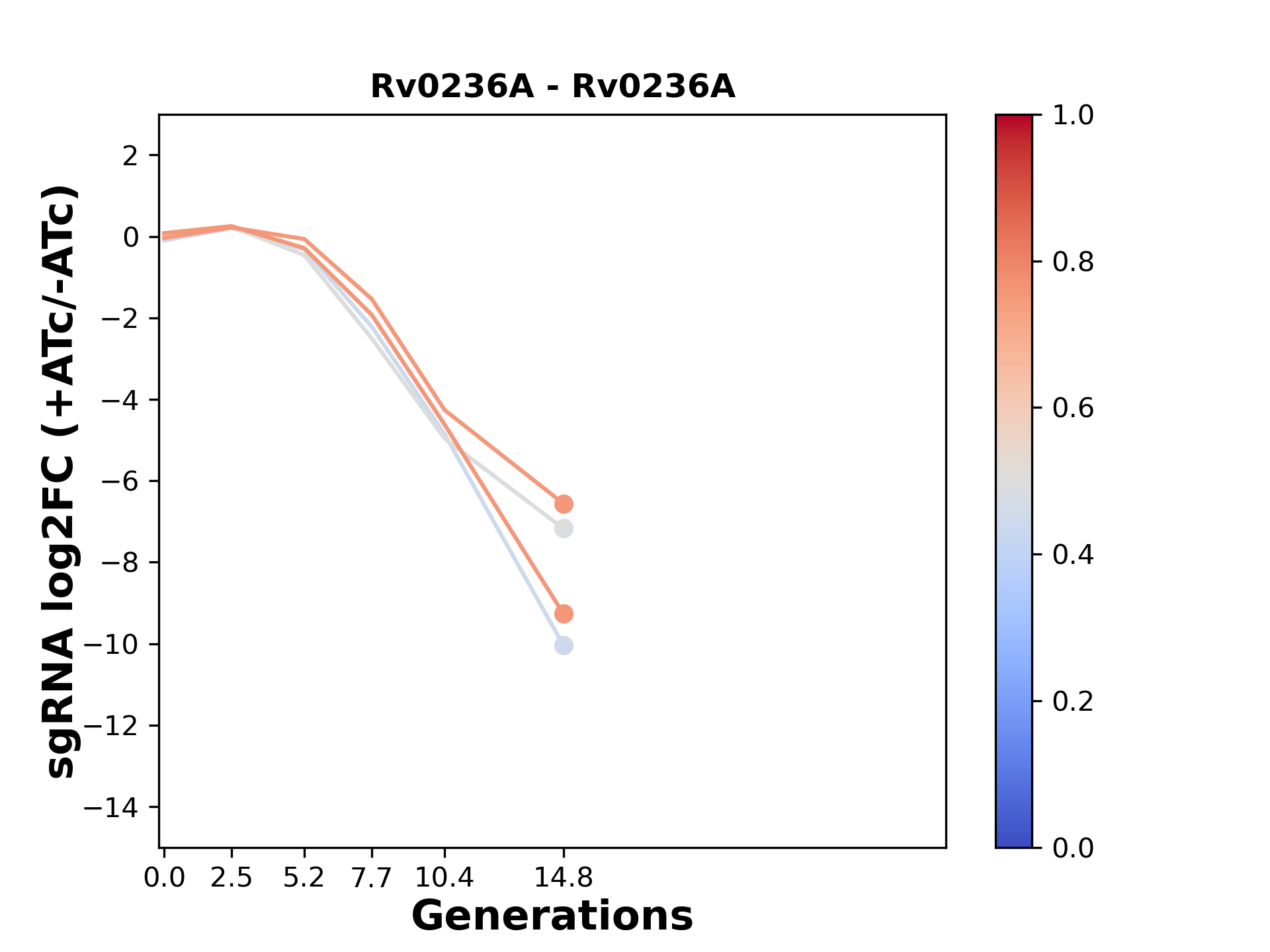 Here, we show sgRNA log2 fold-change values (L2FC) (plus versus minus ATc) over consecutive generations for sgRNAs targeting the gene you selected.