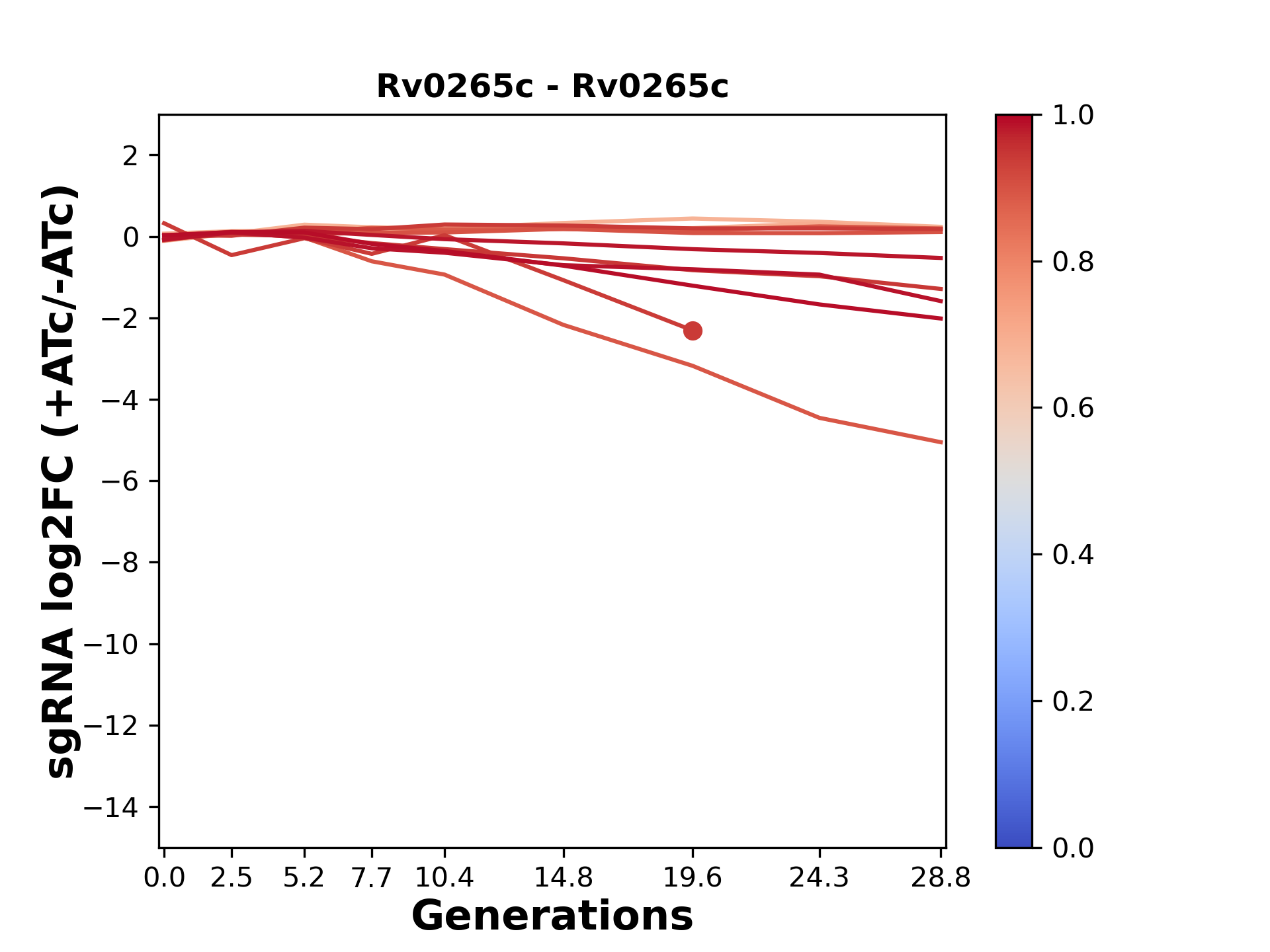 Experiment: We designed an M. tuberculosis CRISPRi library (RLC12) to target all annotated Mtb genes with single guide RNAs (sgRNAs) of varying predicted knockdown efficiencies. In parallel, we constructed a M. smegmatis CRISPRi library (RLC11) to target all annotated Msmeg genes, similar to the Mtb sgRNA library. RLC12 was transformed into M. tuberculosis H37Rv; RLC11 into M. smegmatis mc2-155. We passaged both CRISPRi libraries for nearly 30 generations in the presence or absence of the CRISPRi-inducer anhydrotetracycline (ATc). At the indicated timepoints, genomic DNA was harvested and the representation of individual sgRNAs was counted using Illumina sequencing. Here, we show sgRNA log2 fold-change values (L2FC) (plus versus minus ATc) over consecutive generations for sgRNAs targeting the gene you selected. sgRNAs are color-coded based on their predicted strength from blue (strength=0; weak) to red (strength=1; strong).