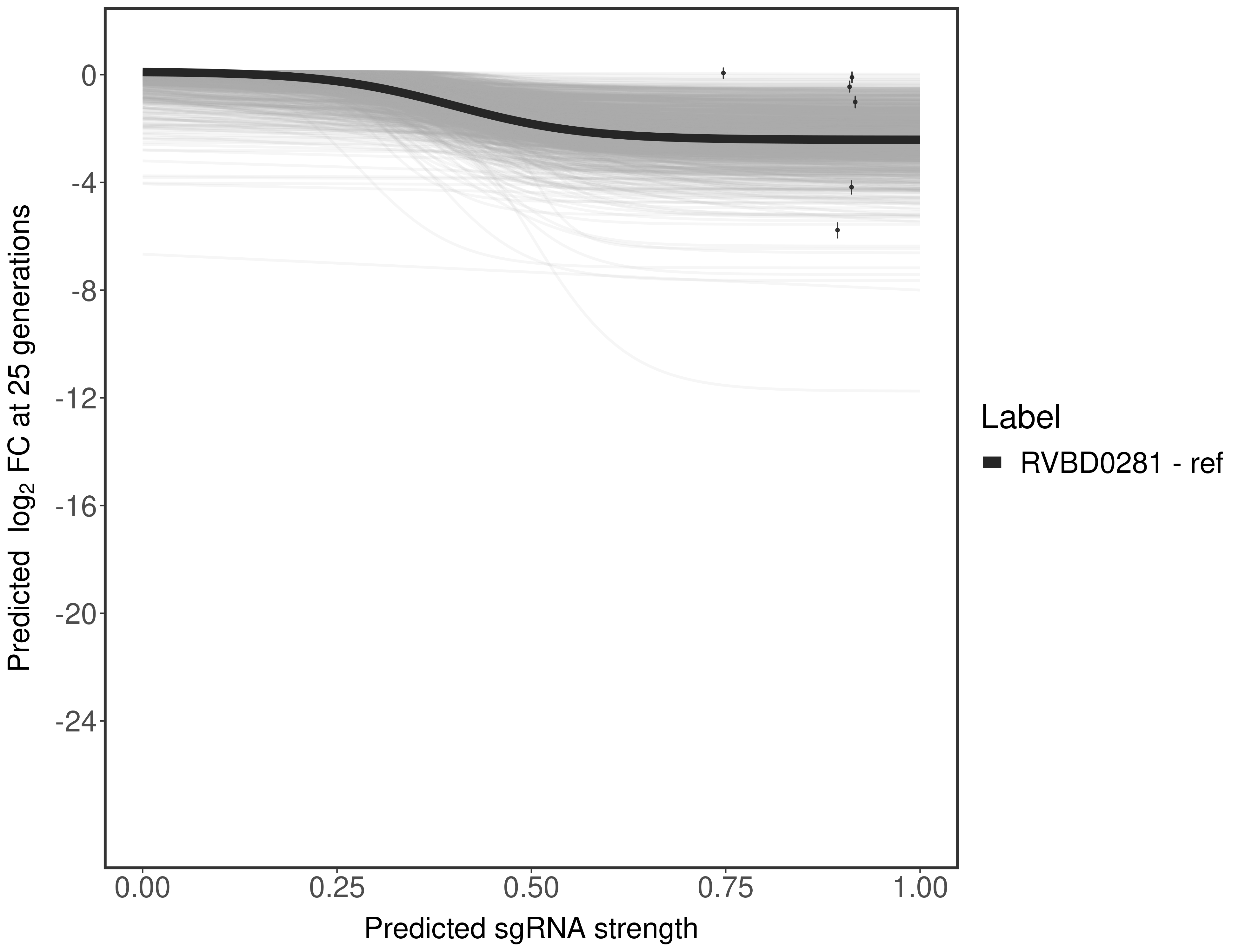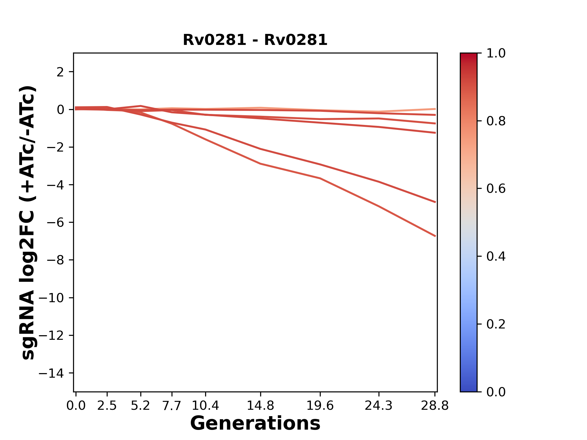 Here, we show sgRNA log2 fold-change values (L2FC) (plus versus minus ATc) over consecutive generations for sgRNAs targeting the gene you selected.