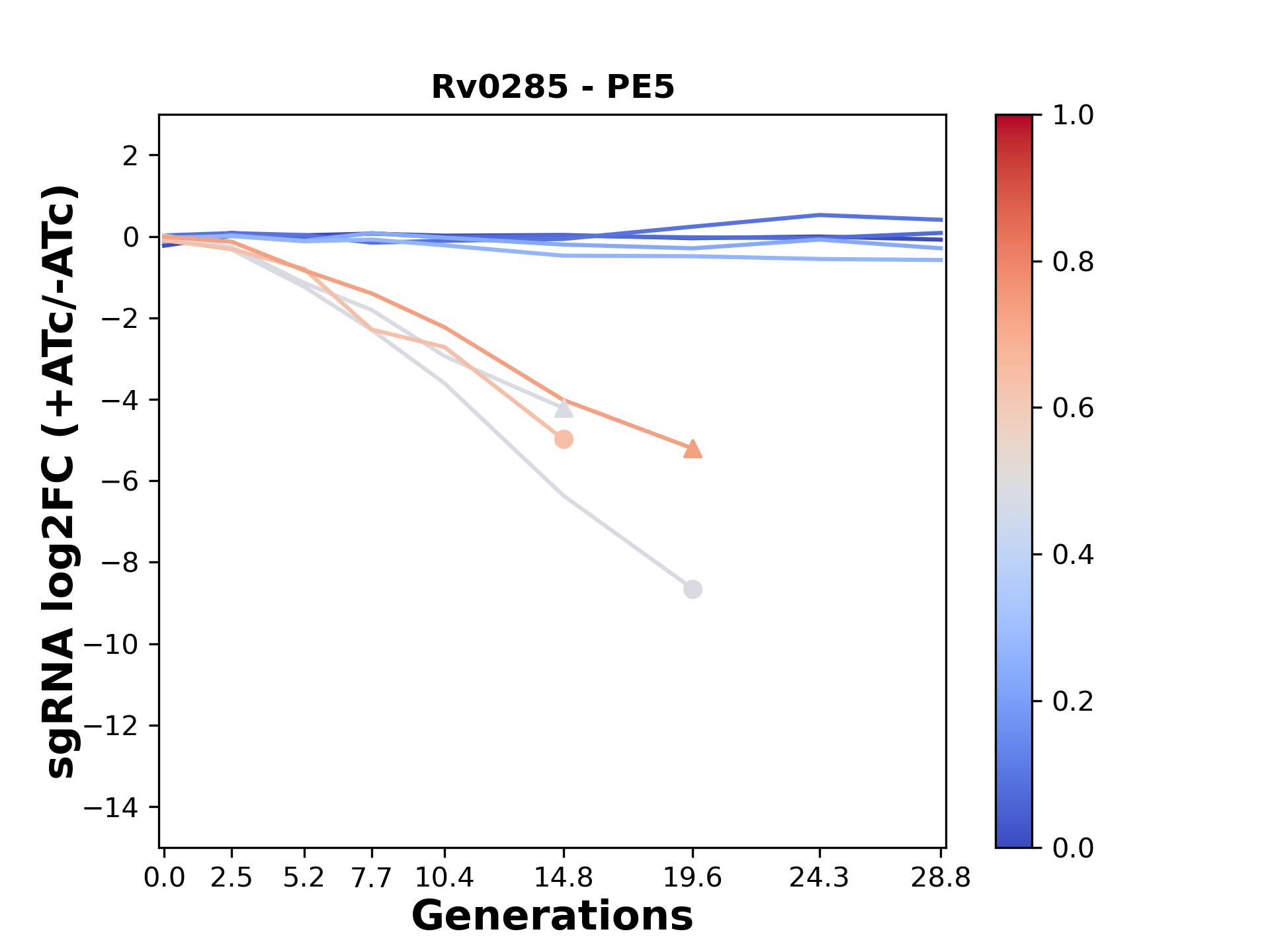 Here, we show sgRNA log2 fold-change values (L2FC) (plus versus minus ATc) over consecutive generations for sgRNAs targeting the gene you selected.