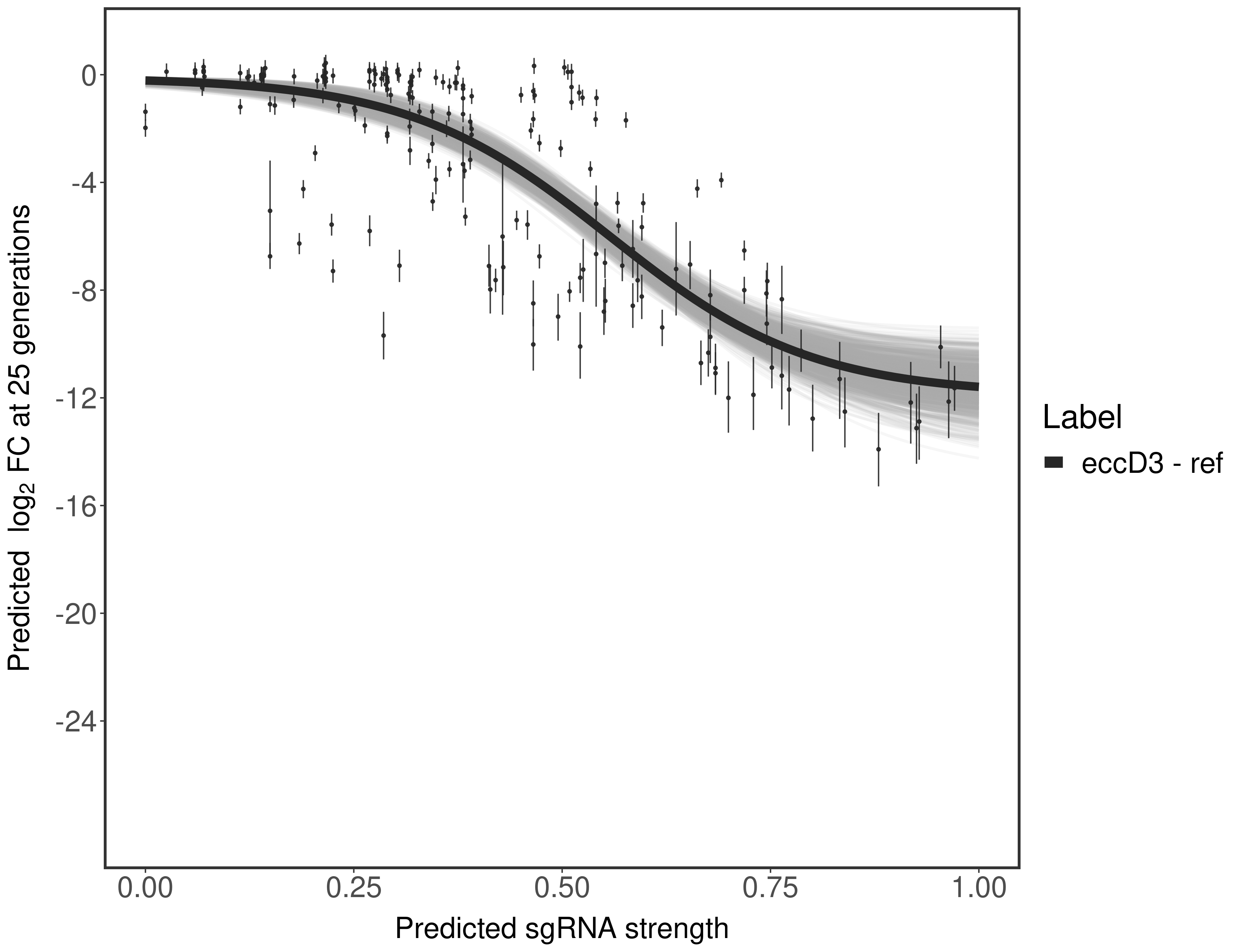 In order to quantify gene vulnerability, data were subsequently analyzed with a hierarchical model at the sgRNA level (two-line model) and gene level (Hill curve). The vulnerability quantification is shown below. [More information]