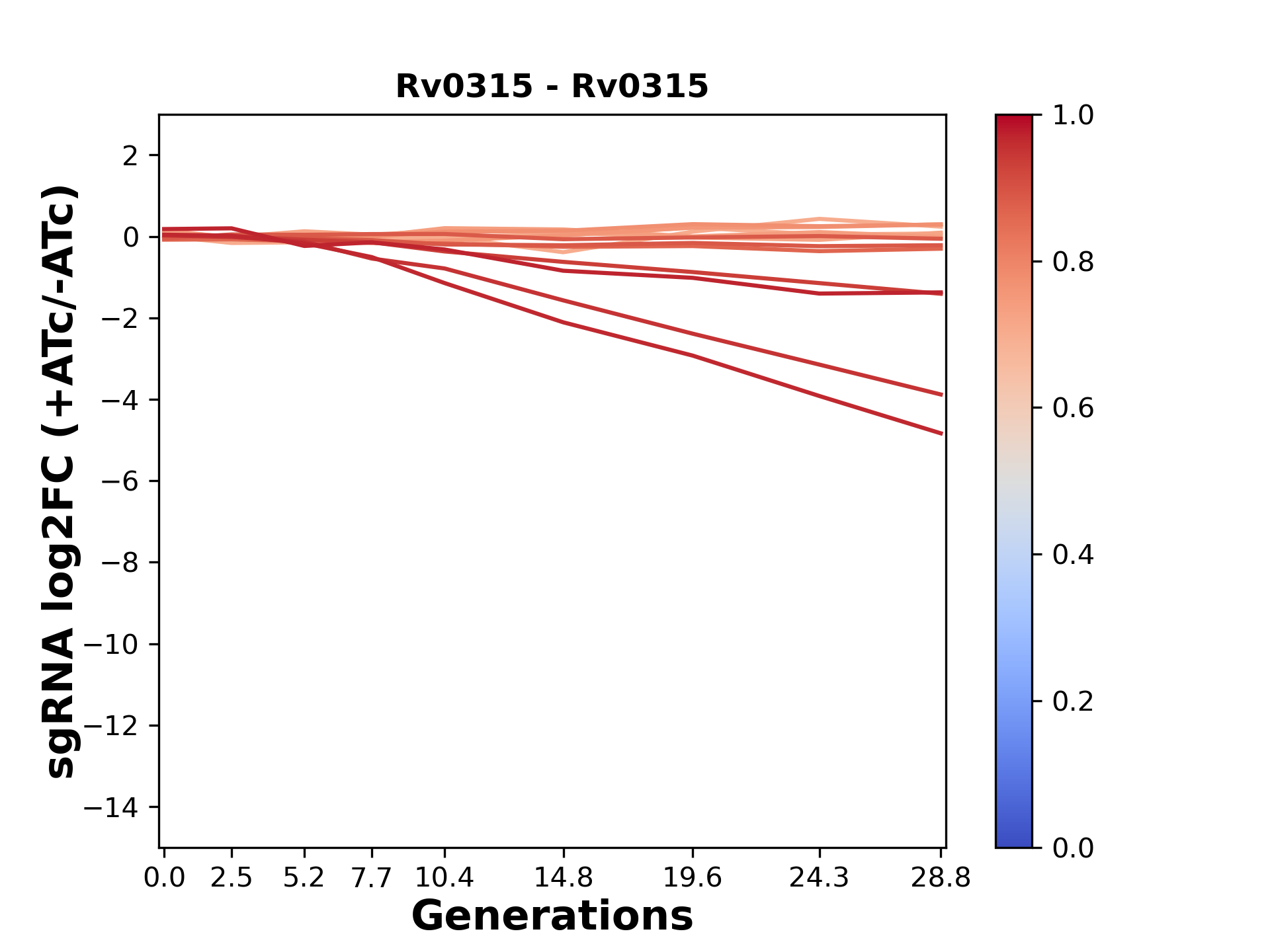 Here, we show sgRNA log2 fold-change values (L2FC) (plus versus minus ATc) over consecutive generations for sgRNAs targeting the gene you selected.