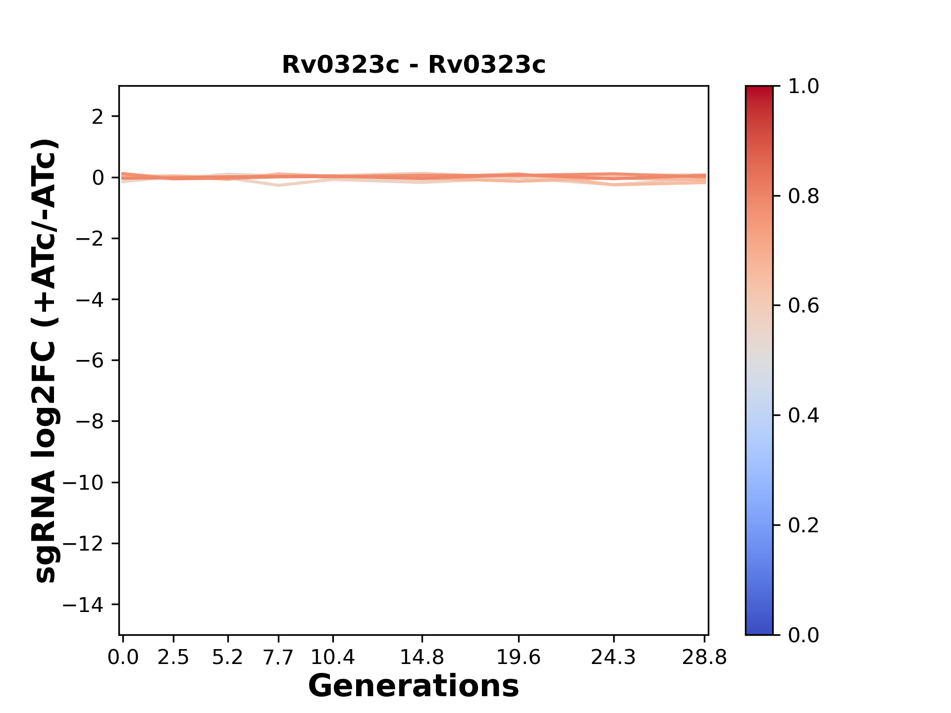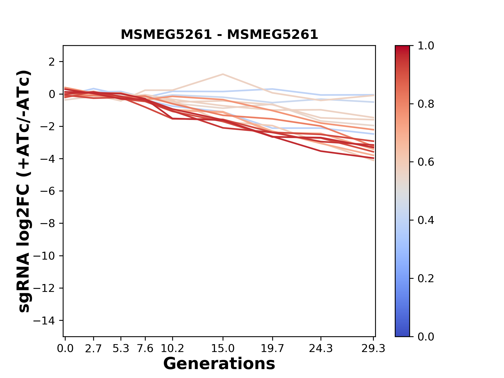 Here, we show sgRNA log2 fold-change values (L2FC) (plus versus minus ATc) over consecutive generations for sgRNAs targeting the gene you selected.