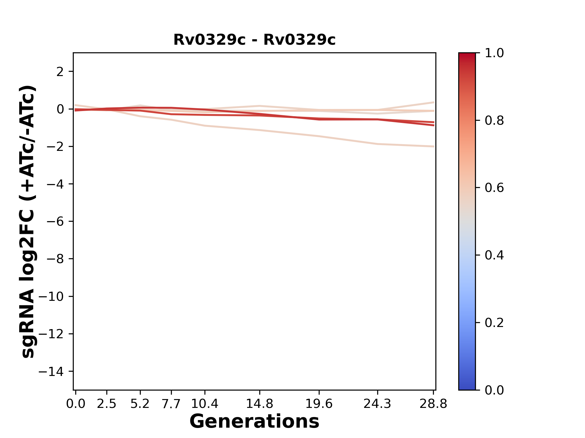 Here, we show sgRNA log2 fold-change values (L2FC) (plus versus minus ATc) over consecutive generations for sgRNAs targeting the gene you selected.