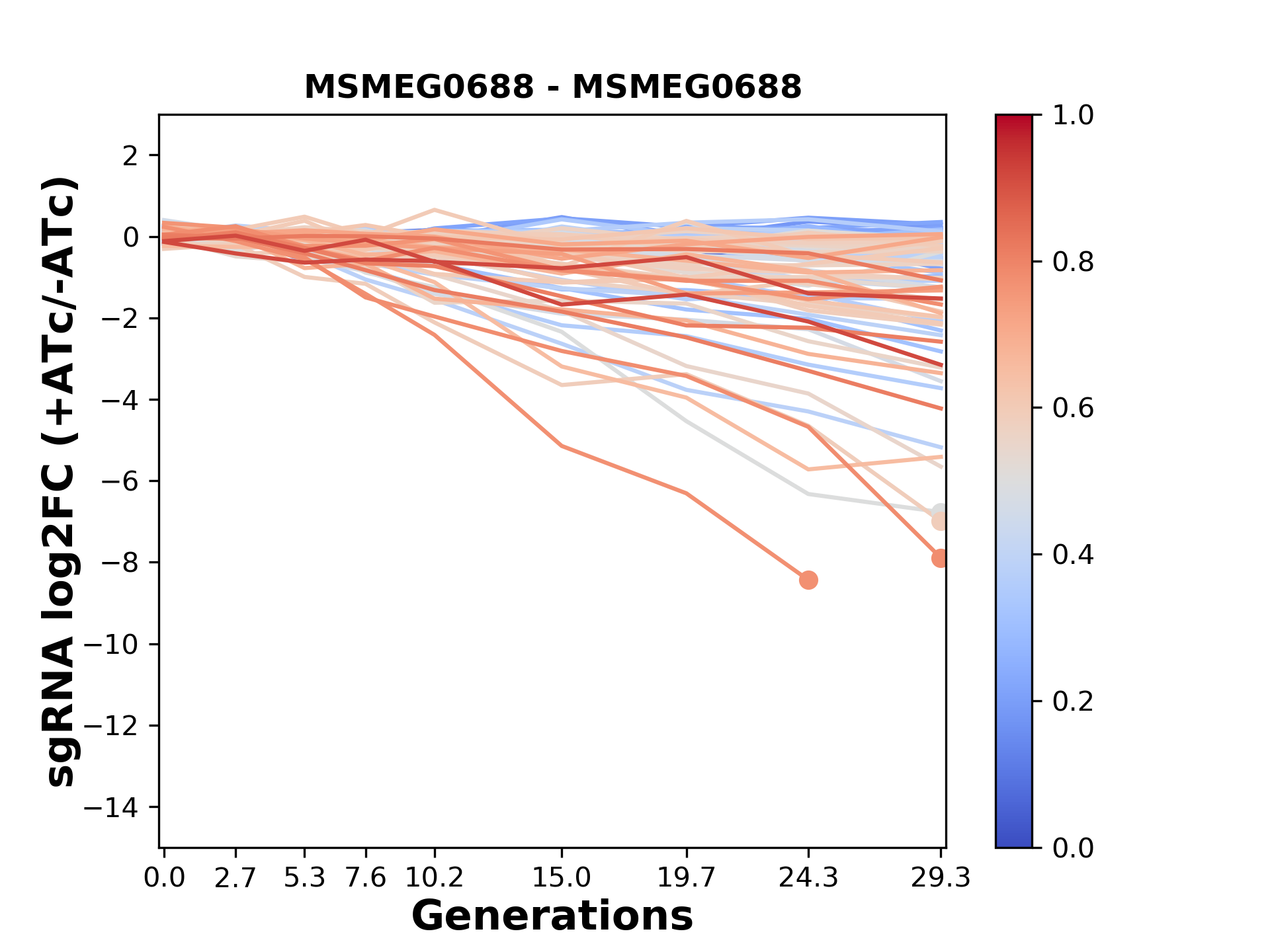 Here, we show sgRNA log2 fold-change values (L2FC) (plus versus minus ATc) over consecutive generations for sgRNAs targeting the gene you selected.