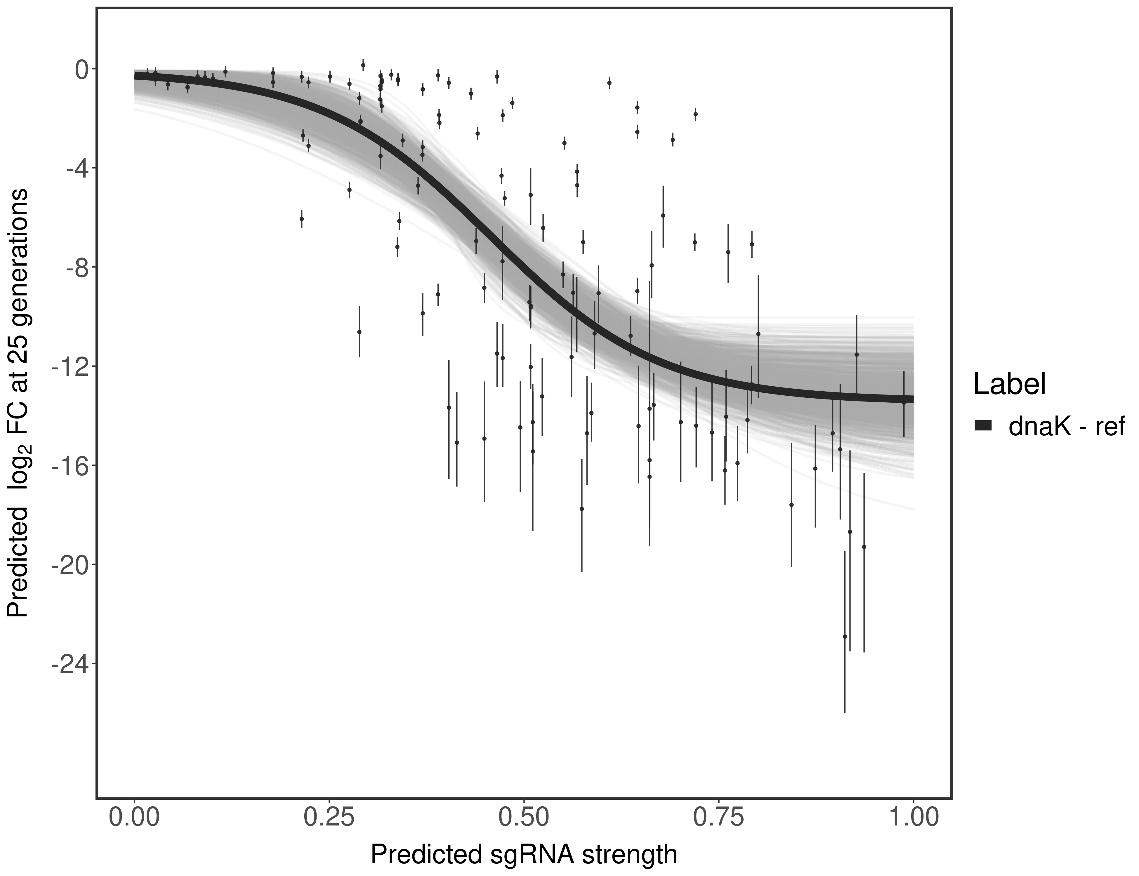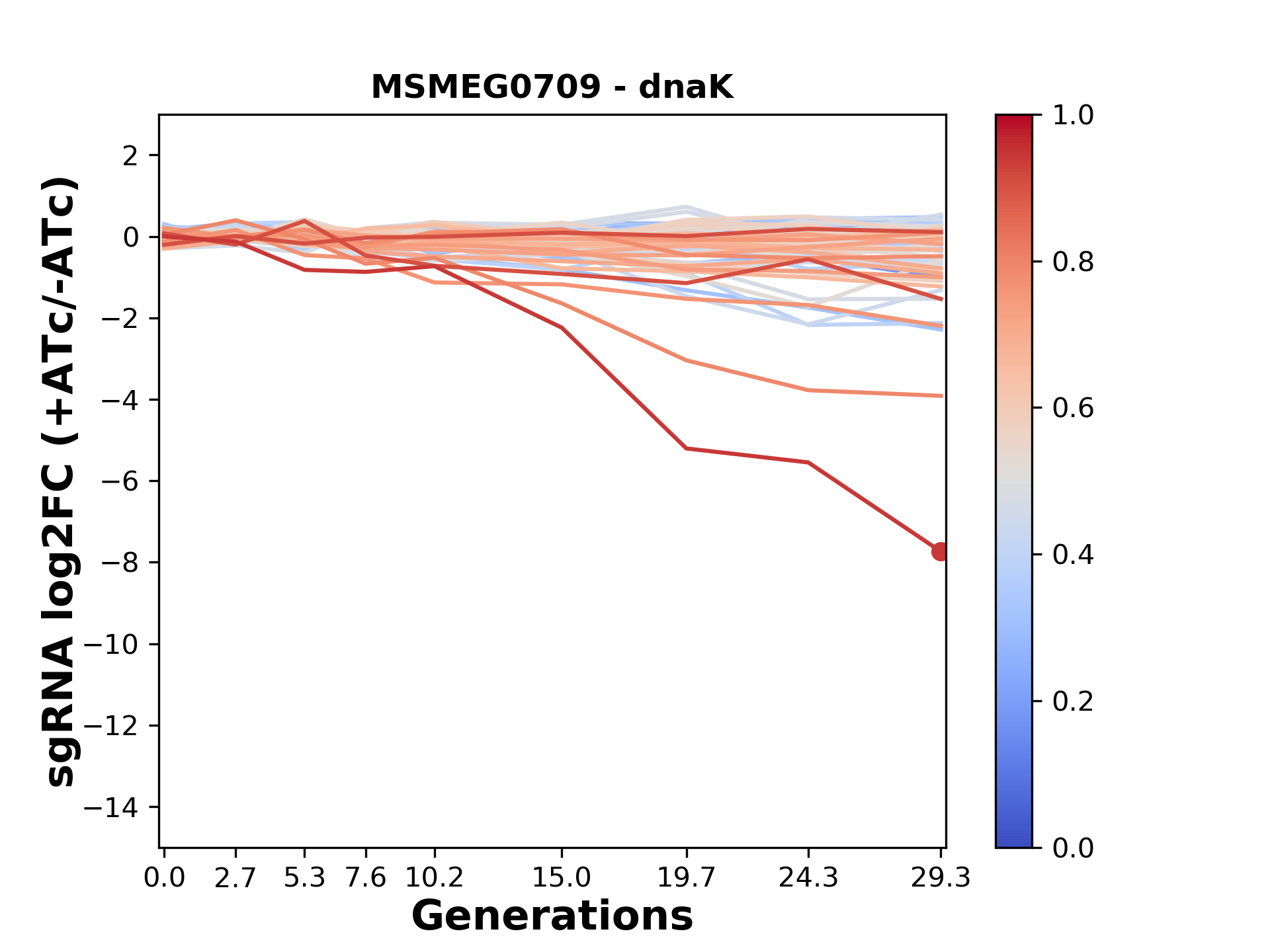 Here, we show sgRNA log2 fold-change values (L2FC) (plus versus minus ATc) over consecutive generations for sgRNAs targeting the gene you selected.