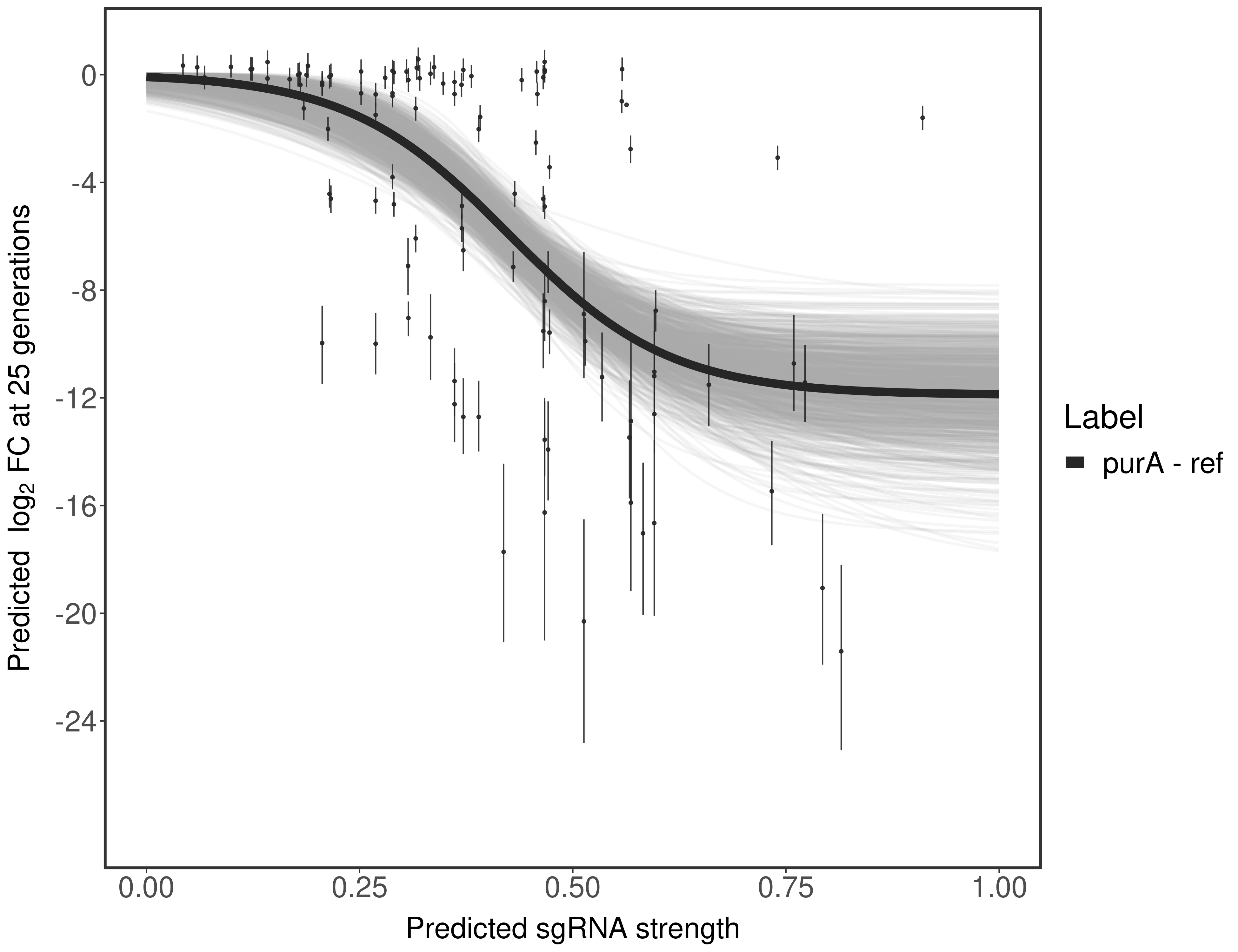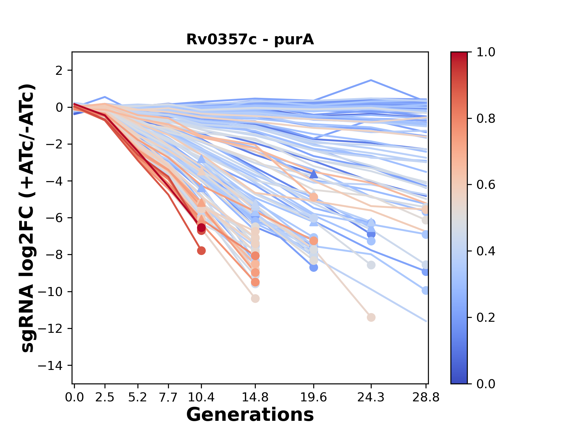Experiment: We designed an M. tuberculosis CRISPRi library (RLC12) to target all annotated Mtb genes with single guide RNAs (sgRNAs) of varying predicted knockdown efficiencies. In parallel, we constructed a M. smegmatis CRISPRi library (RLC11) to target all annotated Msmeg genes, similar to the Mtb sgRNA library. RLC12 was transformed into M. tuberculosis H37Rv; RLC11 into M. smegmatis mc2-155. We passaged both CRISPRi libraries for nearly 30 generations in the presence or absence of the CRISPRi-inducer anhydrotetracycline (ATc). At the indicated timepoints, genomic DNA was harvested and the representation of individual sgRNAs was counted using Illumina sequencing. Here, we show sgRNA log2 fold-change values (L2FC) (plus versus minus ATc) over consecutive generations for sgRNAs targeting the gene you selected. sgRNAs are color-coded based on their predicted strength from blue (strength=0; weak) to red (strength=1; strong).