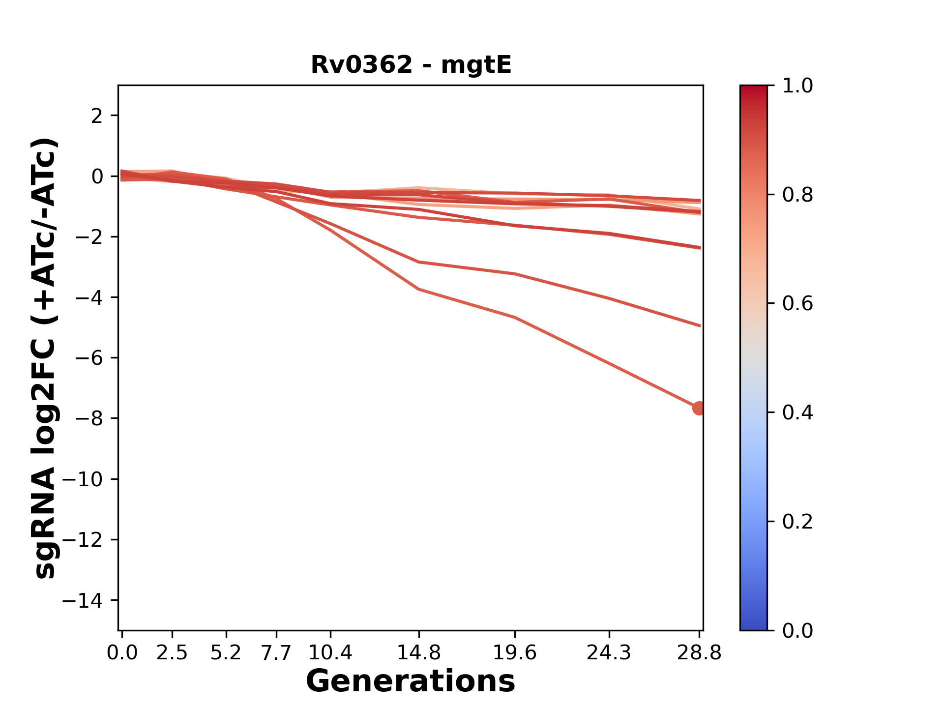 Here, we show sgRNA log2 fold-change values (L2FC) (plus versus minus ATc) over consecutive generations for sgRNAs targeting the gene you selected.