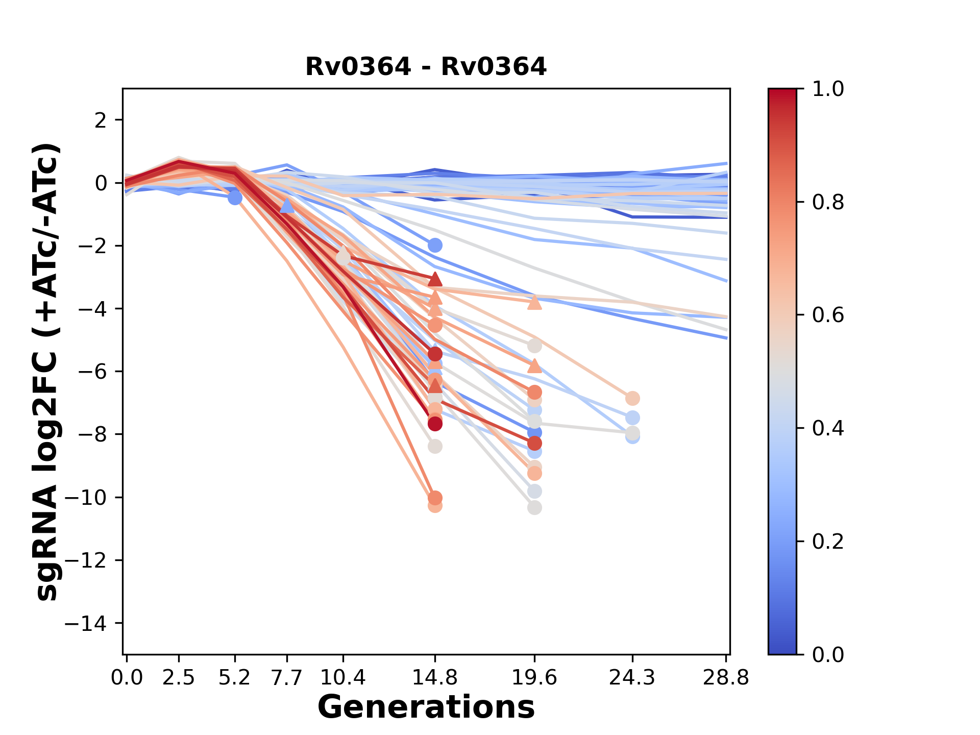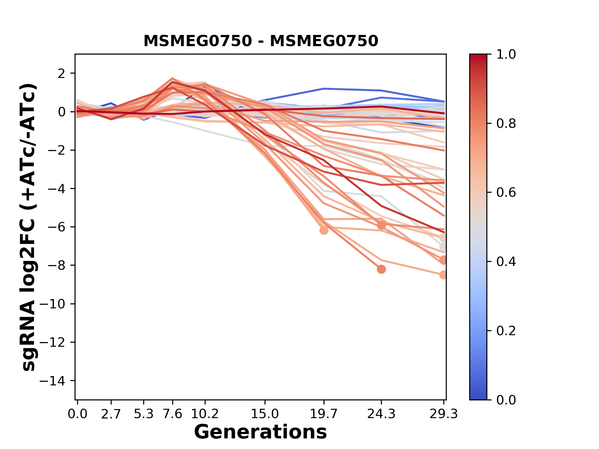 Here, we show sgRNA log2 fold-change values (L2FC) (plus versus minus ATc) over consecutive generations for sgRNAs targeting the gene you selected.