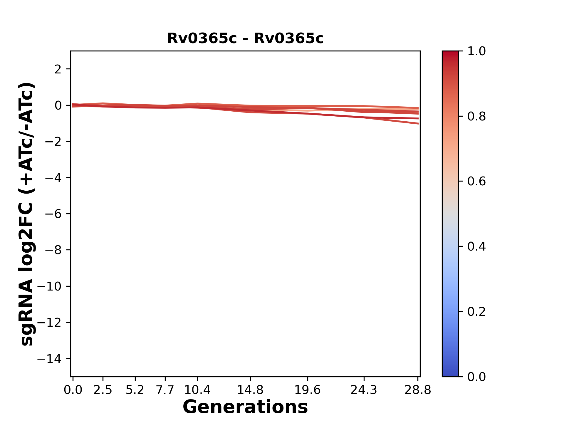 Here, we show sgRNA log2 fold-change values (L2FC) (plus versus minus ATc) over consecutive generations for sgRNAs targeting the gene you selected.