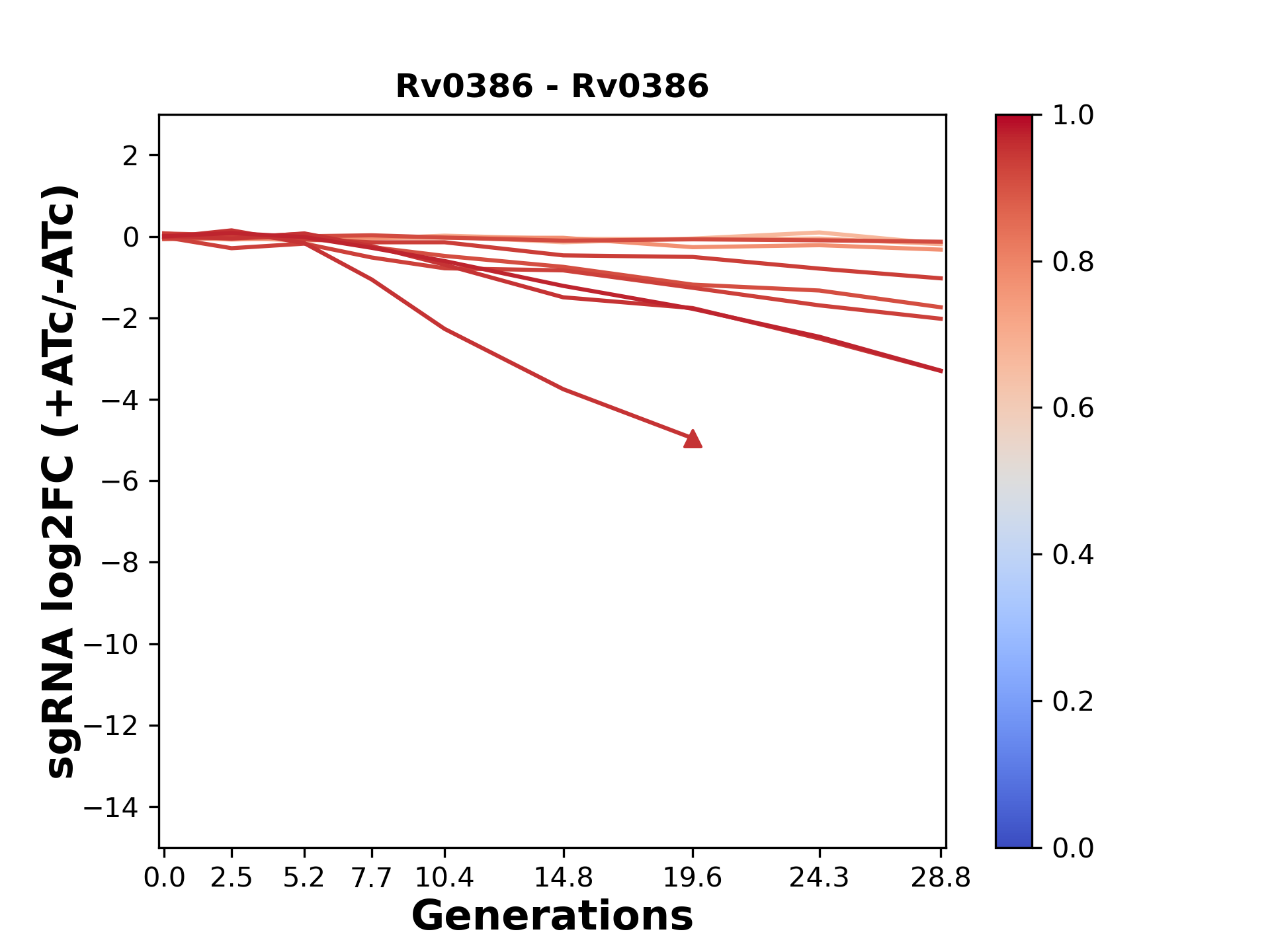 Here, we show sgRNA log2 fold-change values (L2FC) (plus versus minus ATc) over consecutive generations for sgRNAs targeting the gene you selected.