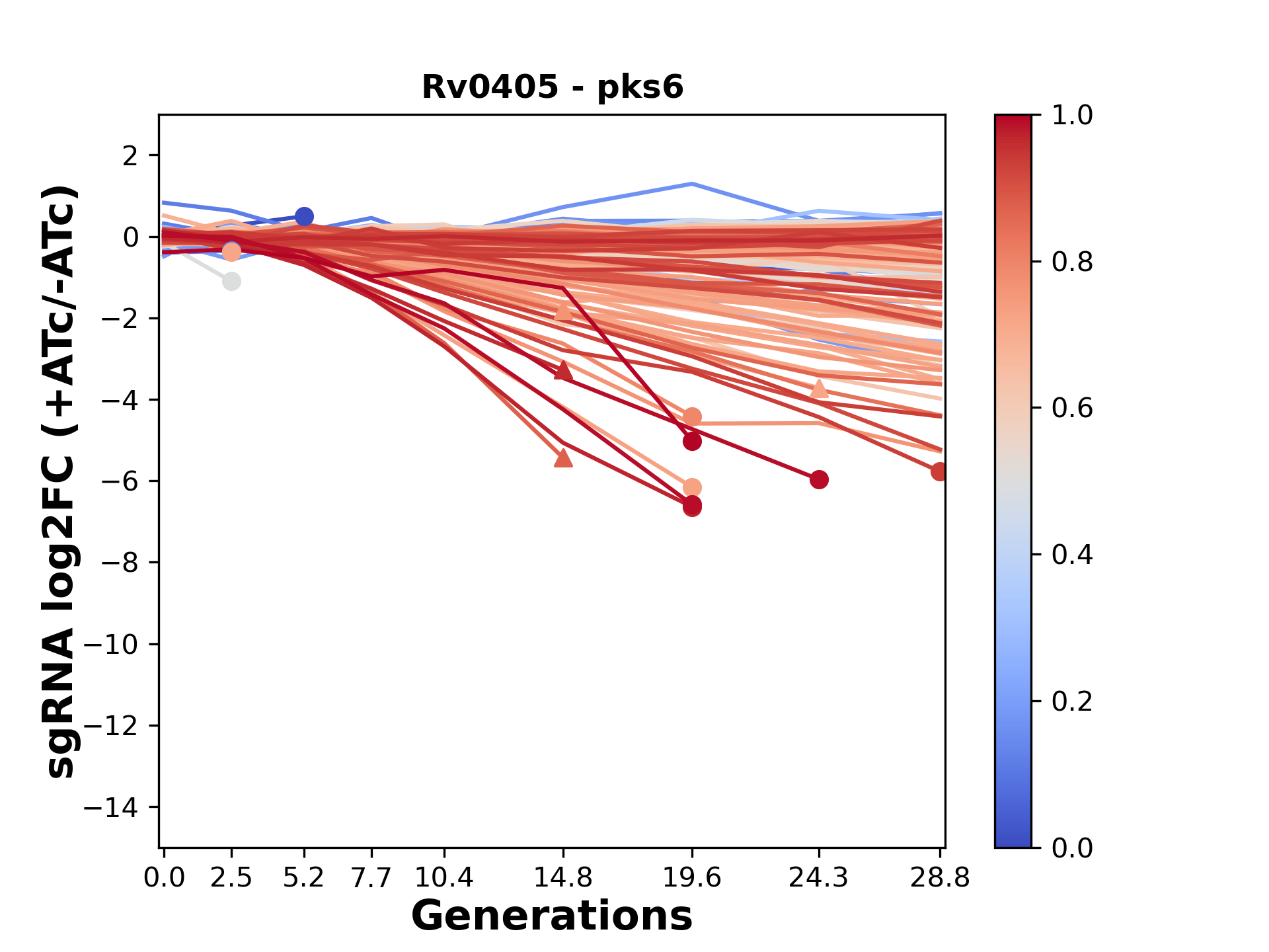 Here, we show sgRNA log2 fold-change values (L2FC) (plus versus minus ATc) over consecutive generations for sgRNAs targeting the gene you selected.