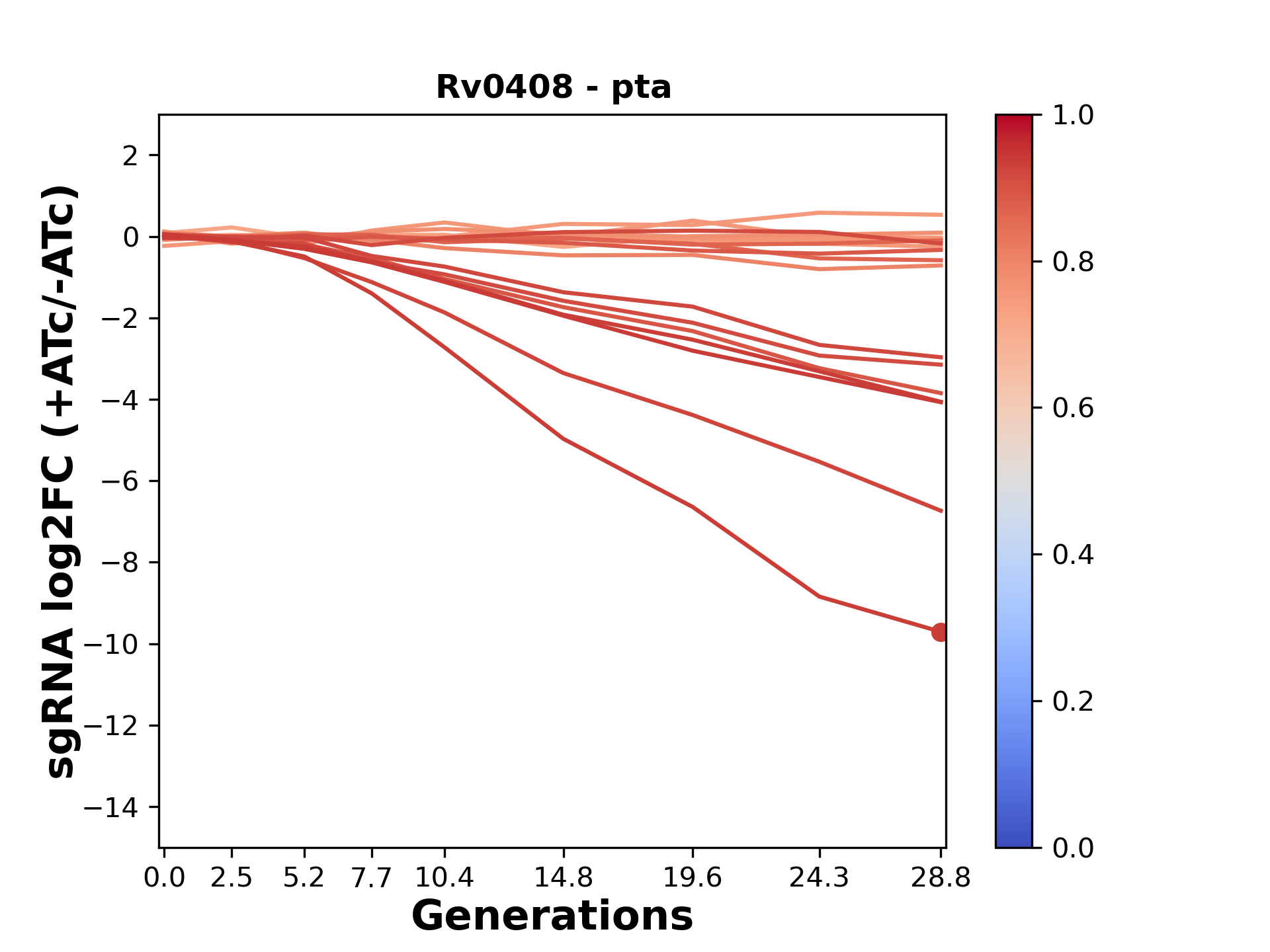 Here, we show sgRNA log2 fold-change values (L2FC) (plus versus minus ATc) over consecutive generations for sgRNAs targeting the gene you selected.