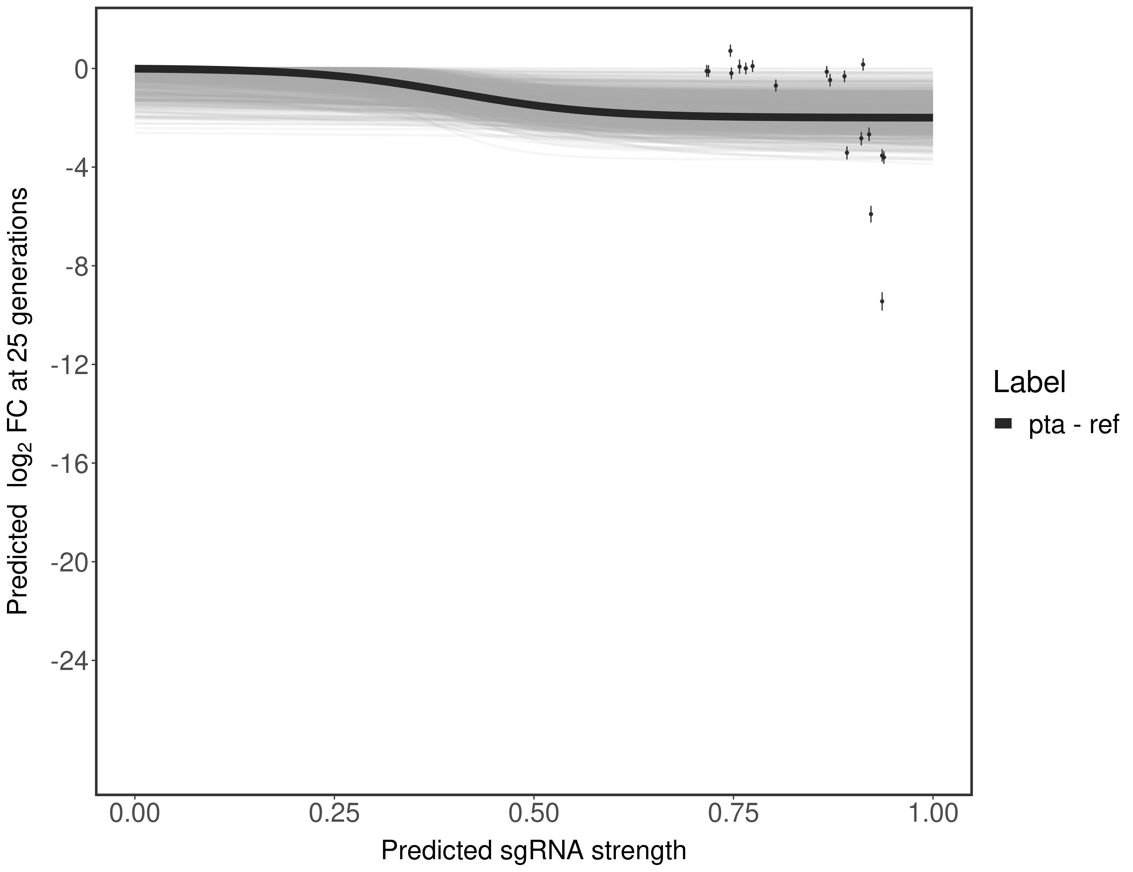 In order to quantify gene vulnerability, data were subsequently analyzed with a hierarchical model at the sgRNA level (two-line model) and gene level (Hill curve). The vulnerability quantification is shown below. [More information]
