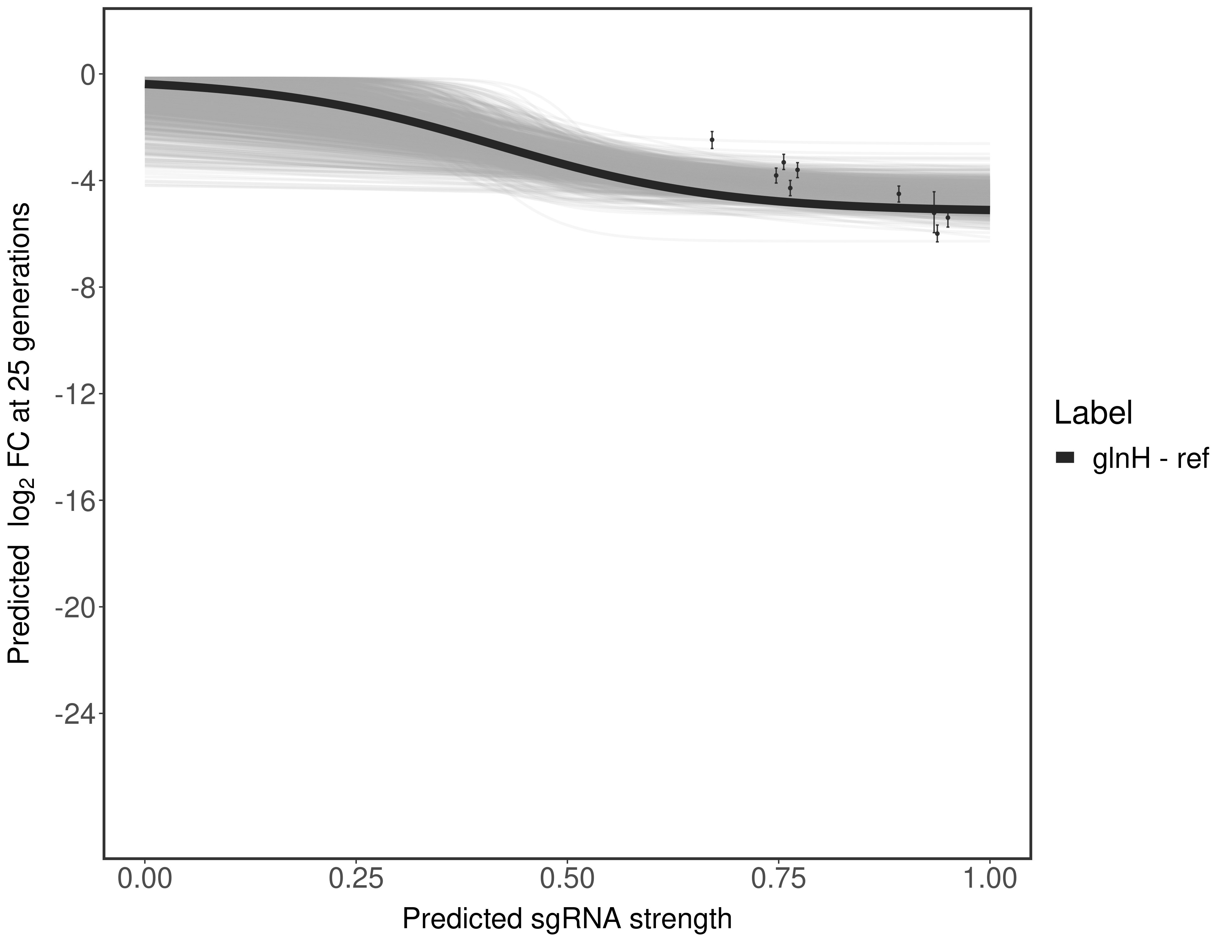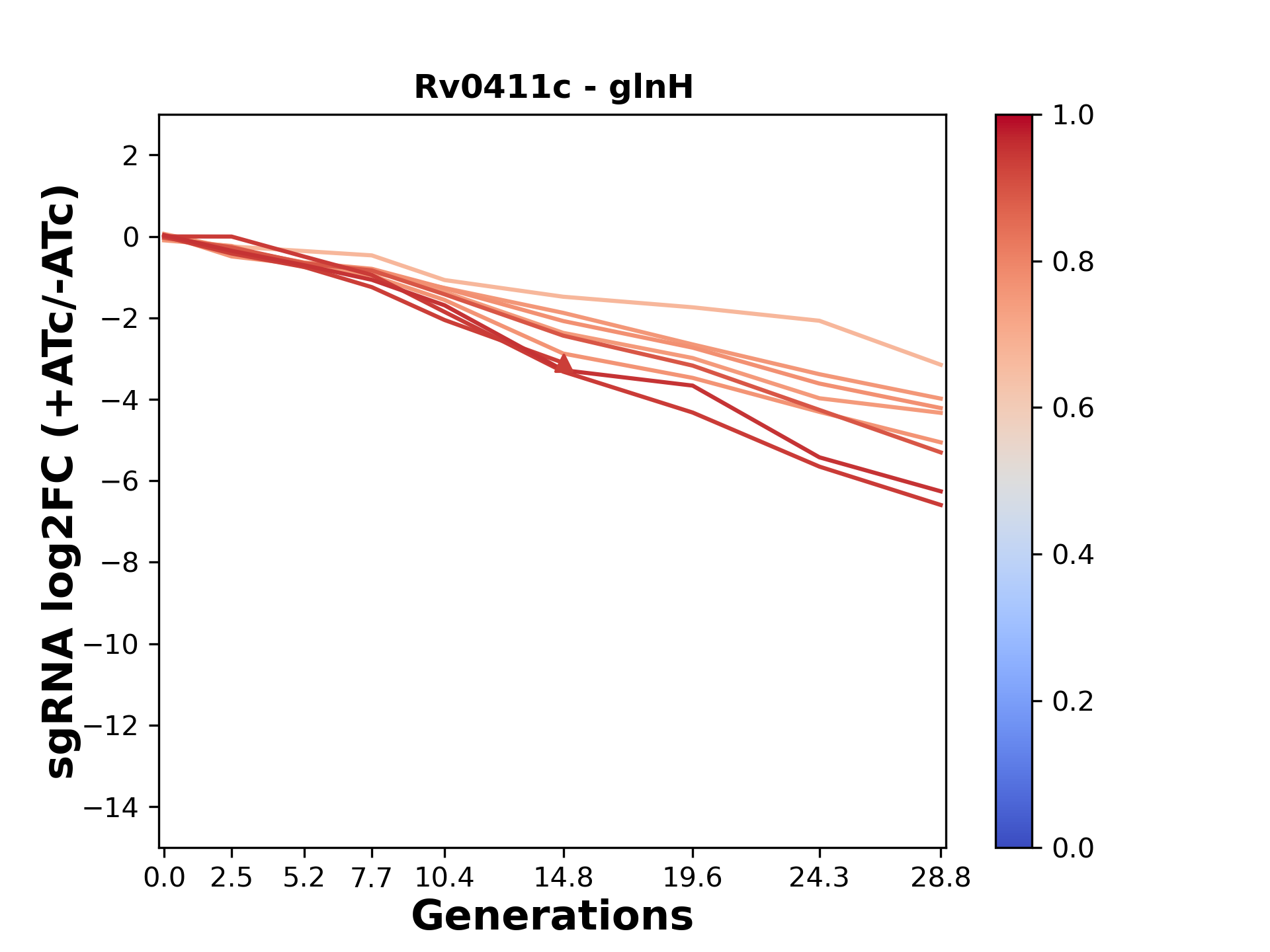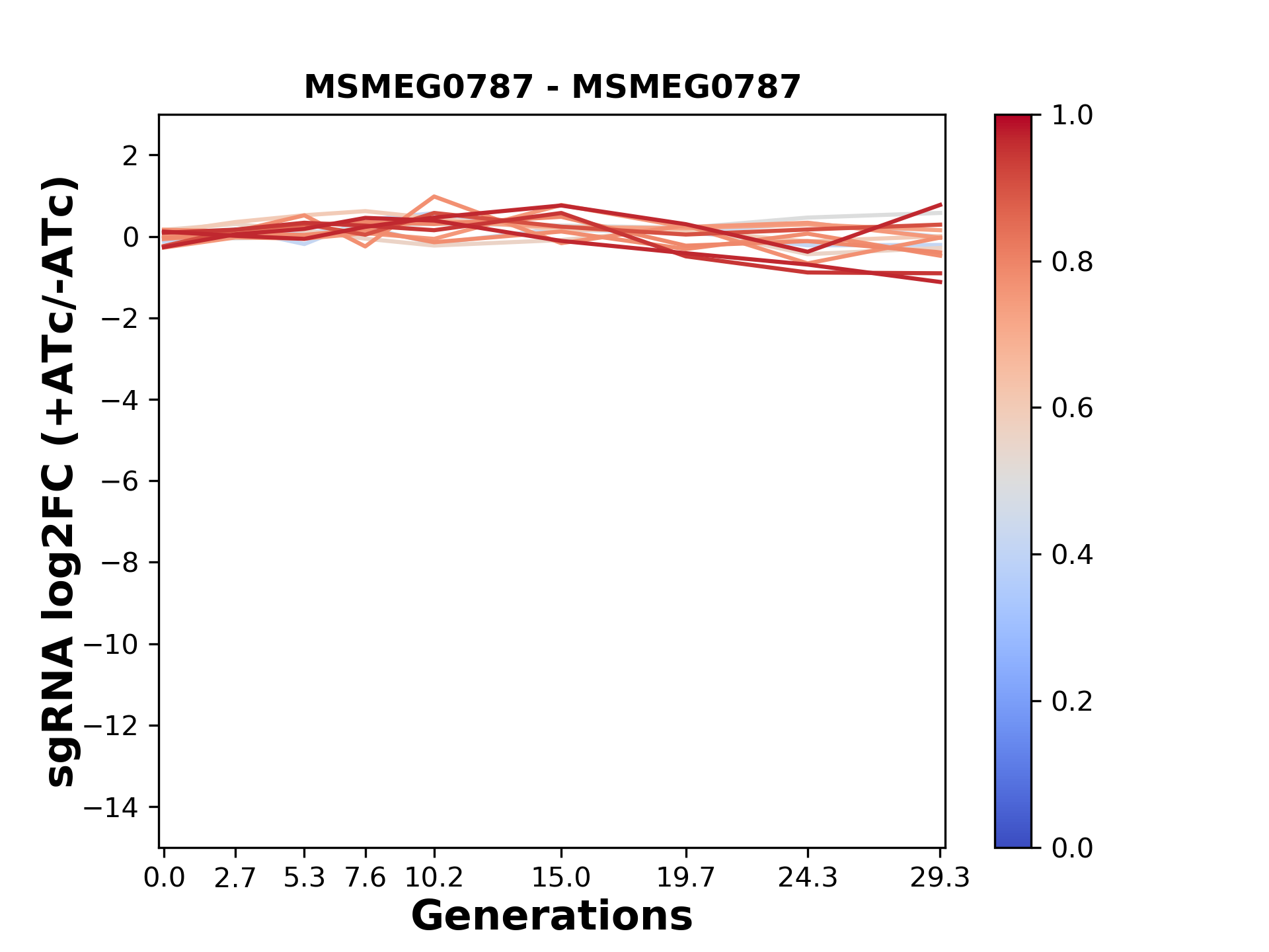 Here, we show sgRNA log2 fold-change values (L2FC) (plus versus minus ATc) over consecutive generations for sgRNAs targeting the gene you selected.