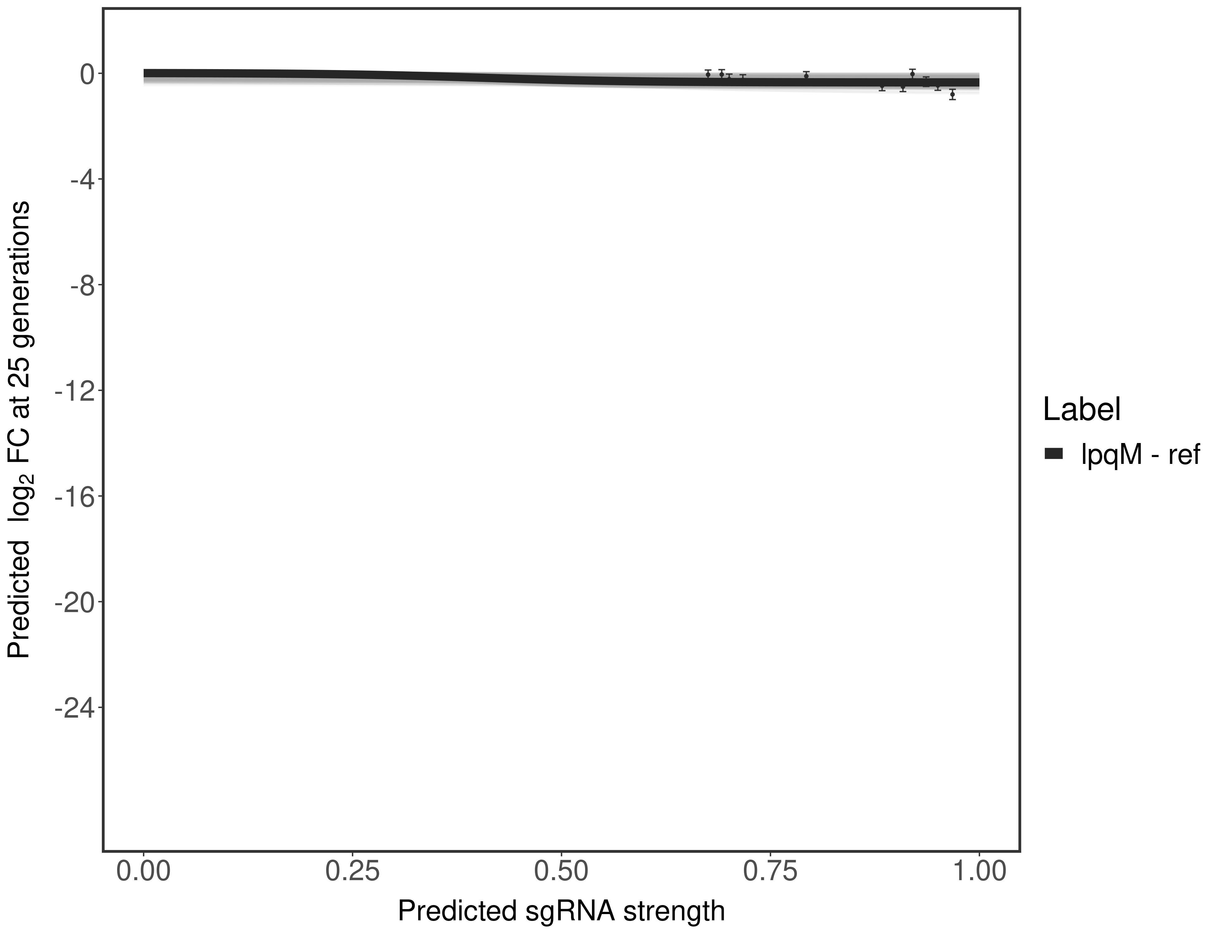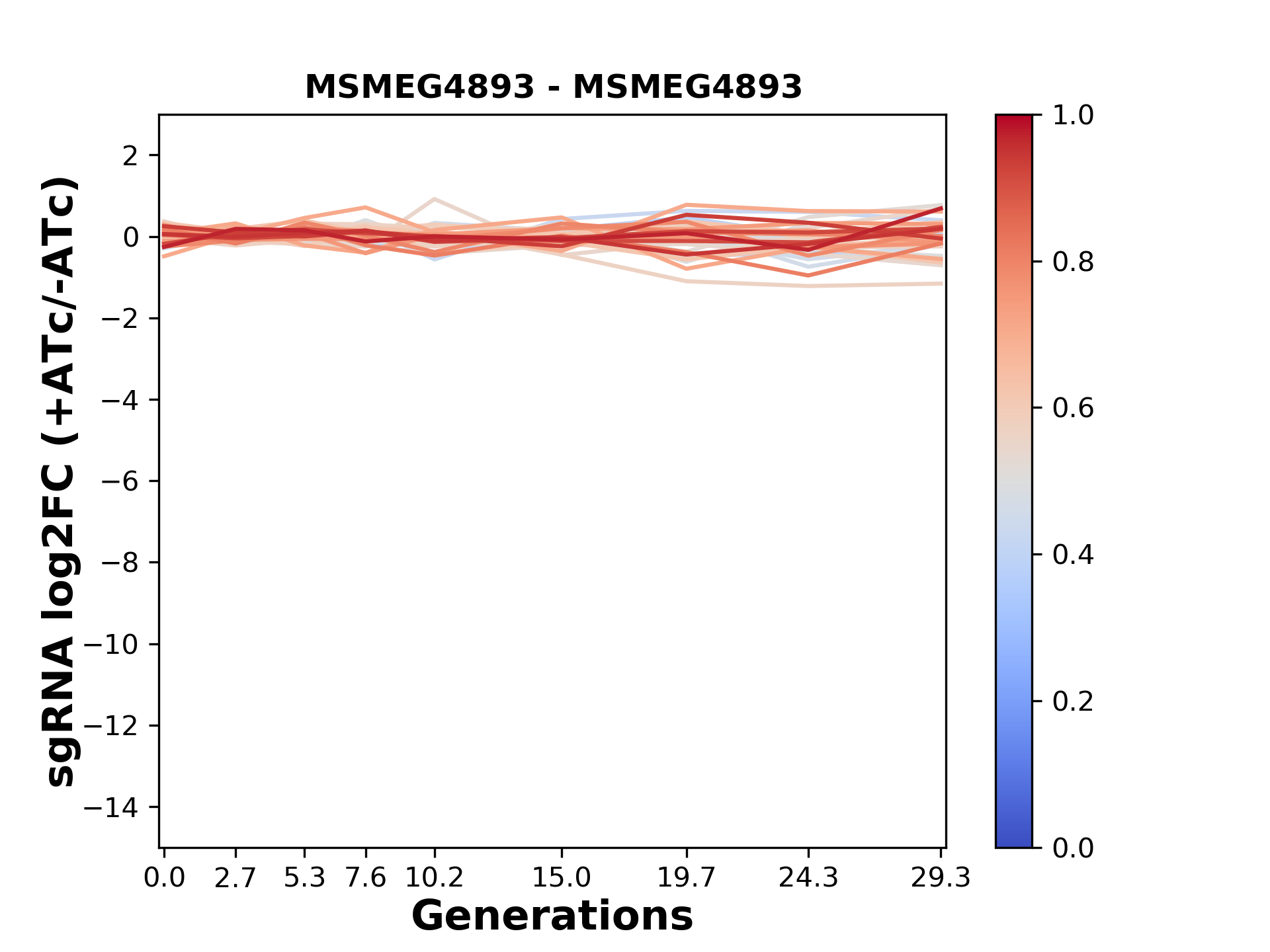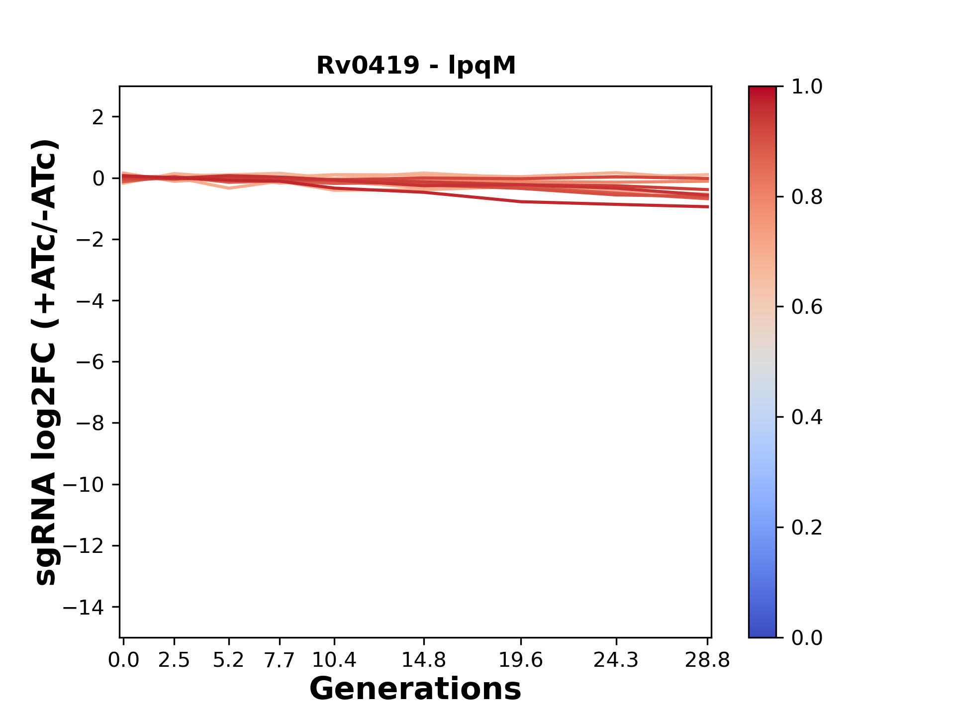 Experiment: We designed an M. tuberculosis CRISPRi library (RLC12) to target all annotated Mtb genes with single guide RNAs (sgRNAs) of varying predicted knockdown efficiencies. In parallel, we constructed a M. smegmatis CRISPRi library (RLC11) to target all annotated Msmeg genes, similar to the Mtb sgRNA library. RLC12 was transformed into M. tuberculosis H37Rv; RLC11 into M. smegmatis mc2-155. We passaged both CRISPRi libraries for nearly 30 generations in the presence or absence of the CRISPRi-inducer anhydrotetracycline (ATc). At the indicated timepoints, genomic DNA was harvested and the representation of individual sgRNAs was counted using Illumina sequencing. Here, we show sgRNA log2 fold-change values (L2FC) (plus versus minus ATc) over consecutive generations for sgRNAs targeting the gene you selected. sgRNAs are color-coded based on their predicted strength from blue (strength=0; weak) to red (strength=1; strong).