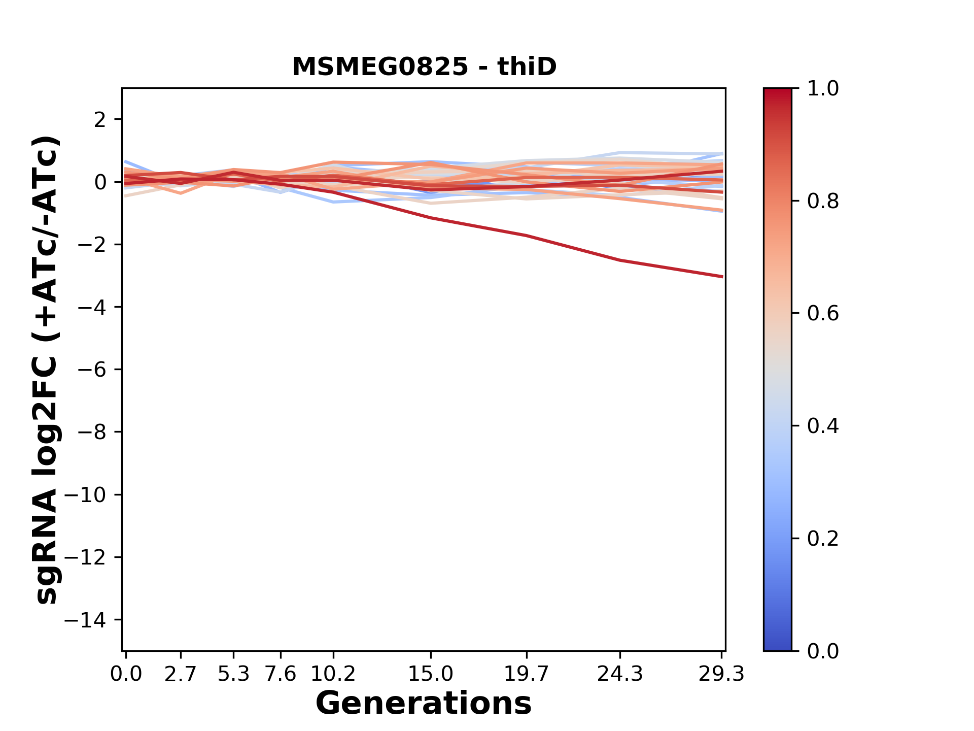 Here, we show sgRNA log2 fold-change values (L2FC) (plus versus minus ATc) over consecutive generations for sgRNAs targeting the gene you selected.