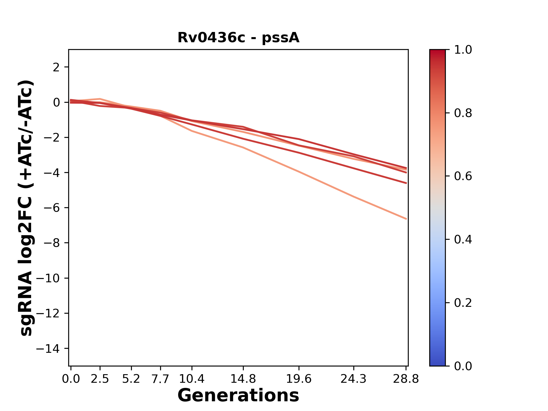 Here, we show sgRNA log2 fold-change values (L2FC) (plus versus minus ATc) over consecutive generations for sgRNAs targeting the gene you selected.