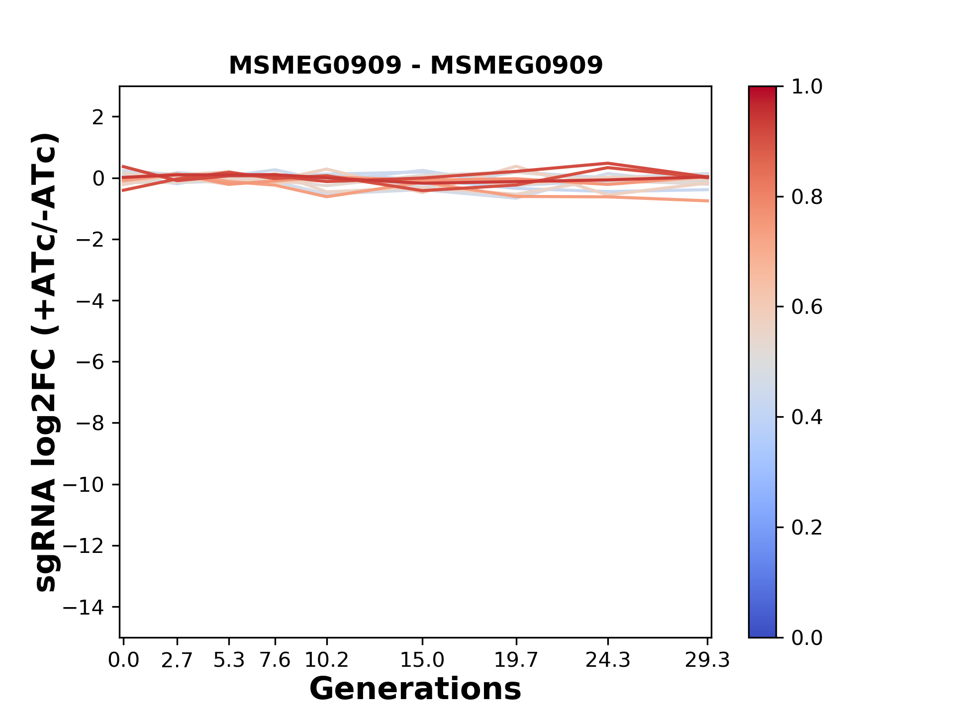 Experiment: We designed an M. tuberculosis CRISPRi library (RLC12) to target all annotated Mtb genes with single guide RNAs (sgRNAs) of varying predicted knockdown efficiencies. In parallel, we constructed a M. smegmatis CRISPRi library (RLC11) to target all annotated Msmeg genes, similar to the Mtb sgRNA library. RLC12 was transformed into M. tuberculosis H37Rv; RLC11 into M. smegmatis mc2-155. We passaged both CRISPRi libraries for nearly 30 generations in the presence or absence of the CRISPRi-inducer anhydrotetracycline (ATc). At the indicated timepoints, genomic DNA was harvested and the representation of individual sgRNAs was counted using Illumina sequencing. Here, we show sgRNA log2 fold-change values (L2FC) (plus versus minus ATc) over consecutive generations for sgRNAs targeting the gene you selected. sgRNAs are color-coded based on their predicted strength from blue (strength=0; weak) to red (strength=1; strong).