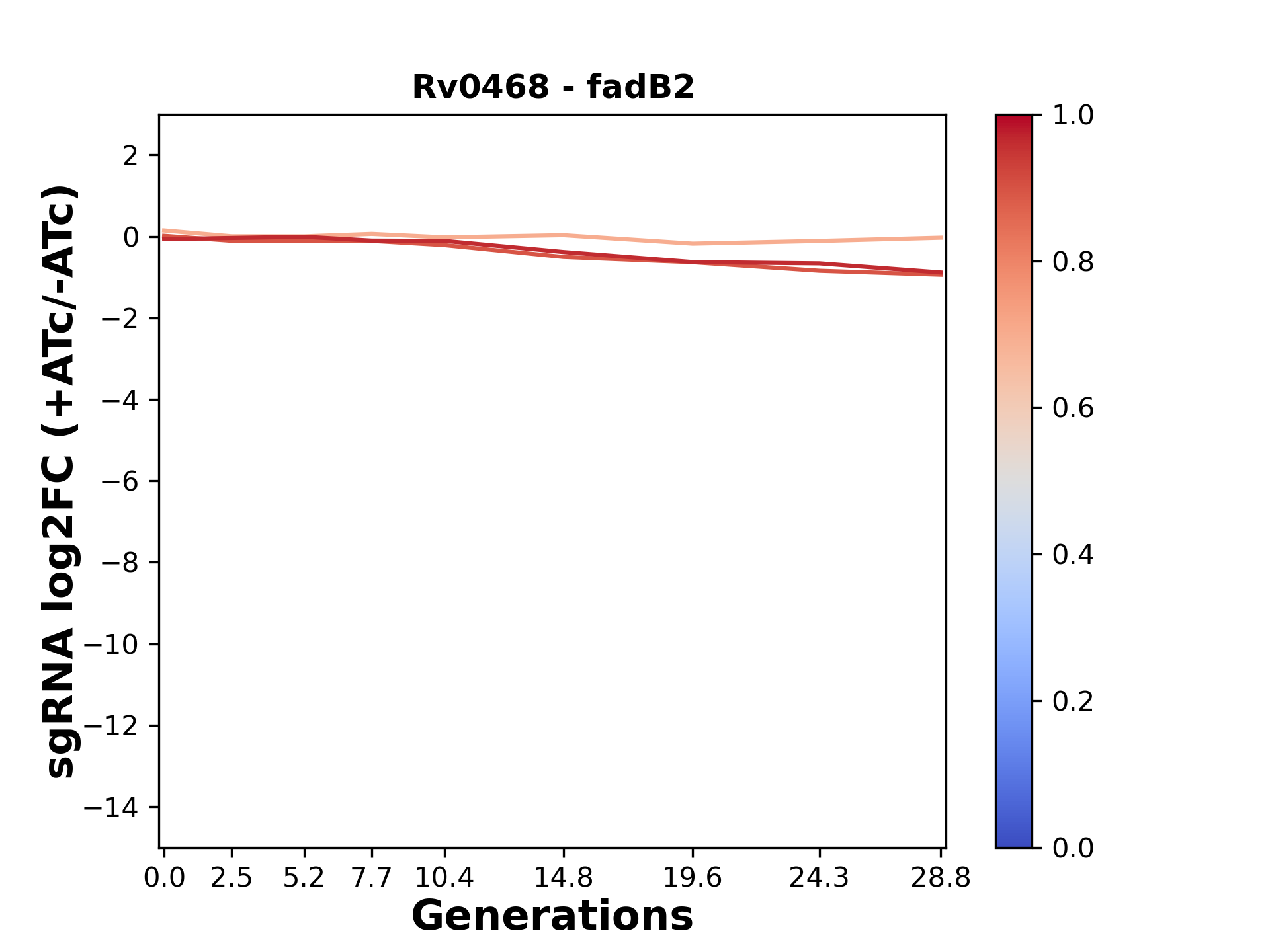 Here, we show sgRNA log2 fold-change values (L2FC) (plus versus minus ATc) over consecutive generations for sgRNAs targeting the gene you selected.