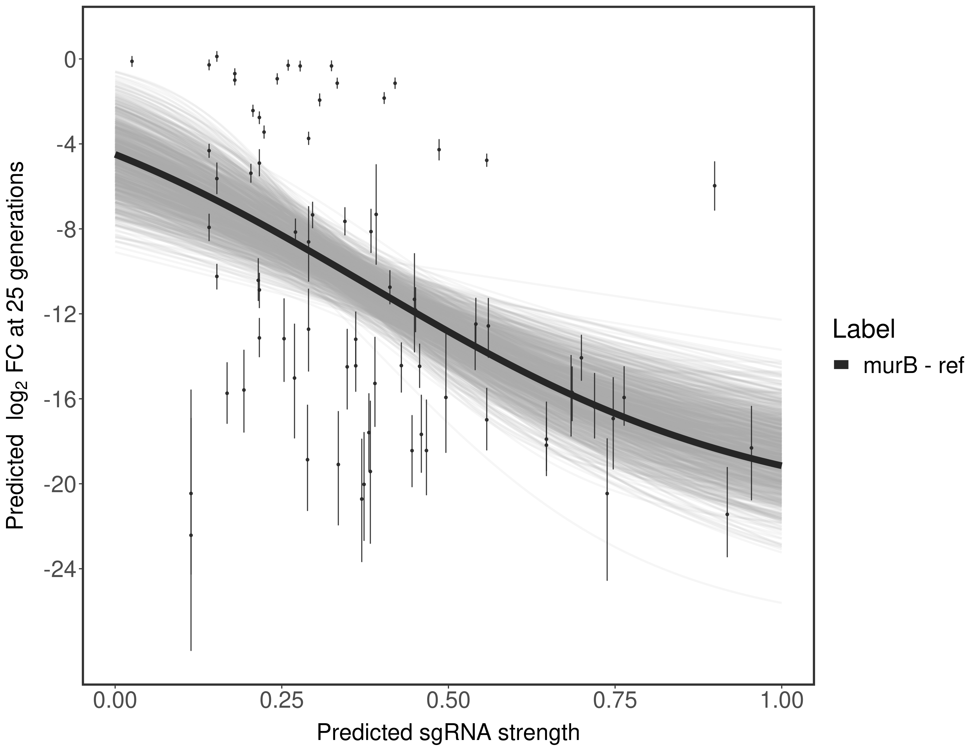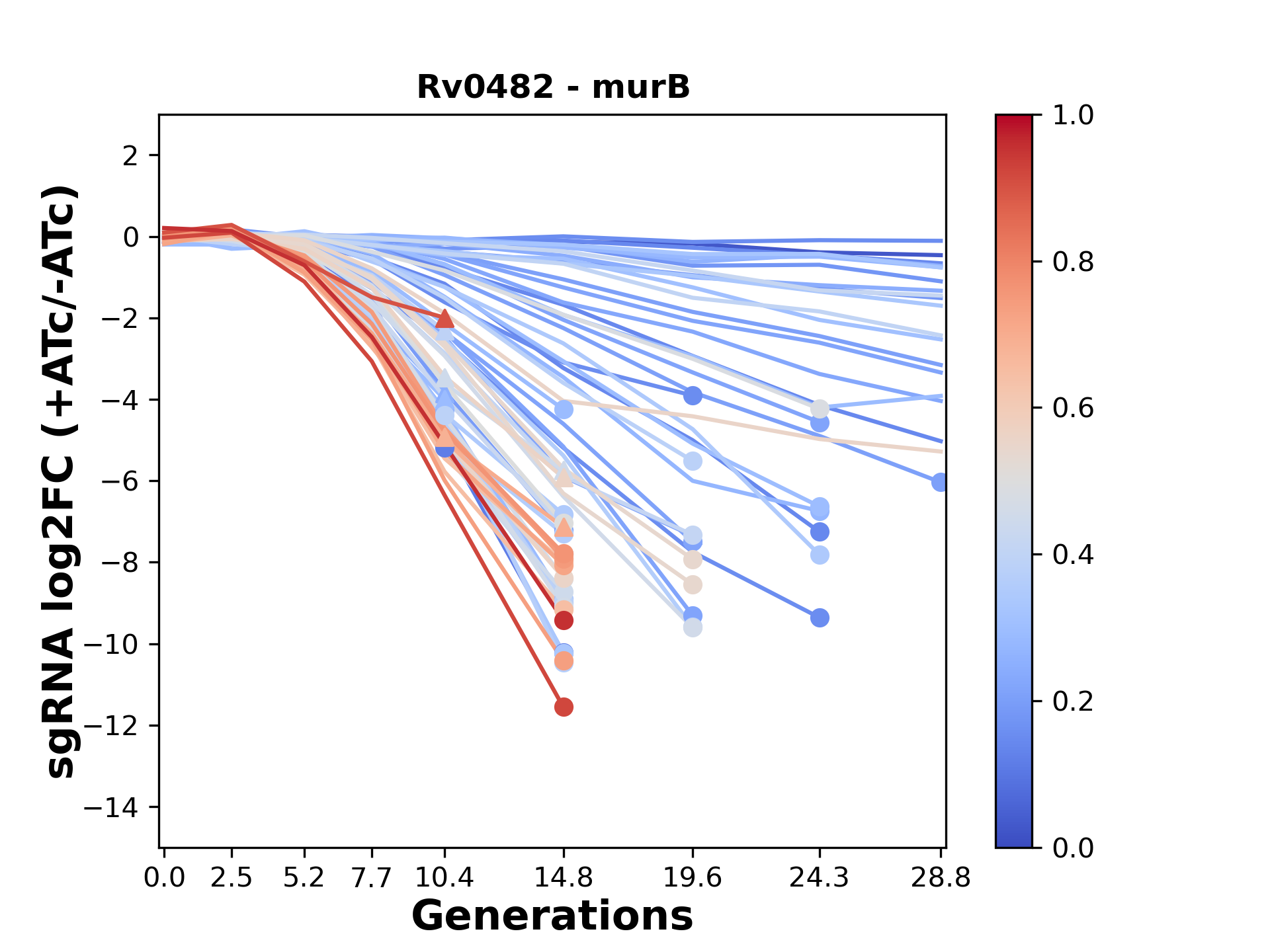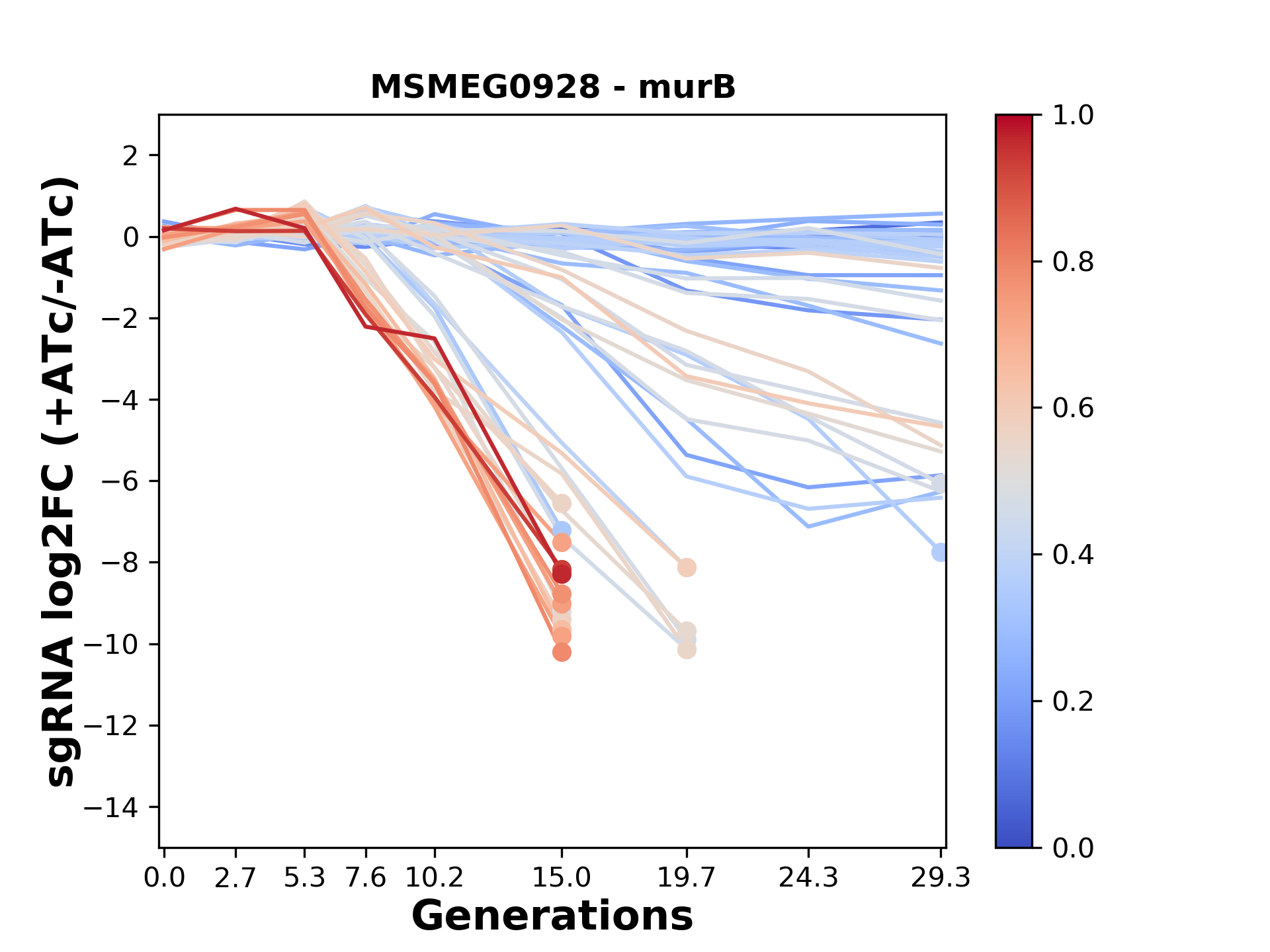 Experiment: We designed an M. tuberculosis CRISPRi library (RLC12) to target all annotated Mtb genes with single guide RNAs (sgRNAs) of varying predicted knockdown efficiencies. In parallel, we constructed a M. smegmatis CRISPRi library (RLC11) to target all annotated Msmeg genes, similar to the Mtb sgRNA library. RLC12 was transformed into M. tuberculosis H37Rv; RLC11 into M. smegmatis mc2-155. We passaged both CRISPRi libraries for nearly 30 generations in the presence or absence of the CRISPRi-inducer anhydrotetracycline (ATc). At the indicated timepoints, genomic DNA was harvested and the representation of individual sgRNAs was counted using Illumina sequencing. Here, we show sgRNA log2 fold-change values (L2FC) (plus versus minus ATc) over consecutive generations for sgRNAs targeting the gene you selected. sgRNAs are color-coded based on their predicted strength from blue (strength=0; weak) to red (strength=1; strong).