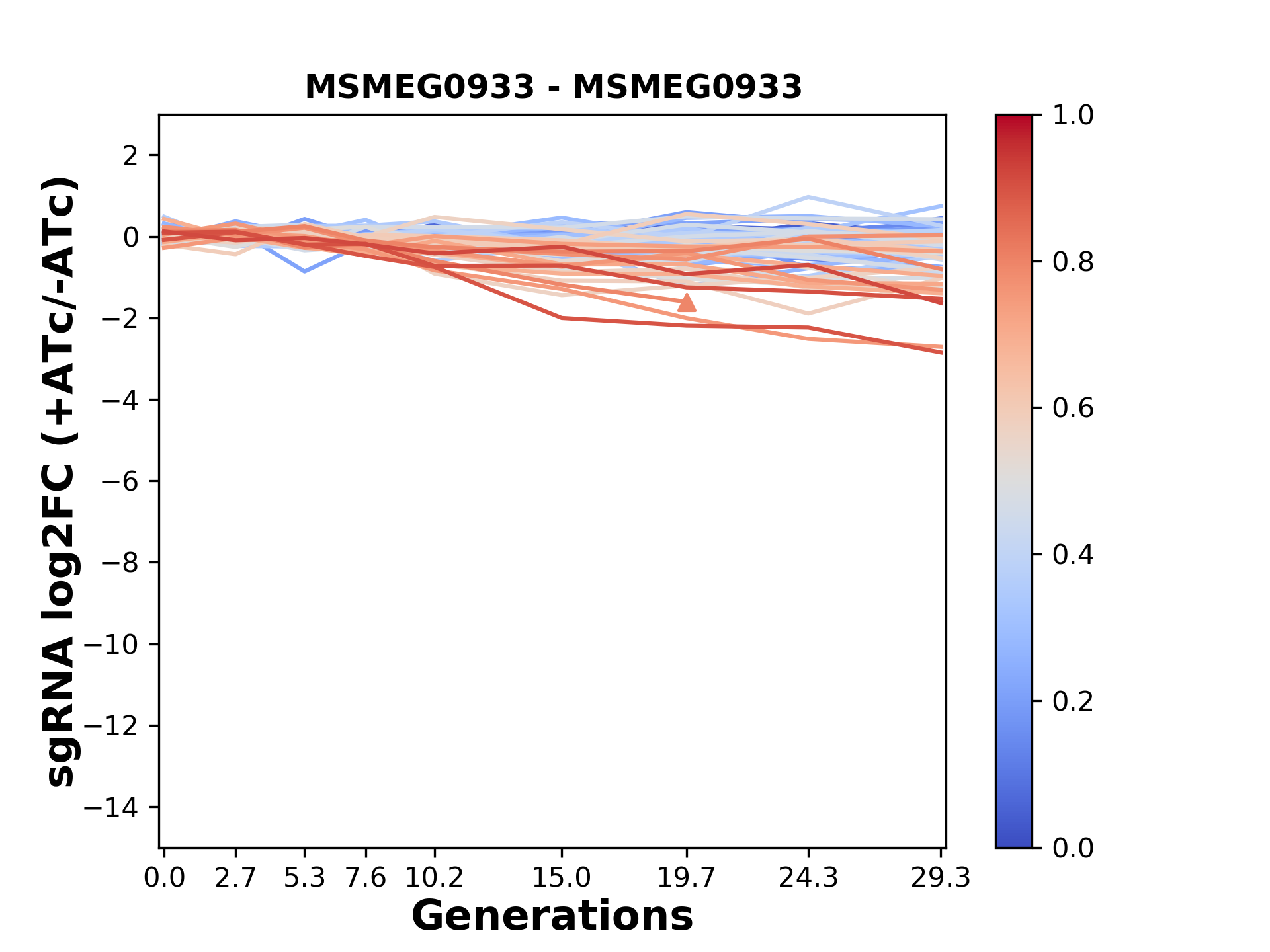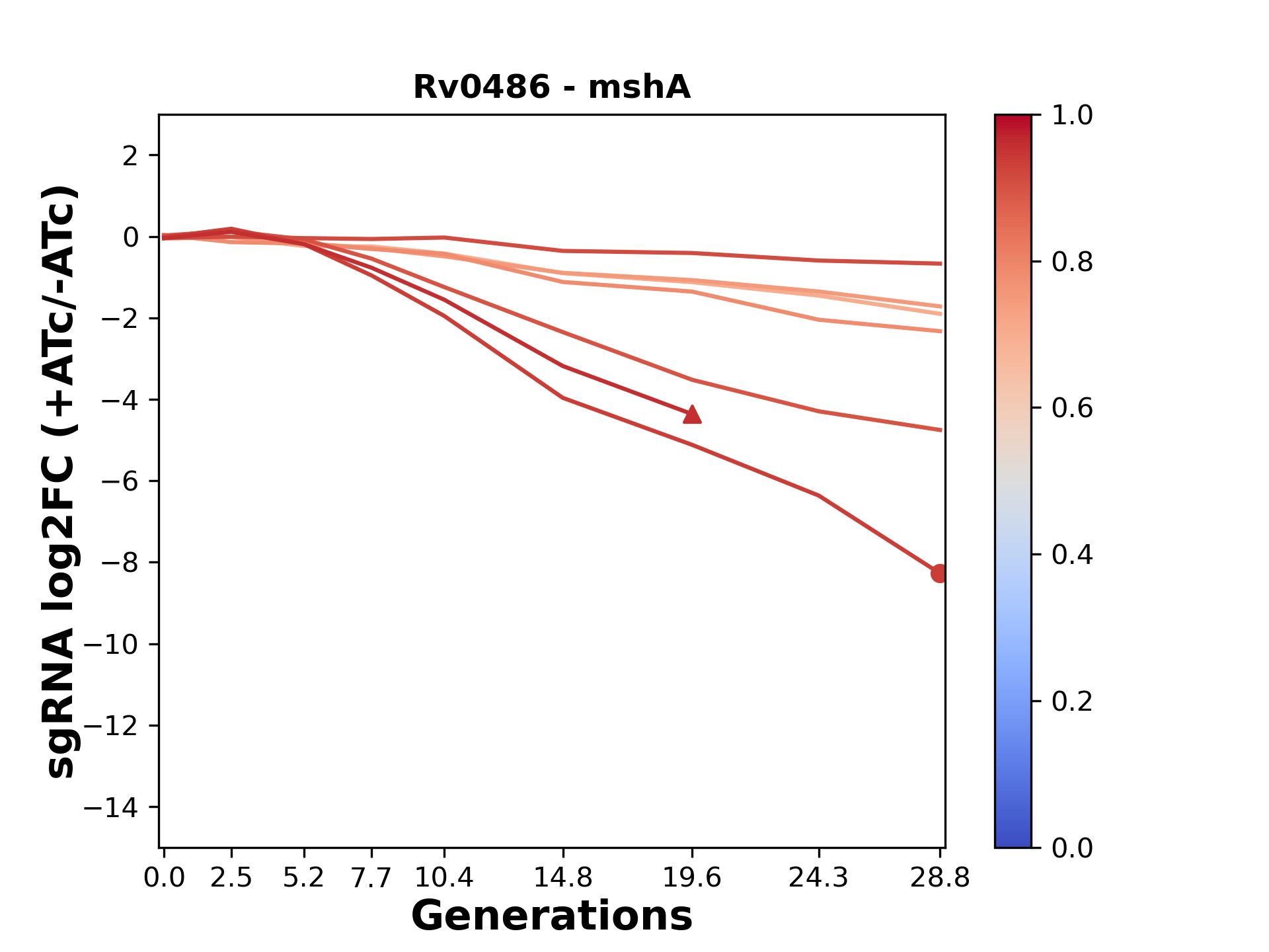 Here, we show sgRNA log2 fold-change values (L2FC) (plus versus minus ATc) over consecutive generations for sgRNAs targeting the gene you selected.