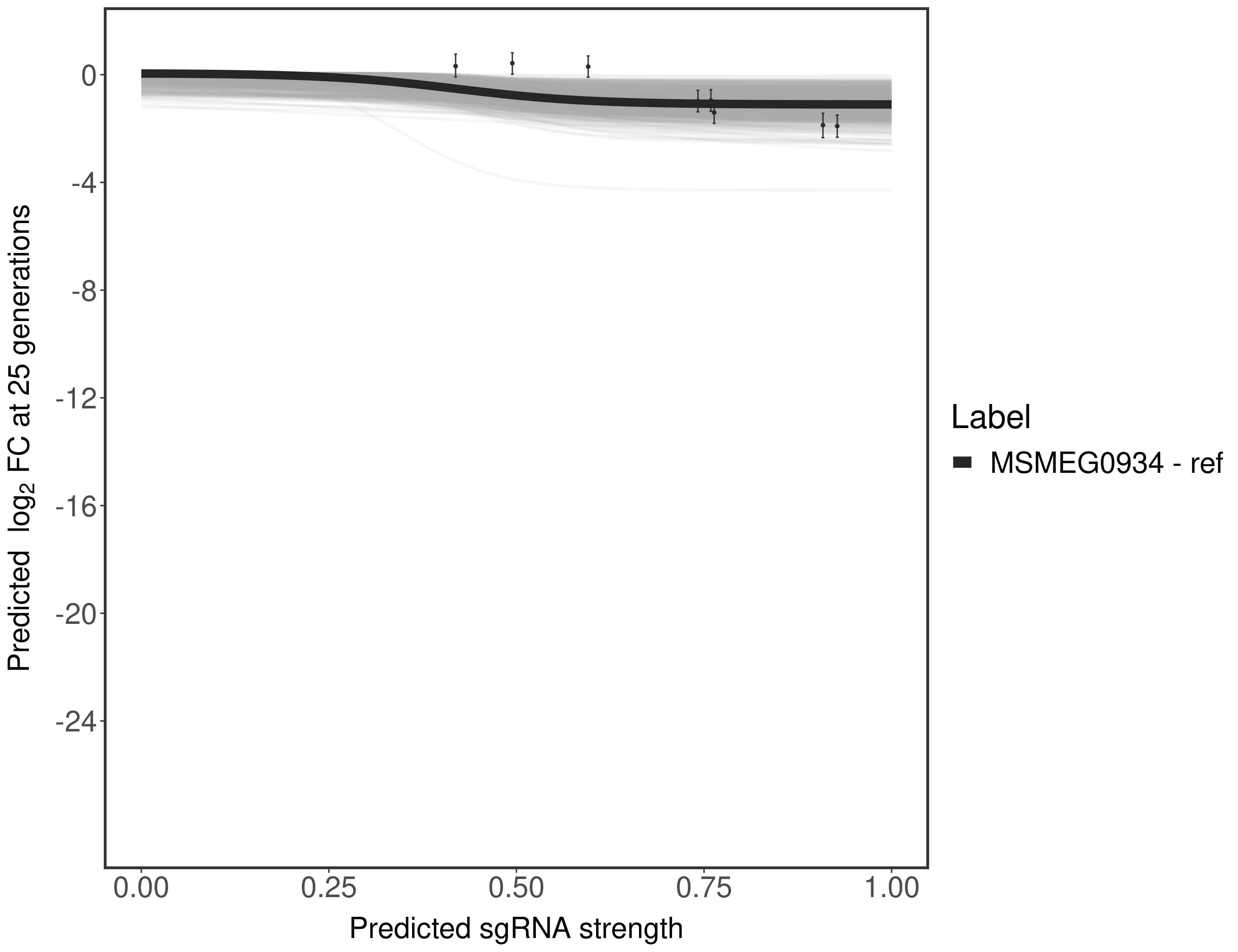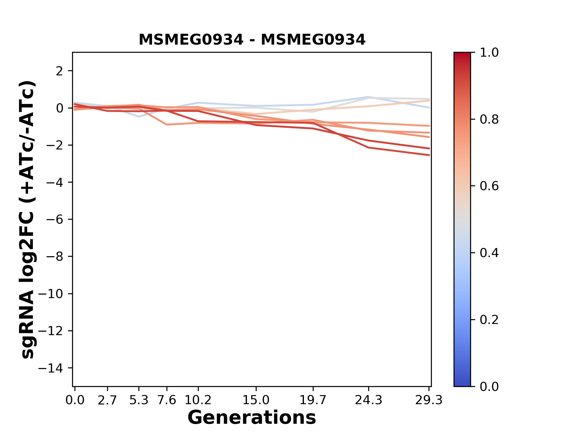 Here, we show sgRNA log2 fold-change values (L2FC) (plus versus minus ATc) over consecutive generations for sgRNAs targeting the gene you selected.